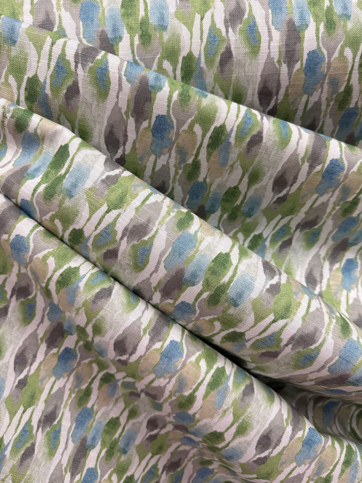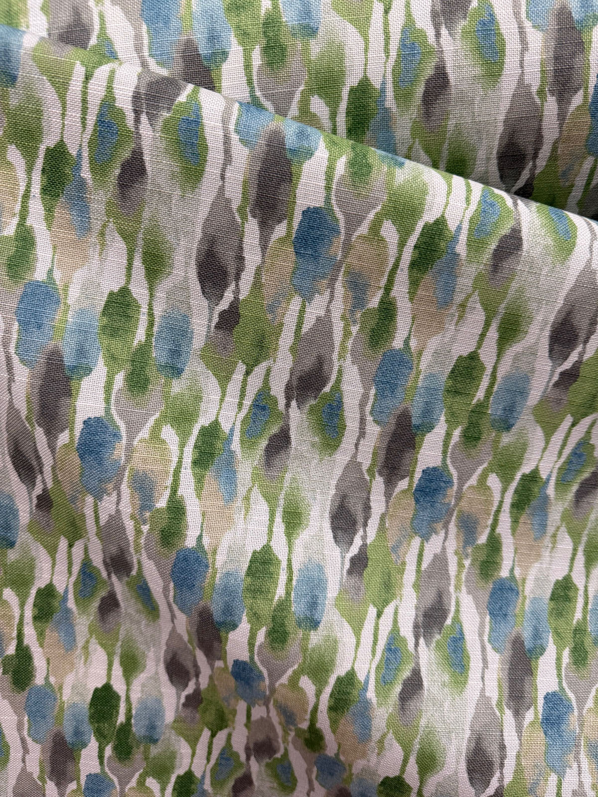 Waterfalls-Meadow is a Colorful Raindrop Pattern in blue green and grey colors, 54" wide, 100% Slubbed Cotton, Repeats: V=8.25" H=6.125", Double Rubs: 24,000