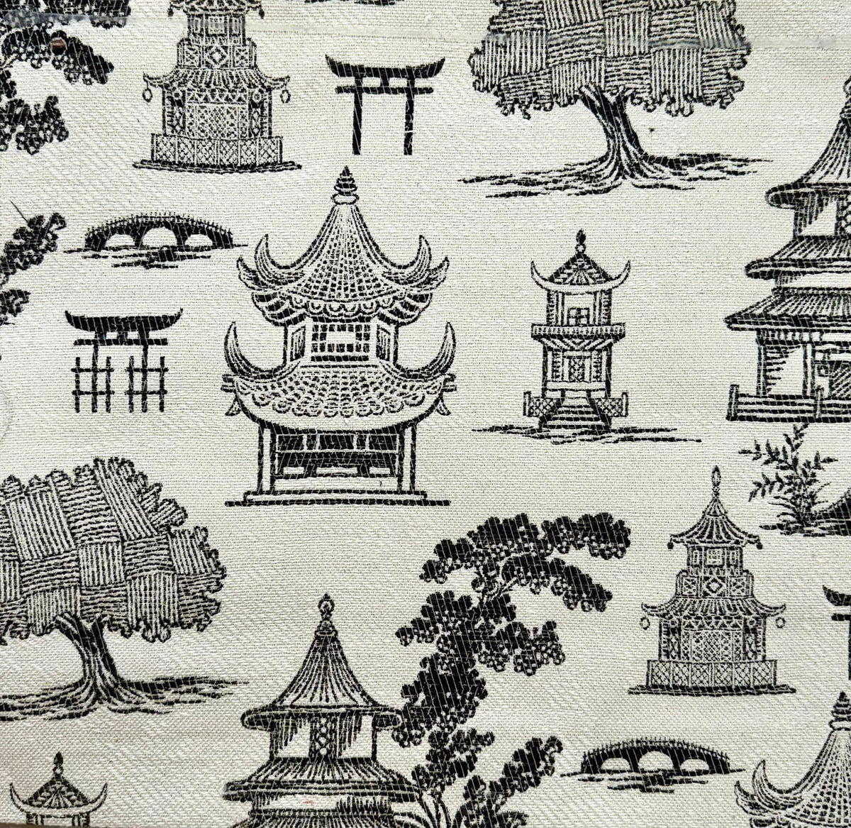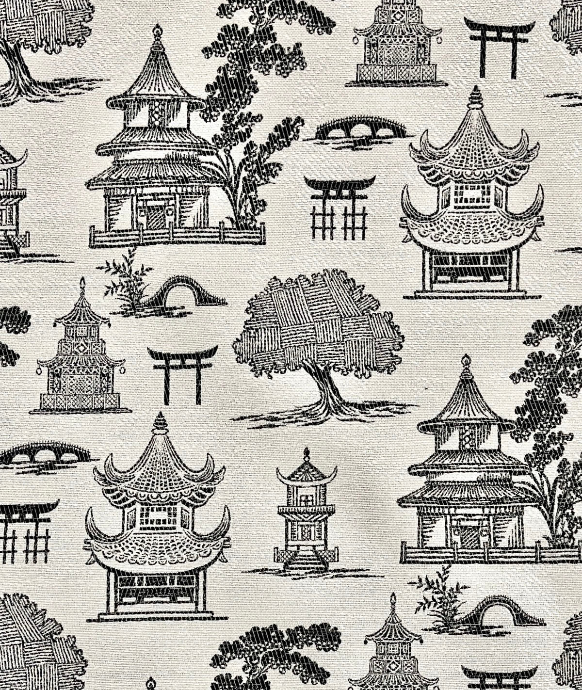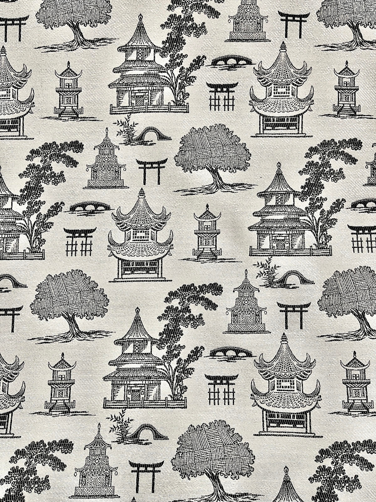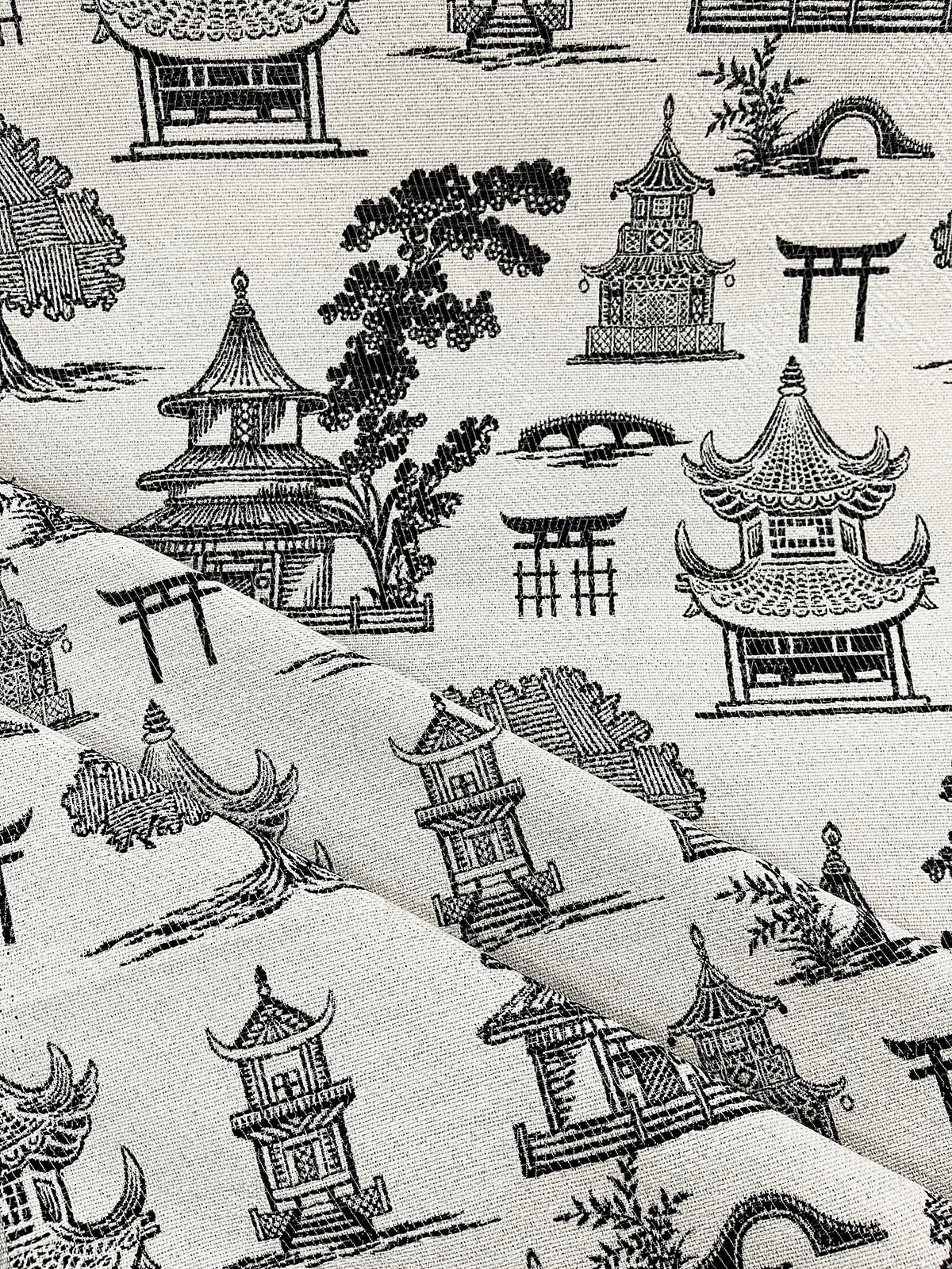 R-Solace Blackstone is a Black and White Woven Asian Pagoda, 54" Wide, 70% Polyester, 30% Rayon, 35% Cotton, 20% Polyester, Repeats: H=.000" V=1.250" 82,000 Double Rubs Double Rubs: 15,000+