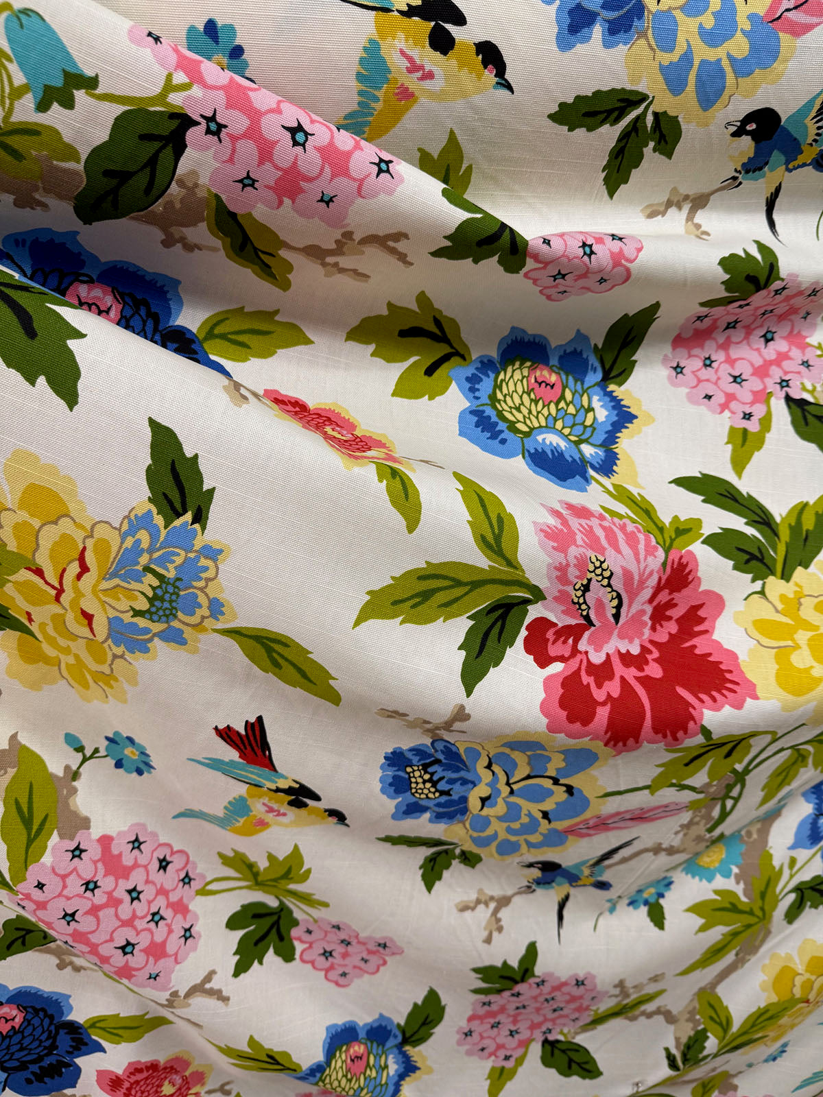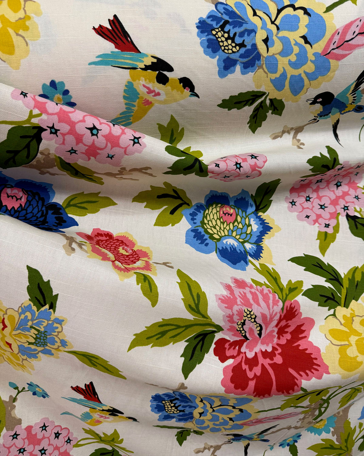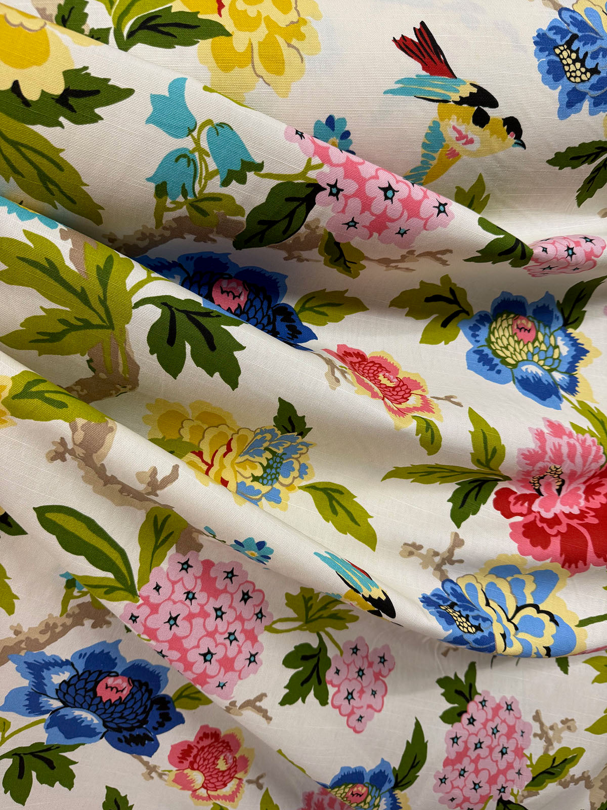 Celeste in color Spring is a Floral & Bird Print, 54" wide, 100% Cotton, Repeats: V=25.25" H=27", Double Rubs: 51,000