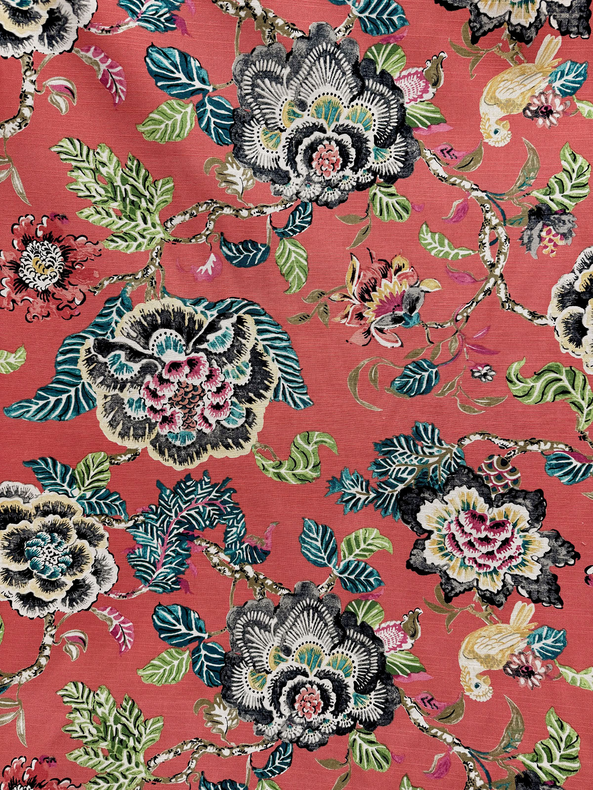 Jacobean Floral with Bird, 54" Wide, 100% Cotton, Repeats: H=27" V=25.25, Double Rubs: 24,000. CAL TB 117-2013