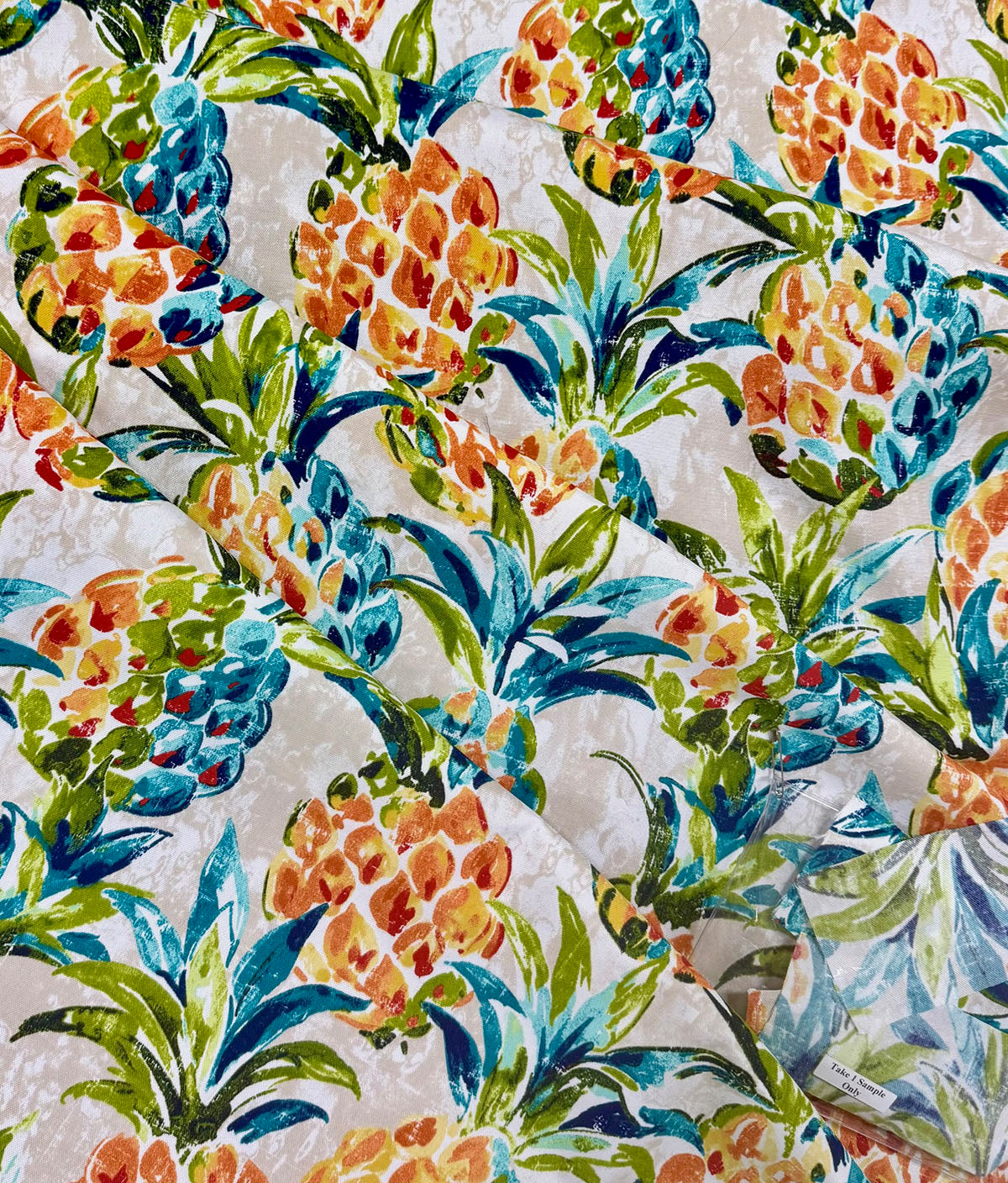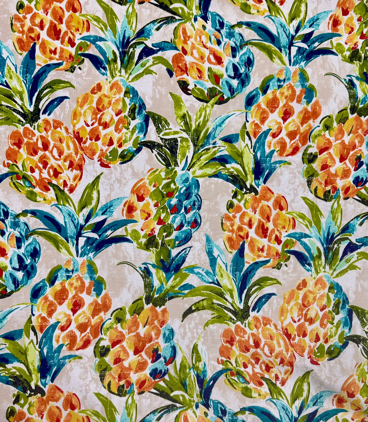 Pina Colada in the color Palmetto is an Outdoor Pineapples 54" wide, 100% Polyester Weather Resistant, Repeat: H=28" V=25", Double Rubs: 15,.000, 500 plus Light Hours
