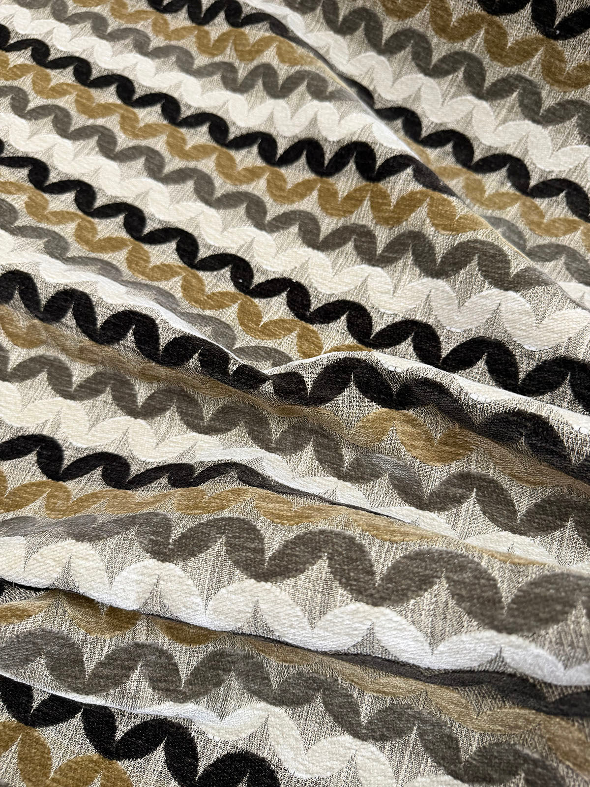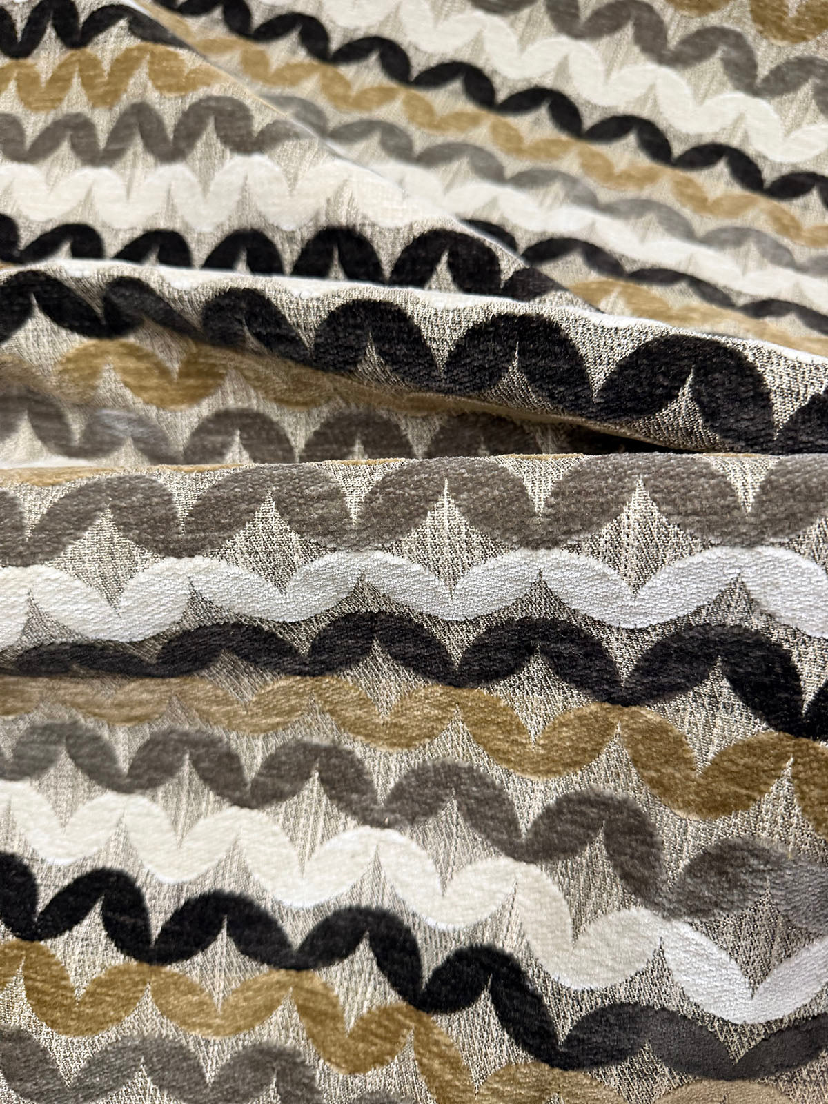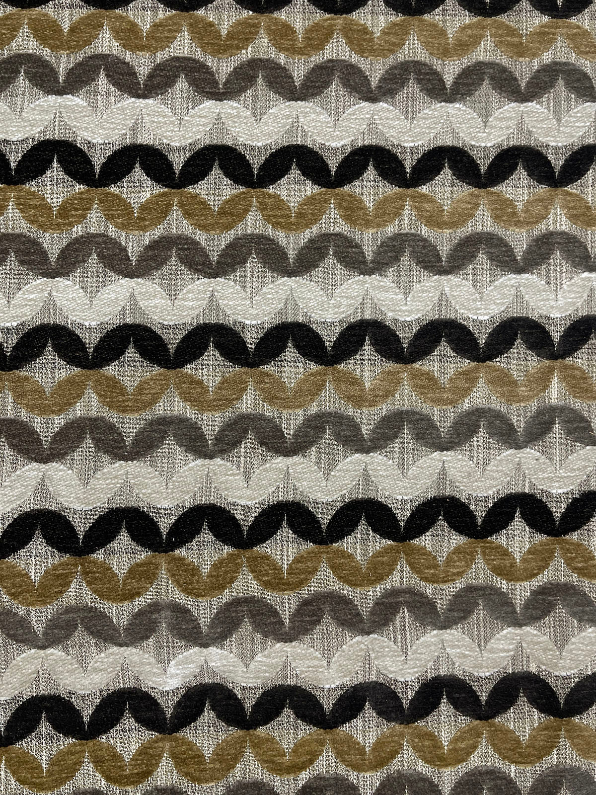 Circles in color Granite is Chenille Striped Circles in black, gold, grey and cream colorway, 54" Wide, Content: Poly Chenille, Repeats: H=2" V=4" Double Rubs: 15,000