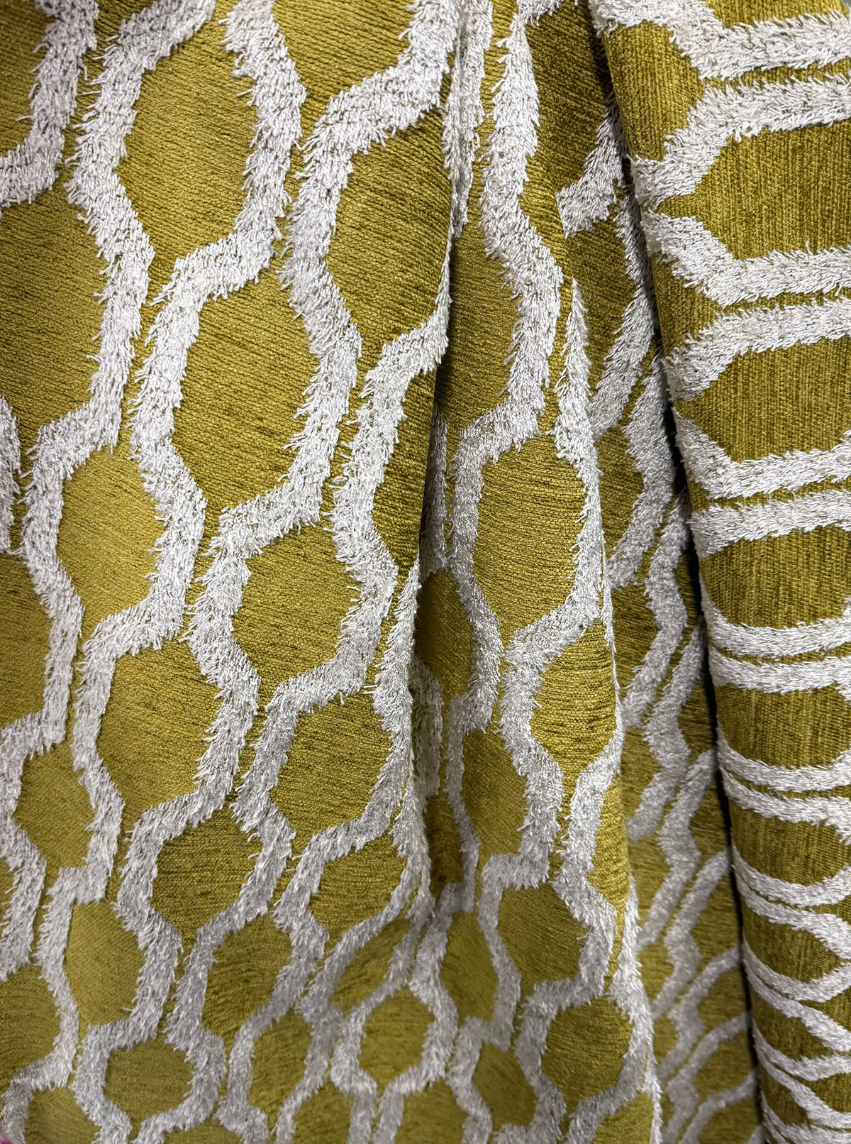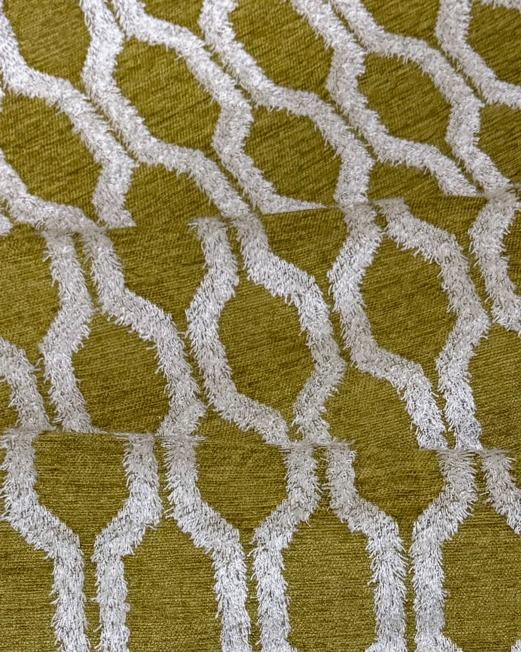 Fringe Benefits in Acid Green is a Chenille Eyelash Lattice by Hillary Farr, 56" wide, 26% Poly 66% Viscose 8% Cotton, Repeats: H=3.5" V=6" Double Rubs: 100,000