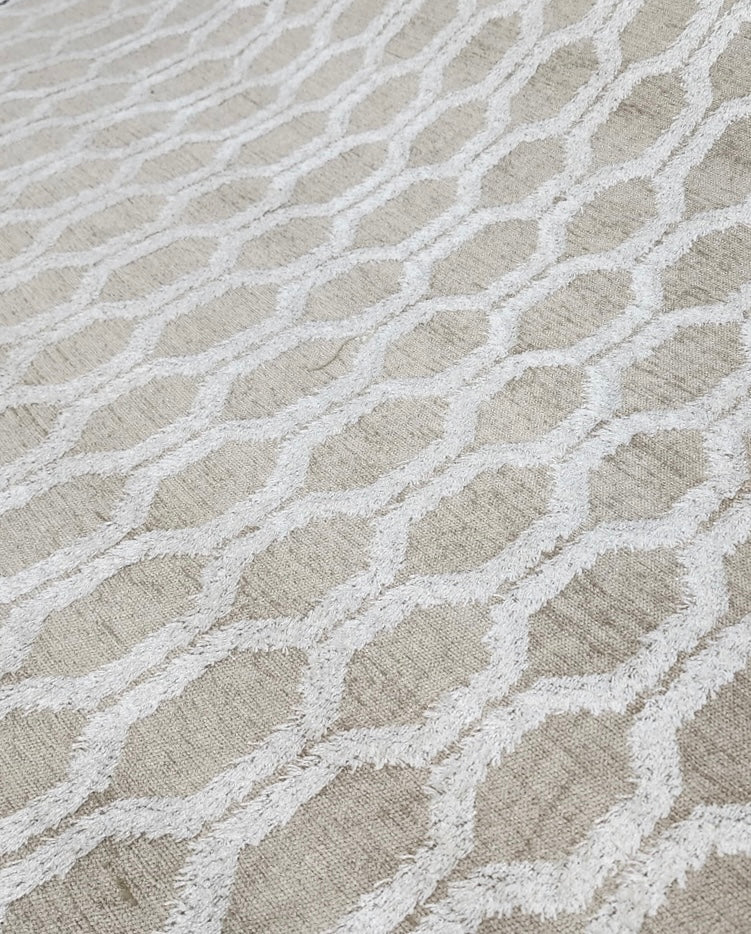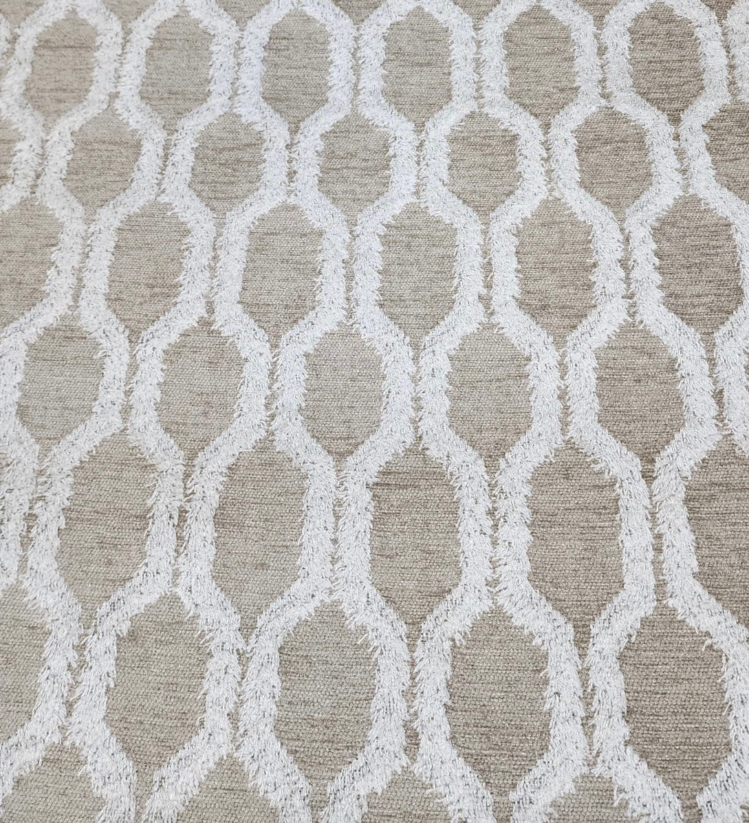 Fringe Benefits in the color Linen is a Chenille Eyelash Lattice by Hillary Farr, 56" wide, 26% Poly 66% Viscose 8% Cotton, Repeats: H=3.5" V=6" Double Rubs: 100,000