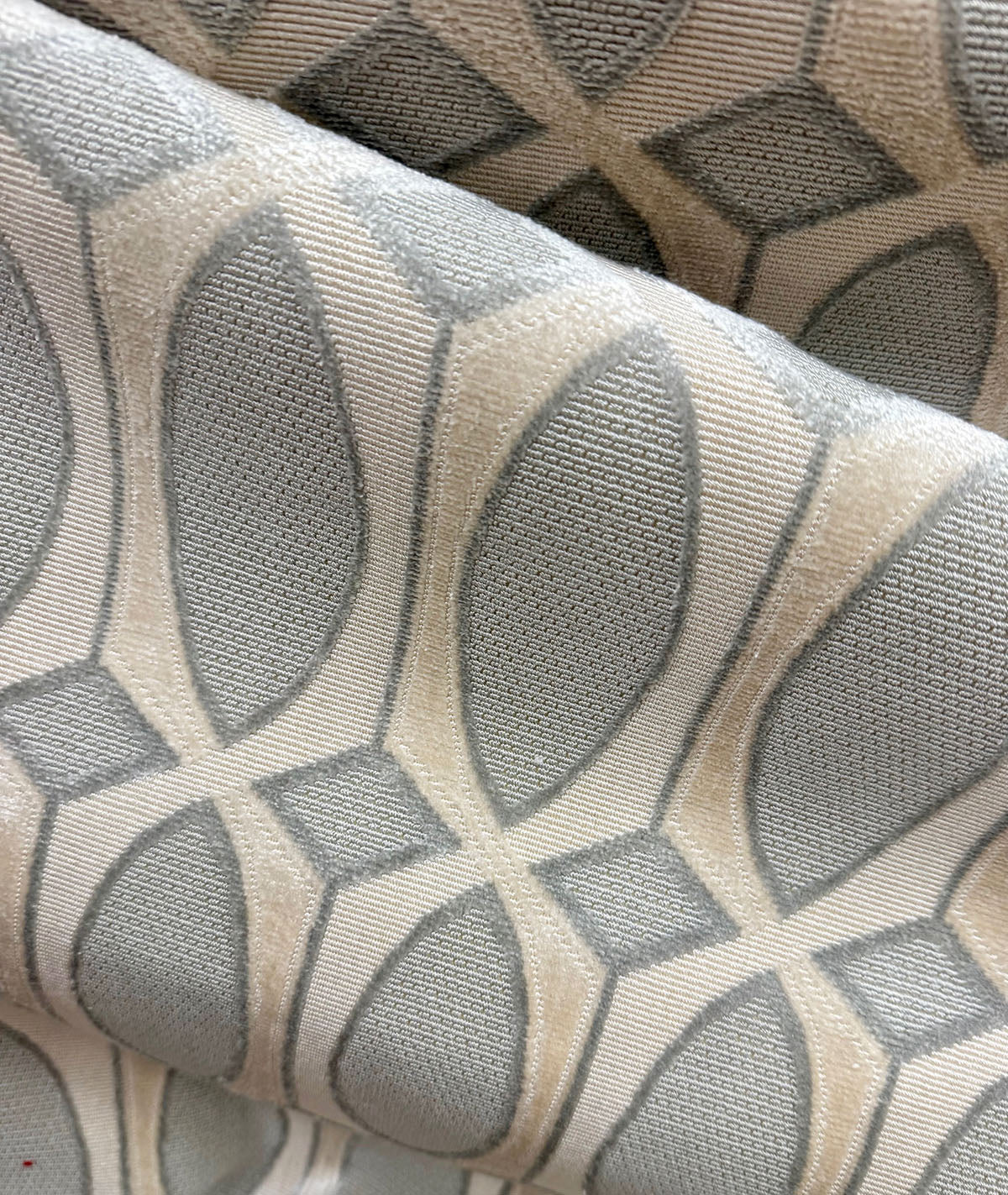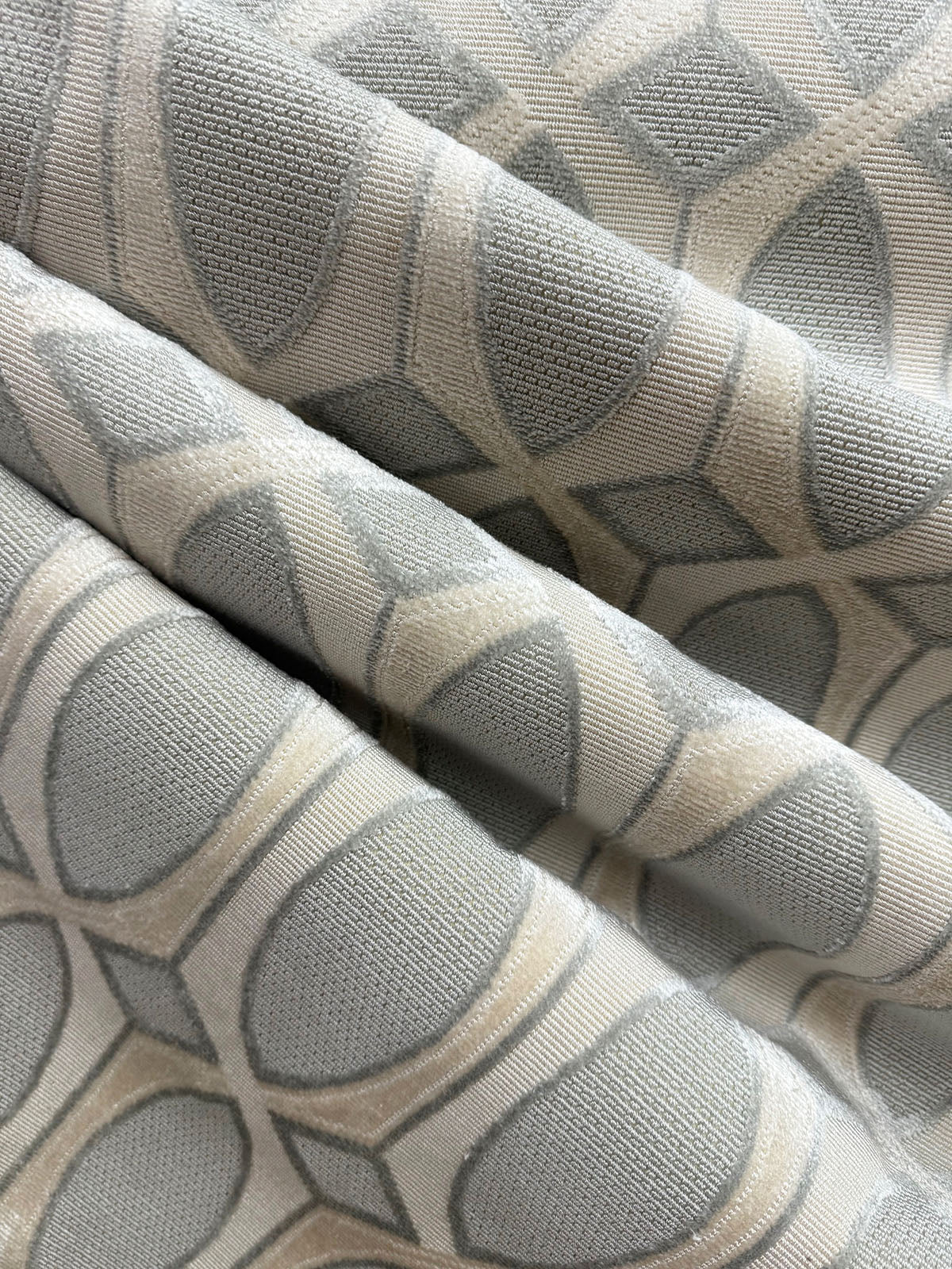Da Vinci in the color Tranquil is a Marquis Geometric Velvet in a Spa blue and cream color scheme.. It is 54" Wide, 40% Polyester 60% Rayon, Repeats: H=13.38" V=14.17" Double Rubs:20,000