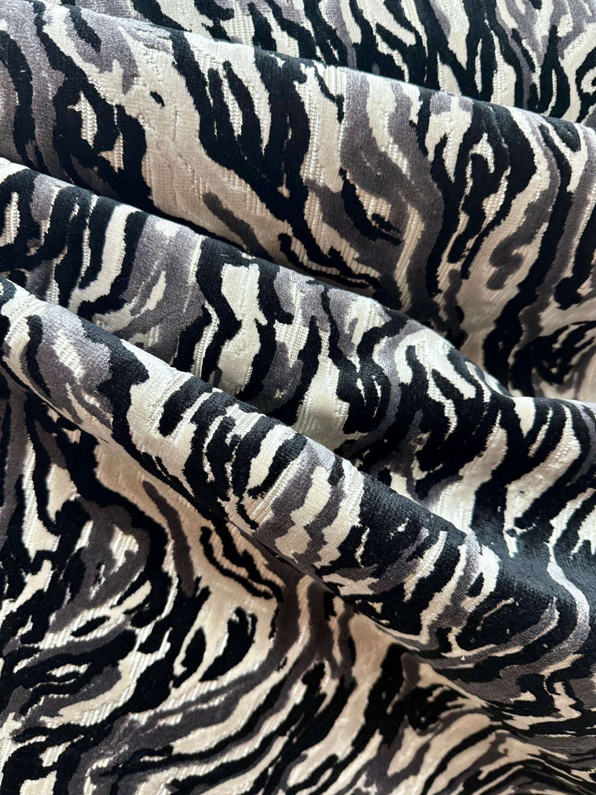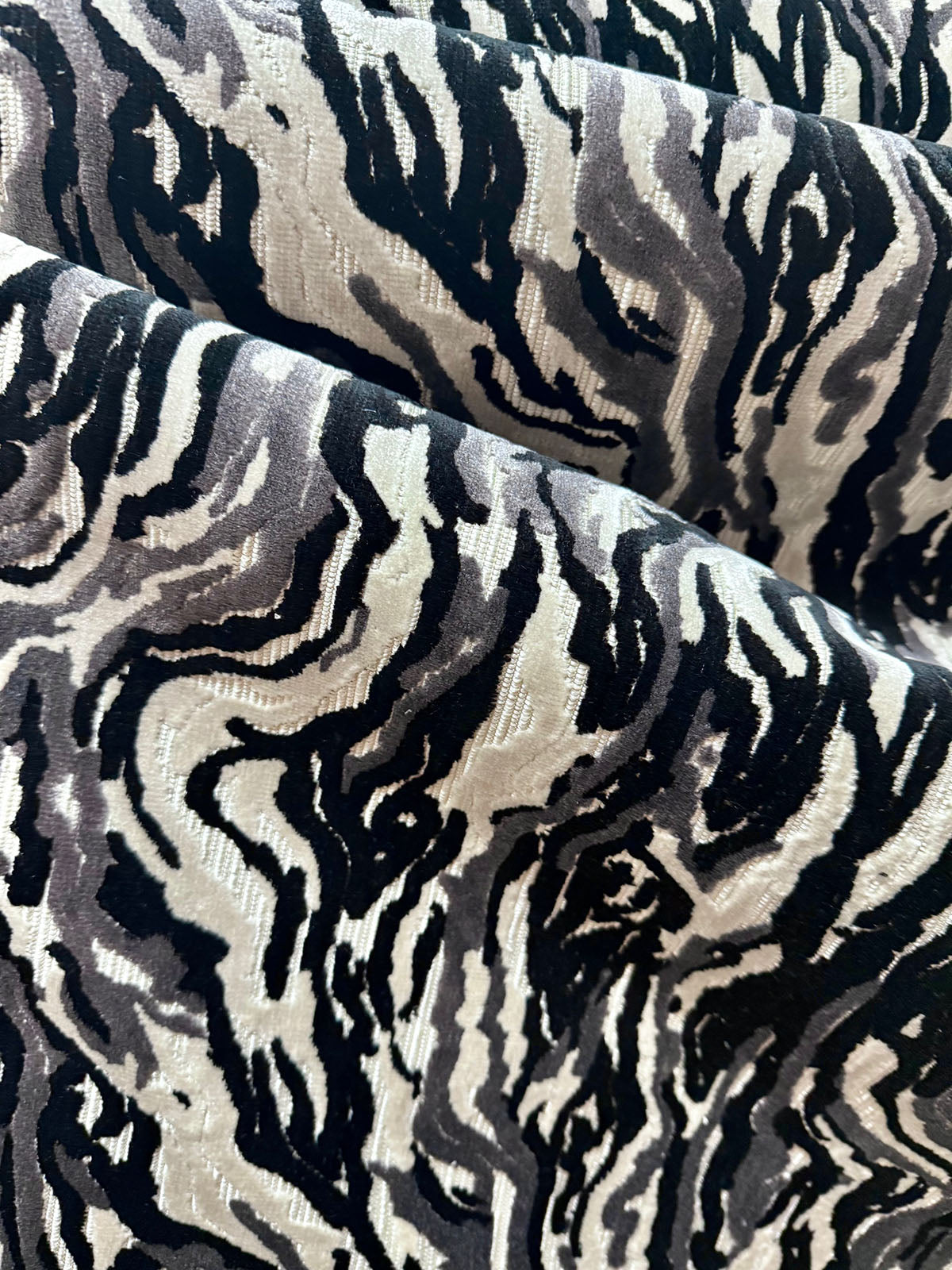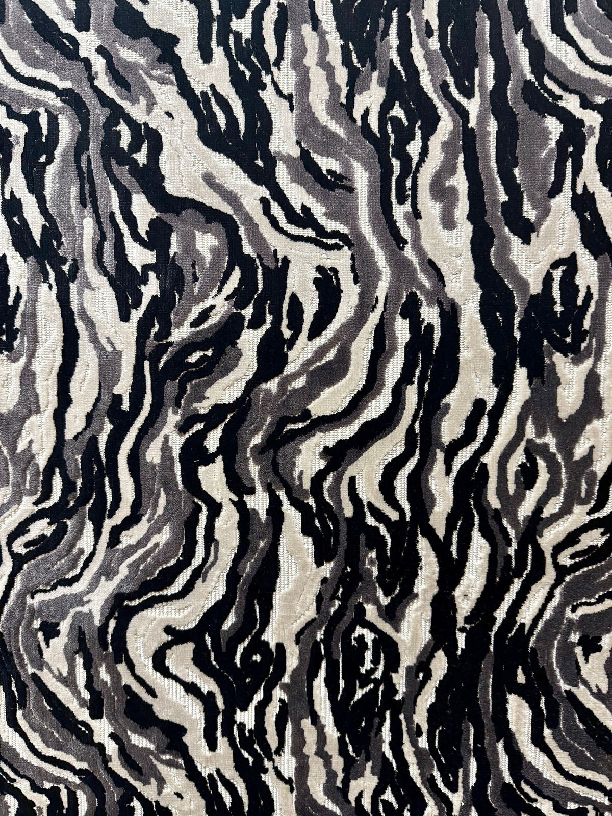 Sequoia in the color Granite is a black and white Abstract Cut Velvet fabric.  It is  54" Wide, 51% Polyester 49% Viscose, Repeats: H=13.48" V=18.50 Double Rubs:20,000