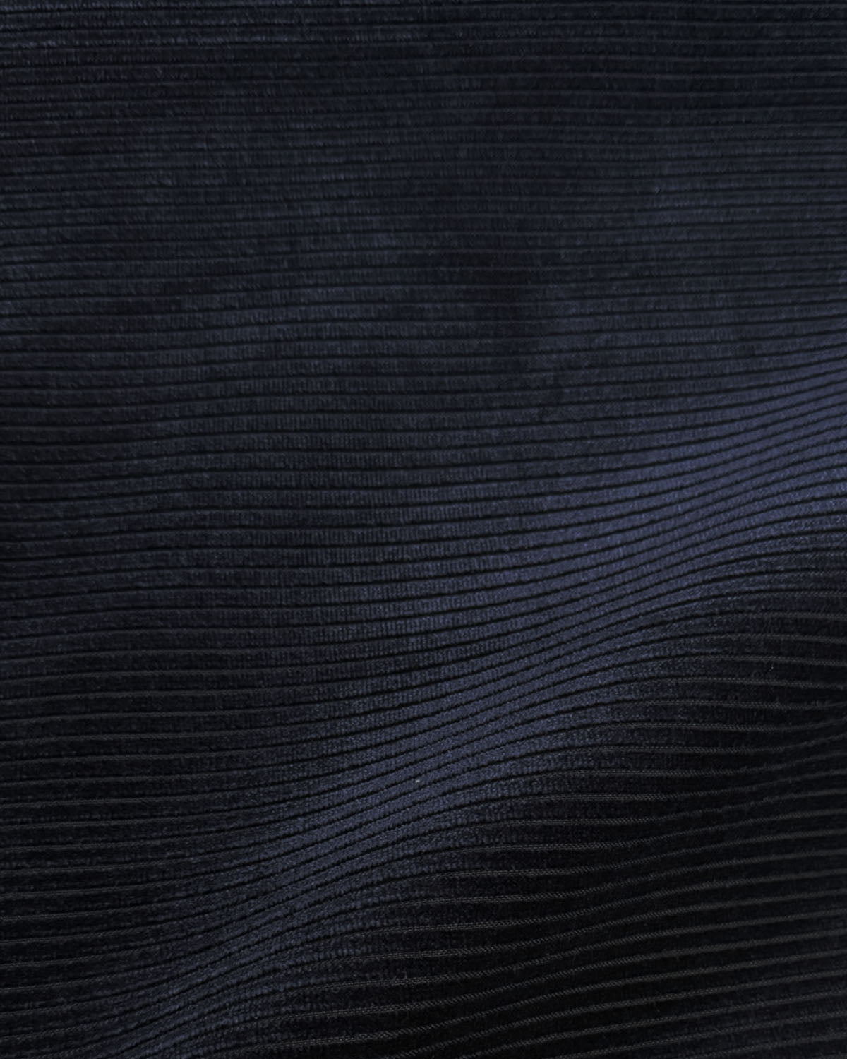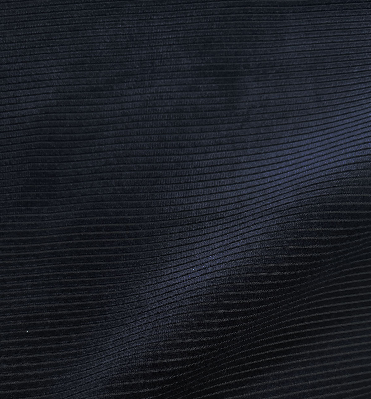 Tuxedo is a Midnight colored shade of Navy Ribbed Velvet fabric and is 54" Wide, 43% Polyester 57% Rayon, Repeats: H=0.25" V=0" Double Rubs:15,000