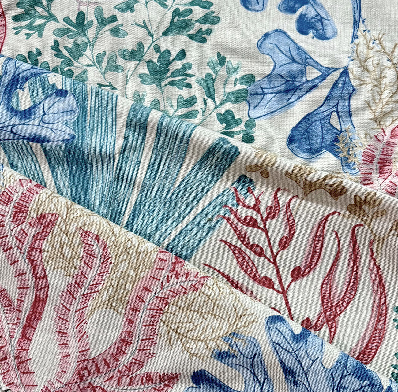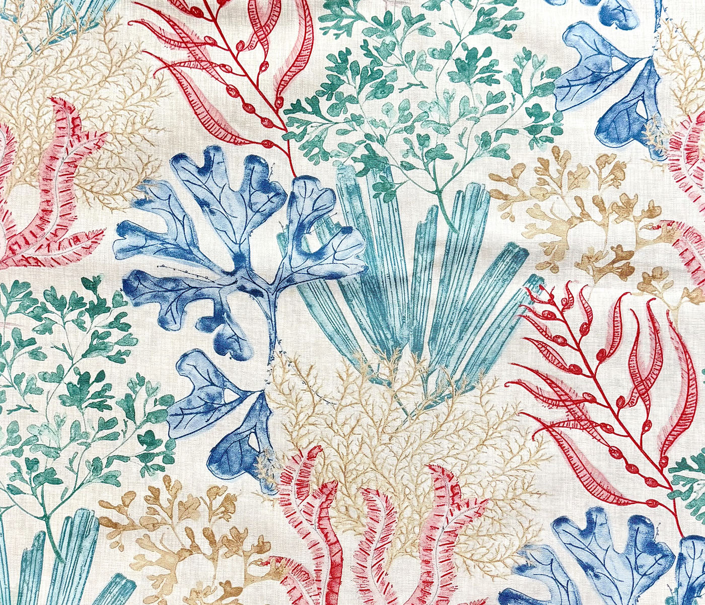 Botanical Sea Print, 54" wide, 100% Cotton, Repeats: H=27" V=24.5", Half Drop 13.5" Double Rubs 30,000