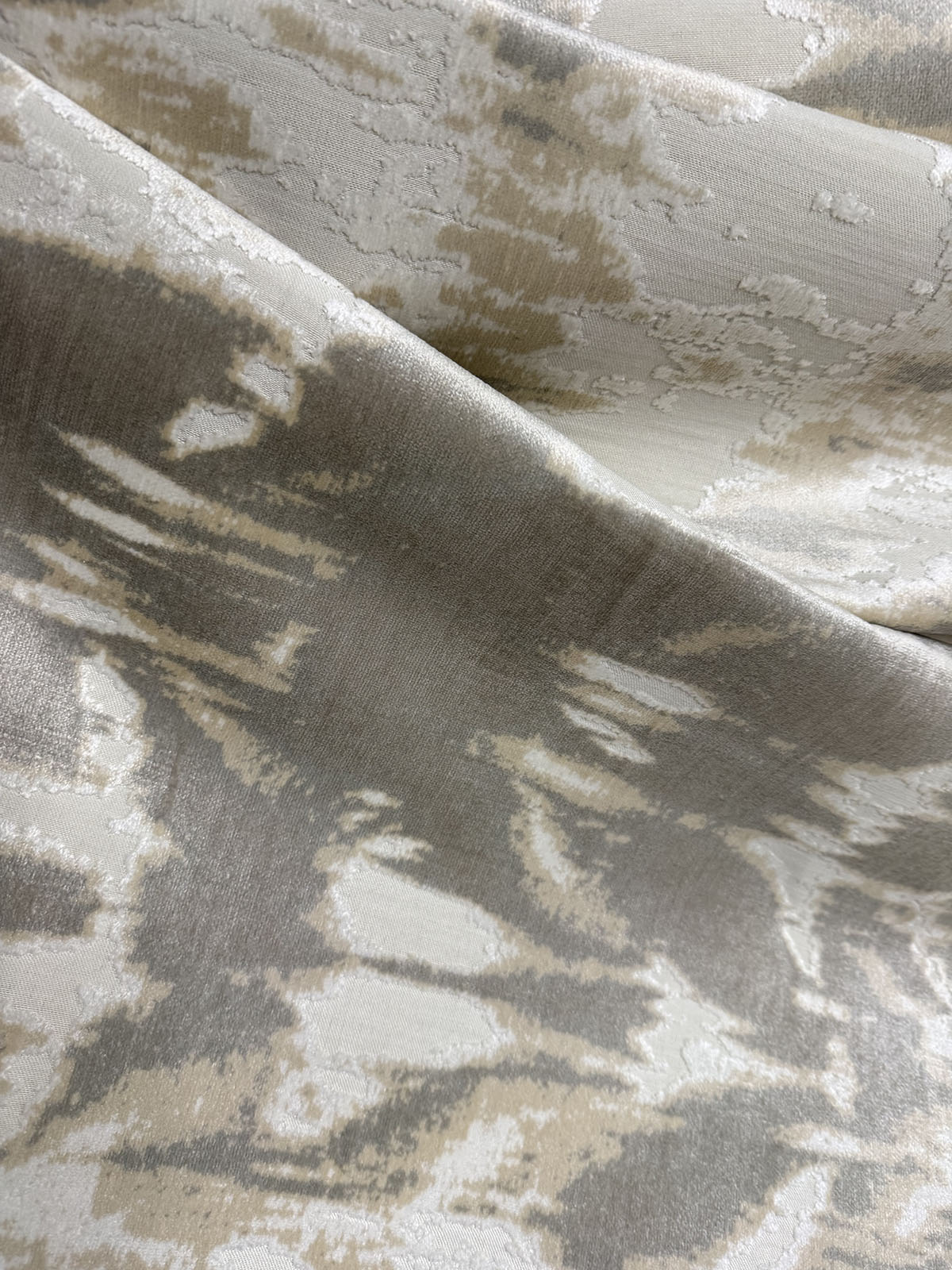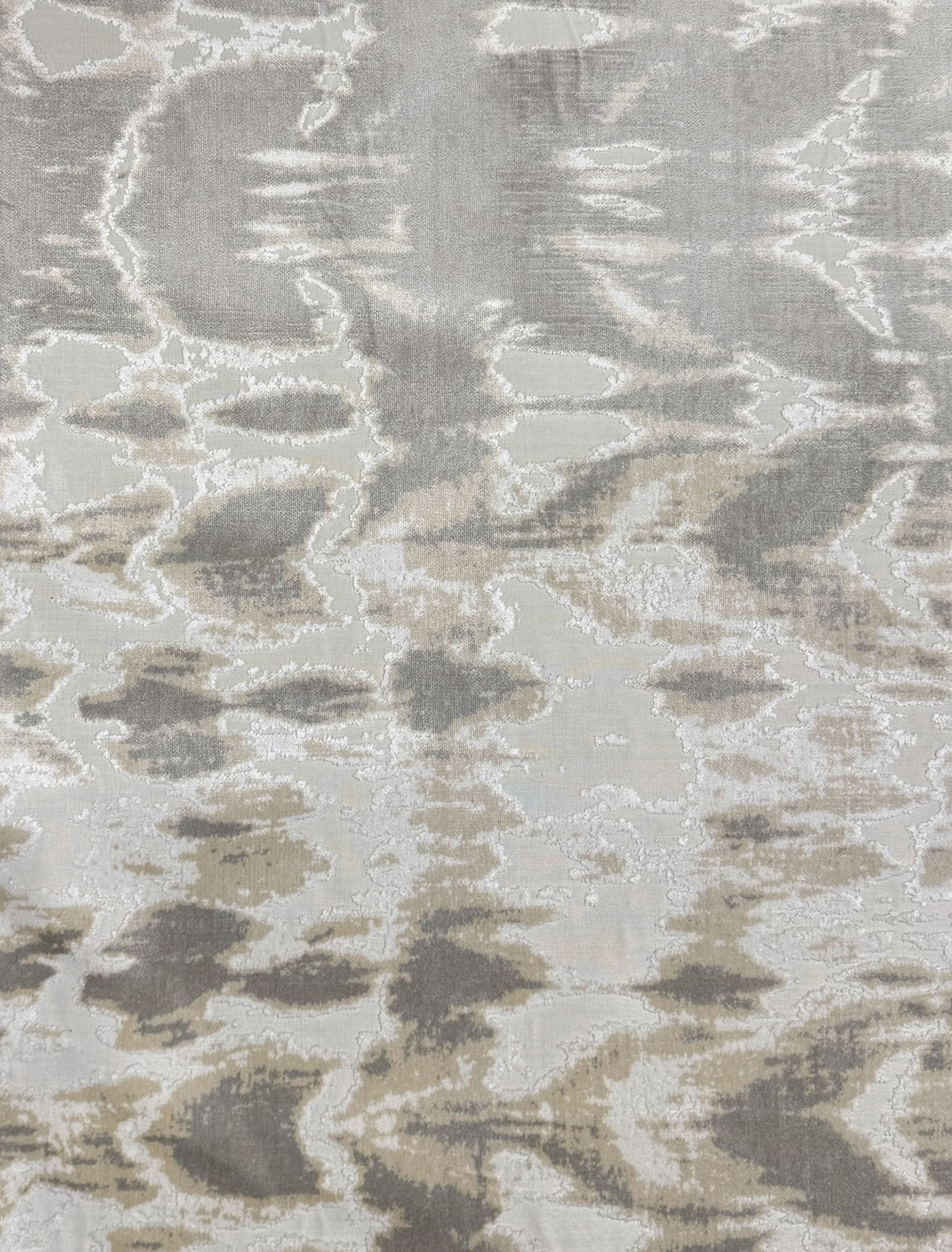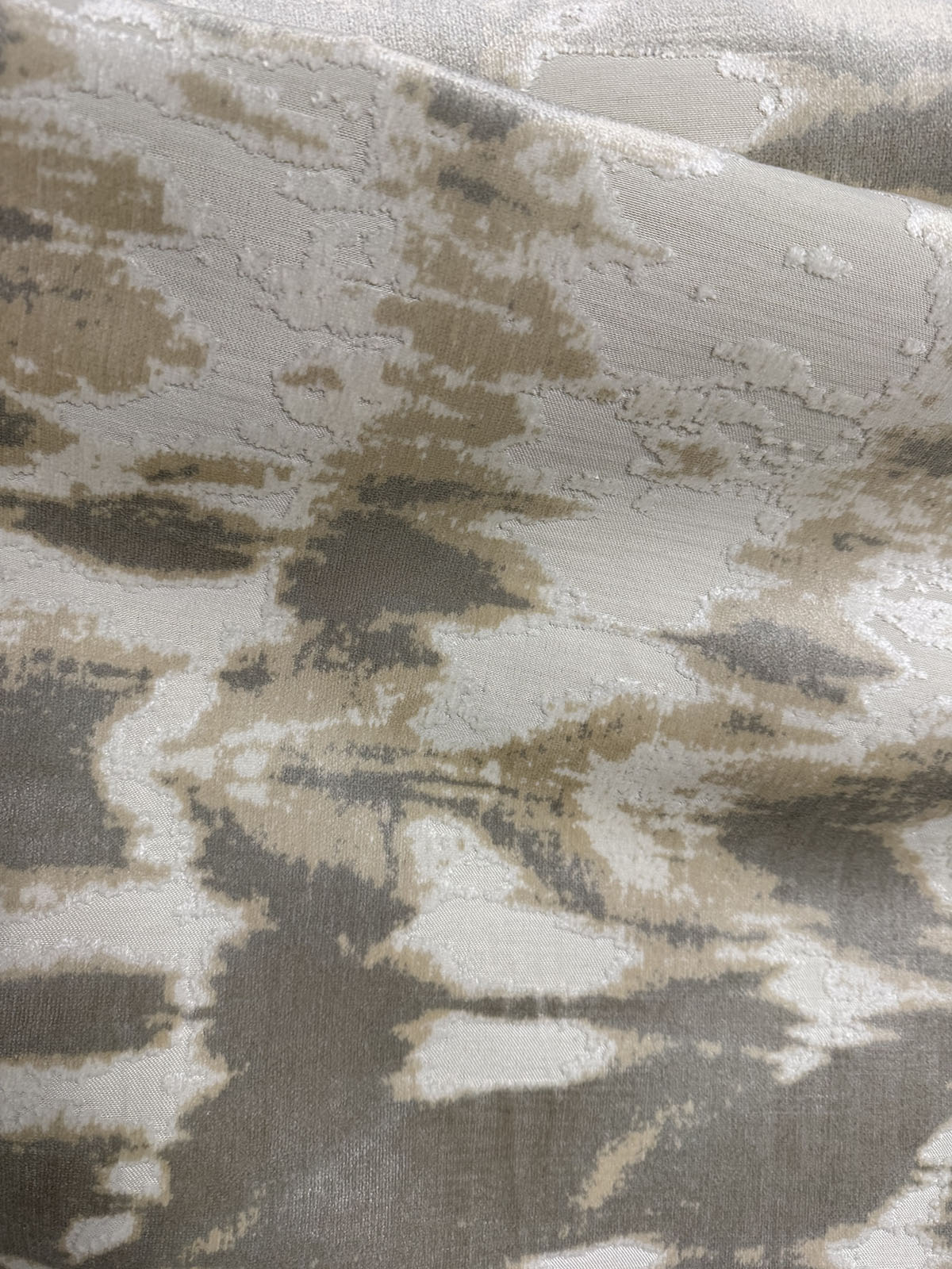 Kanoka in color Tranquility is Abstract Cut Velvet in a taupe, tan and cream colorway, 54" Wide, Content: Polyester/Rayon, Repeats: H=28 1/3" V=30 1/8" Double Rubs: 20,000Two Pieces: 1 piece 9.5 yards, 1 piece 13 yards
