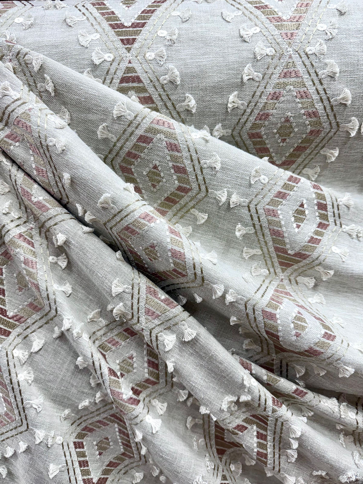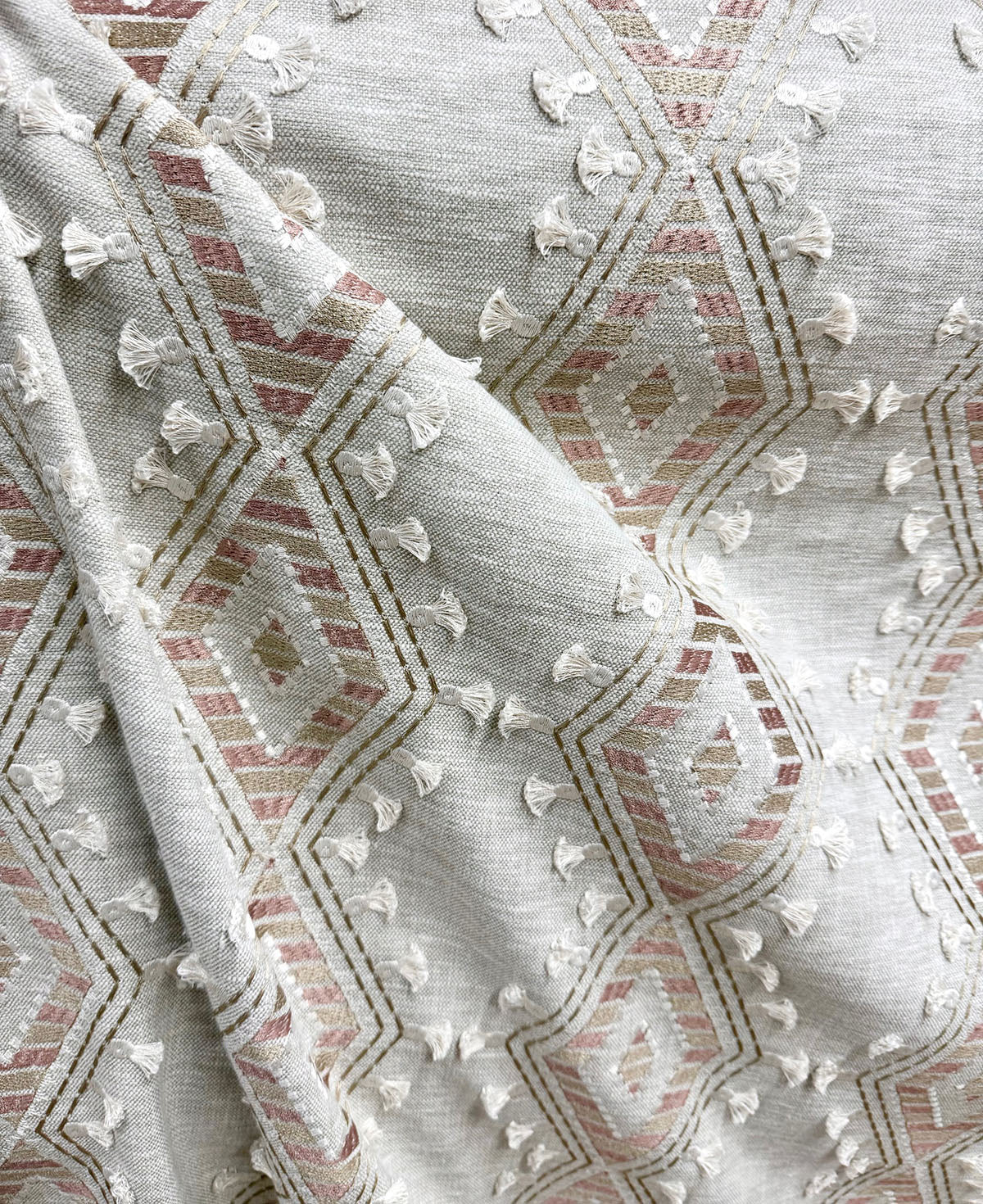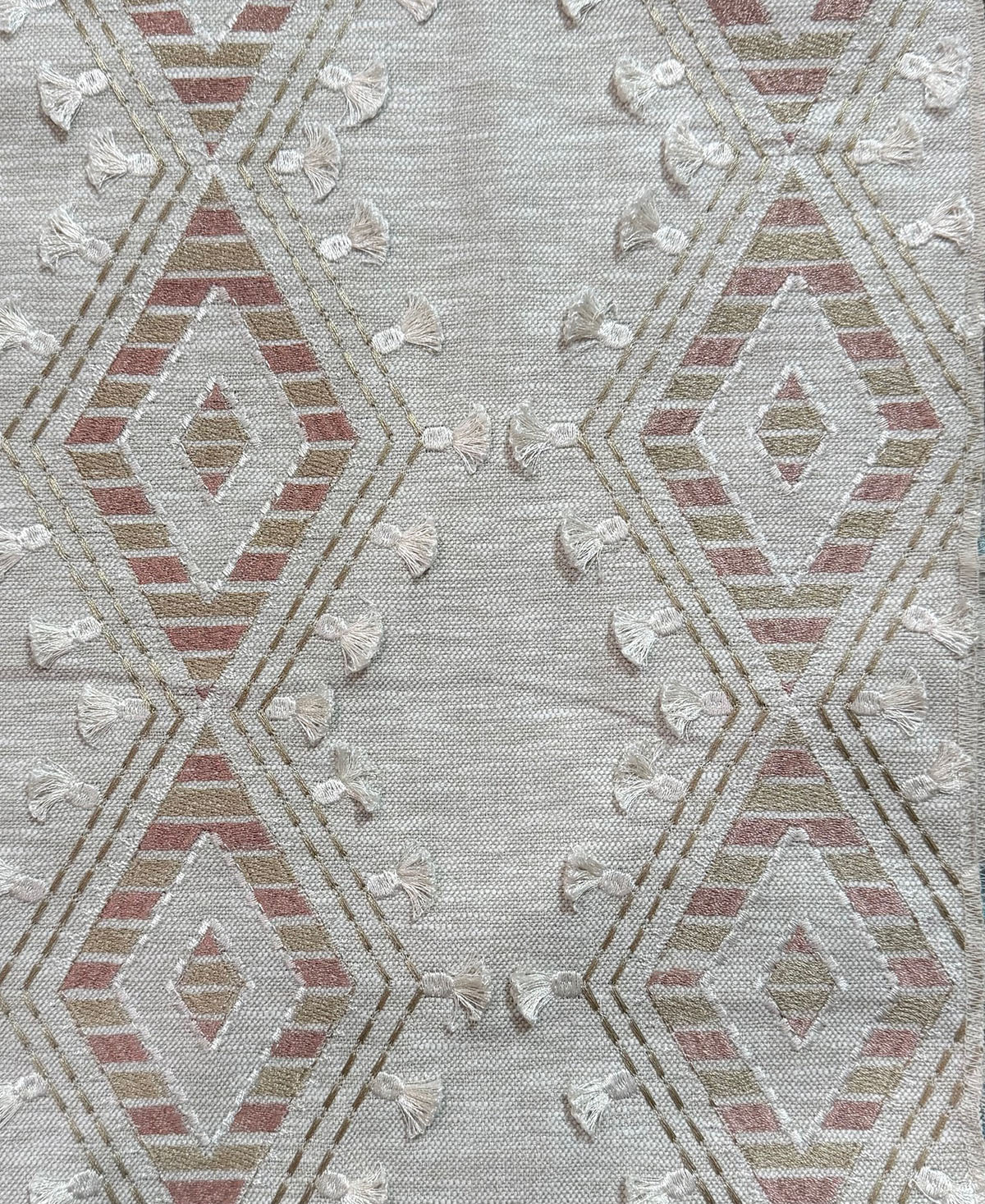 Ground Breaker in the color Cameo is an Embroidered Eyelash Diamond, 54" Wide, 29% Cotton 71% Polyester, Repeats: H=6.5" V=6.25" Double Rubs: 25,000