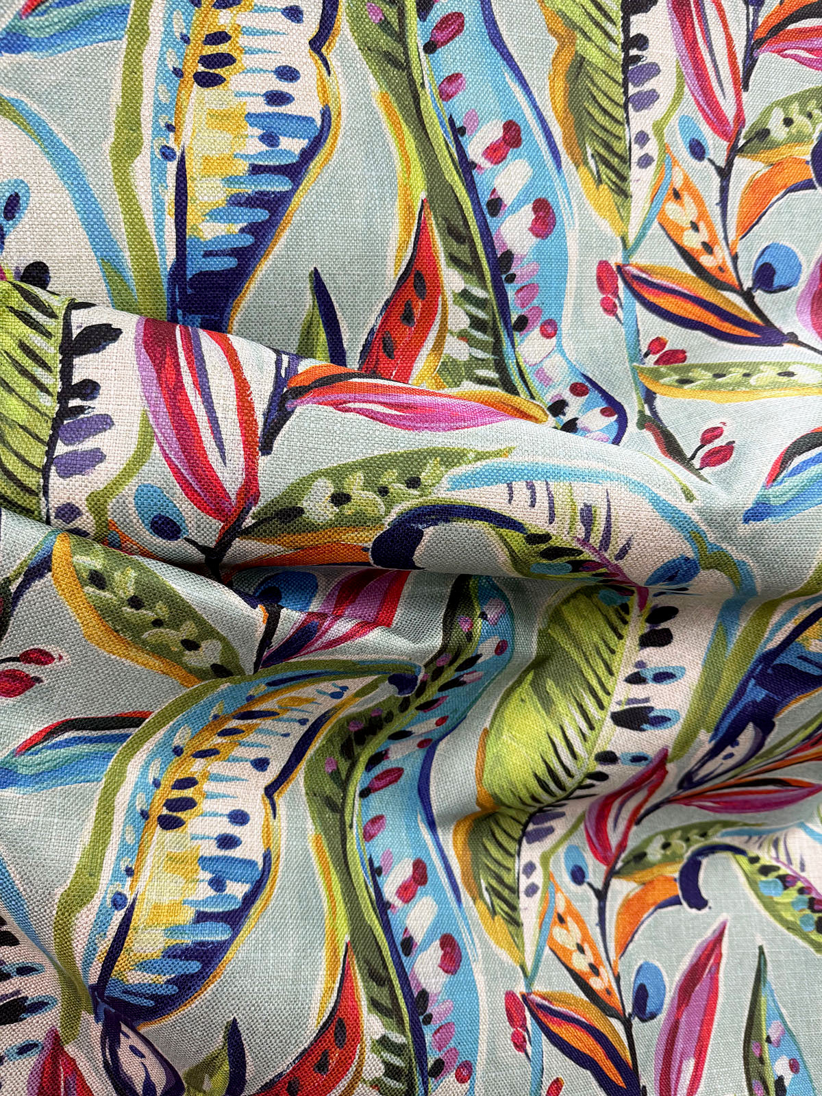 R-Enrique in the color Carnival is a Bold Painted Leaf Print, 55" wide, 100% Polyester, Repeats: H=27.5" V=24.5" Double Rubs: 40,000 Flame Code: UFAC Class I/Cal-117-2013 Pass