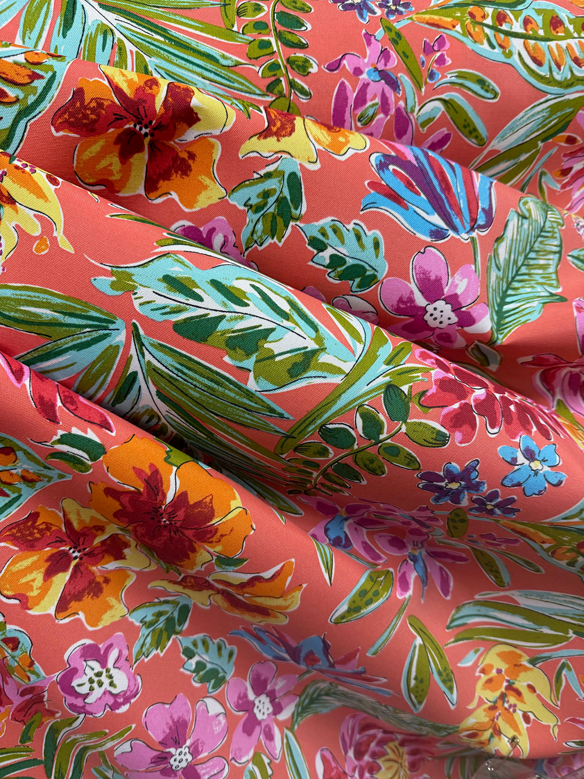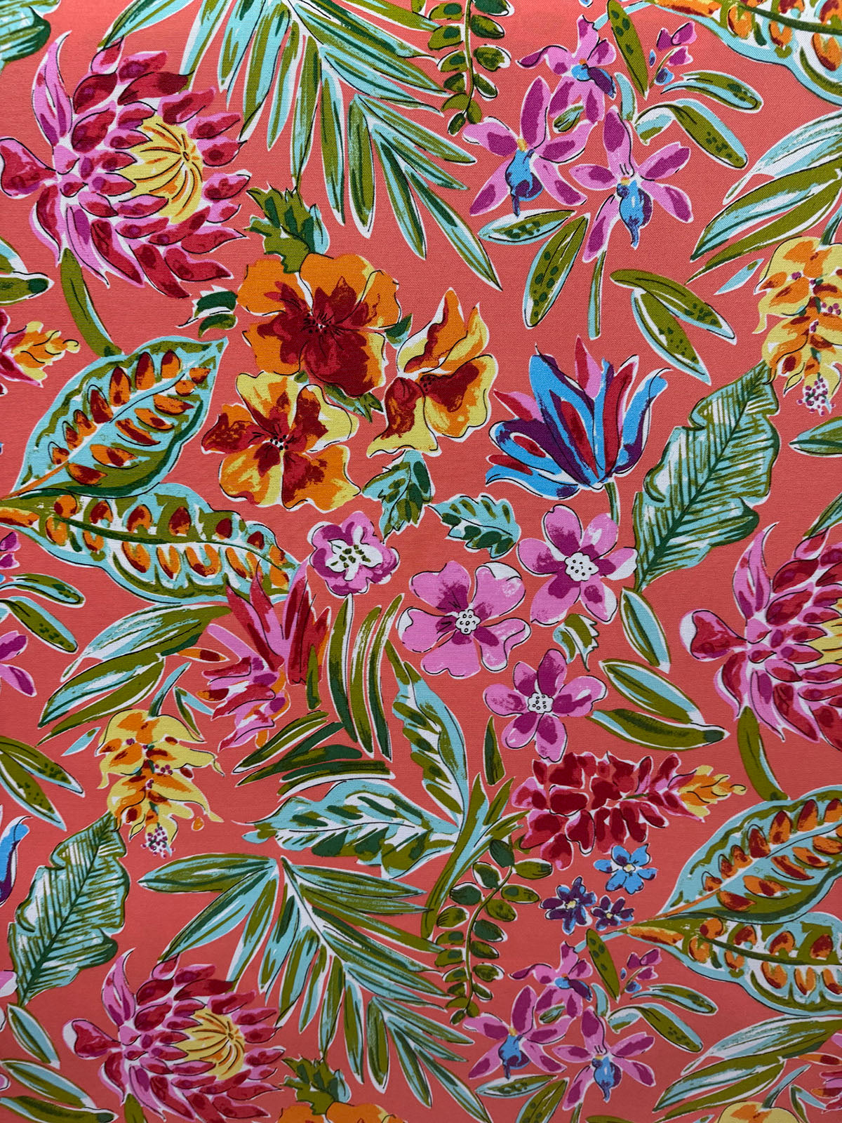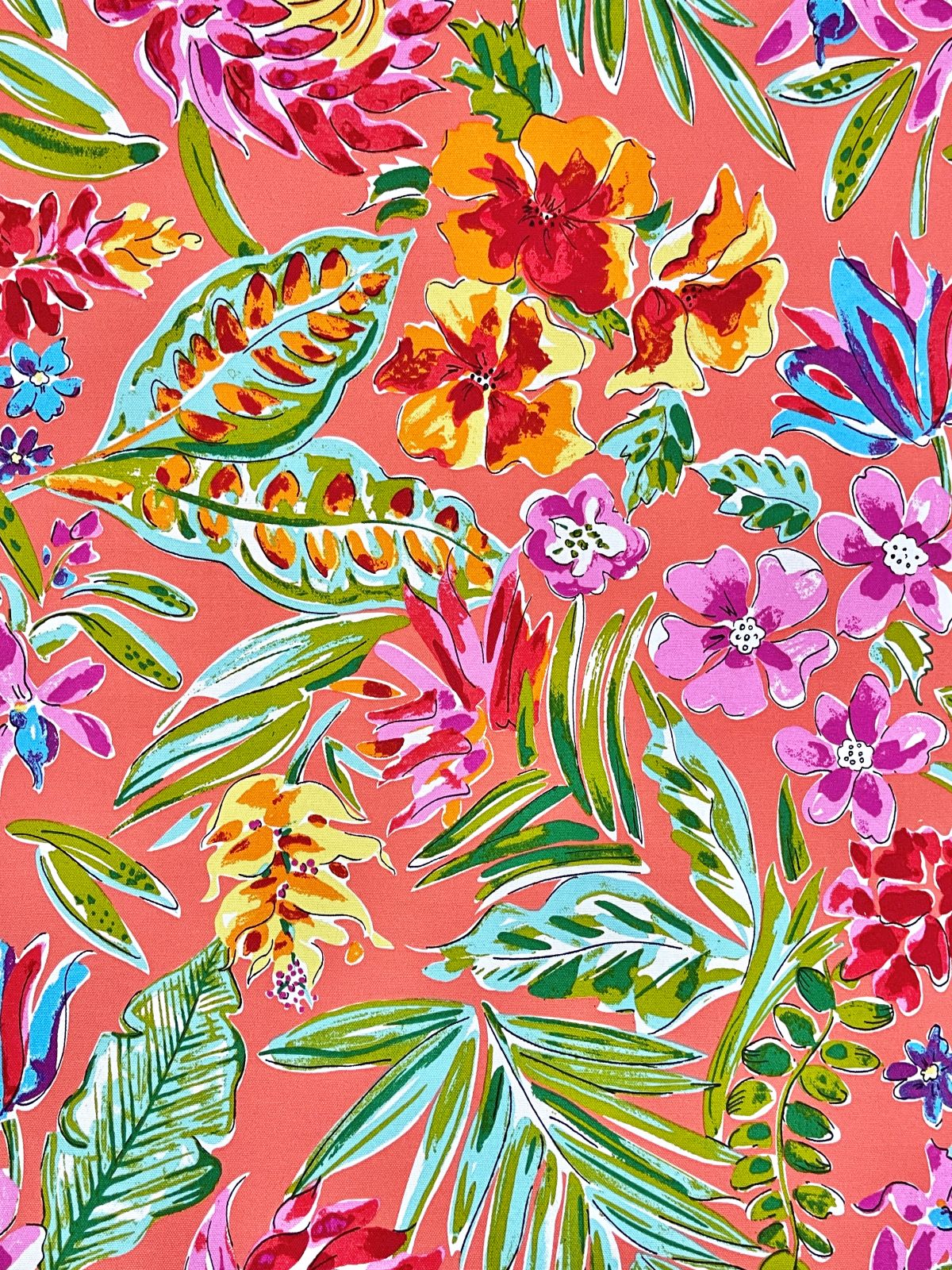 OD Paradise Island in color Coral is a outdoor Multi color Tropical Floral, 60" Wide, 100% Polyester, Repeats: H=36" V=25 Double Rubs: 15,000