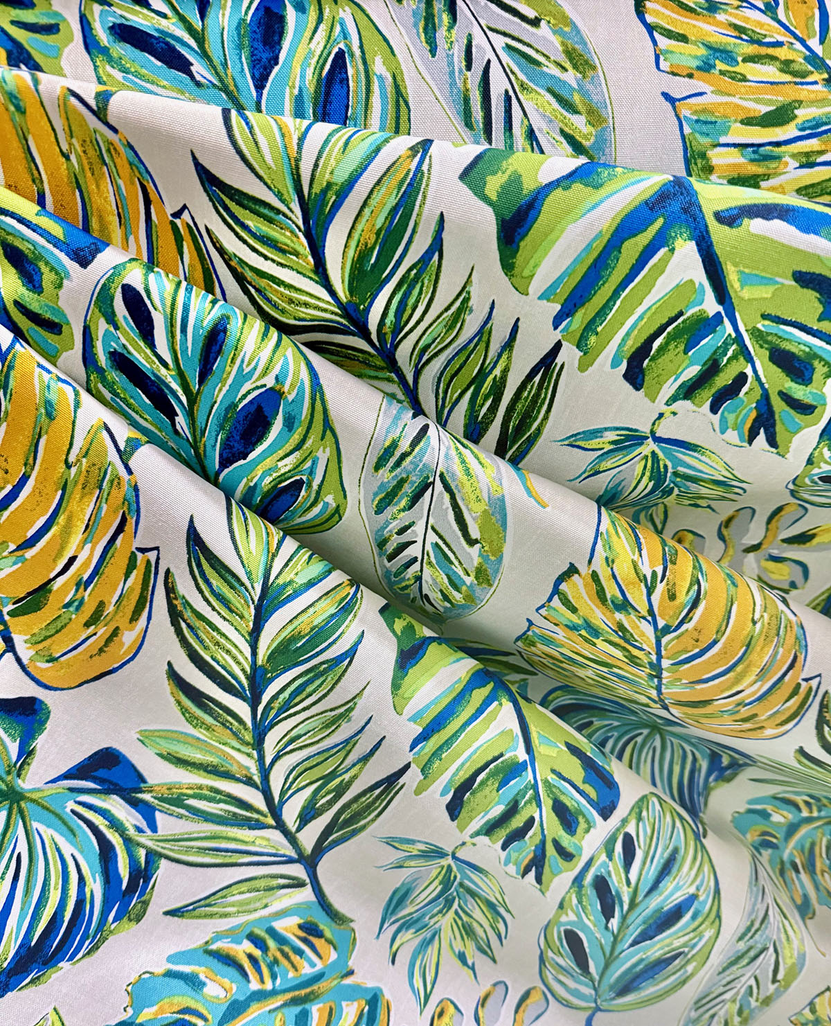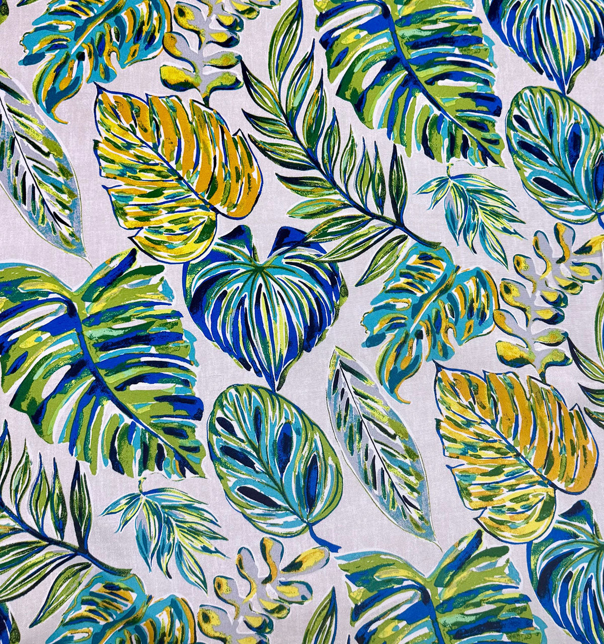 OD Tradewinds in the color Blue is an Outdoor Tropical Leaves, 60" Wide, 100% Polyester, Repeats: H=27" V=25.5" Double Rubs: 15,000