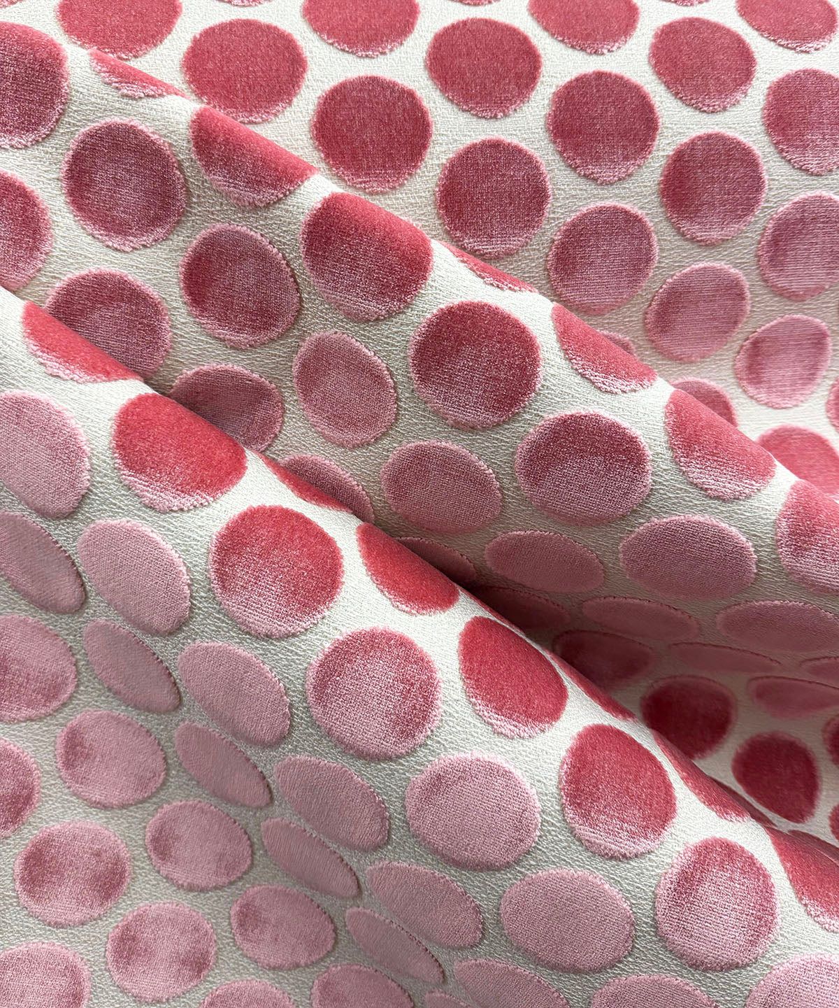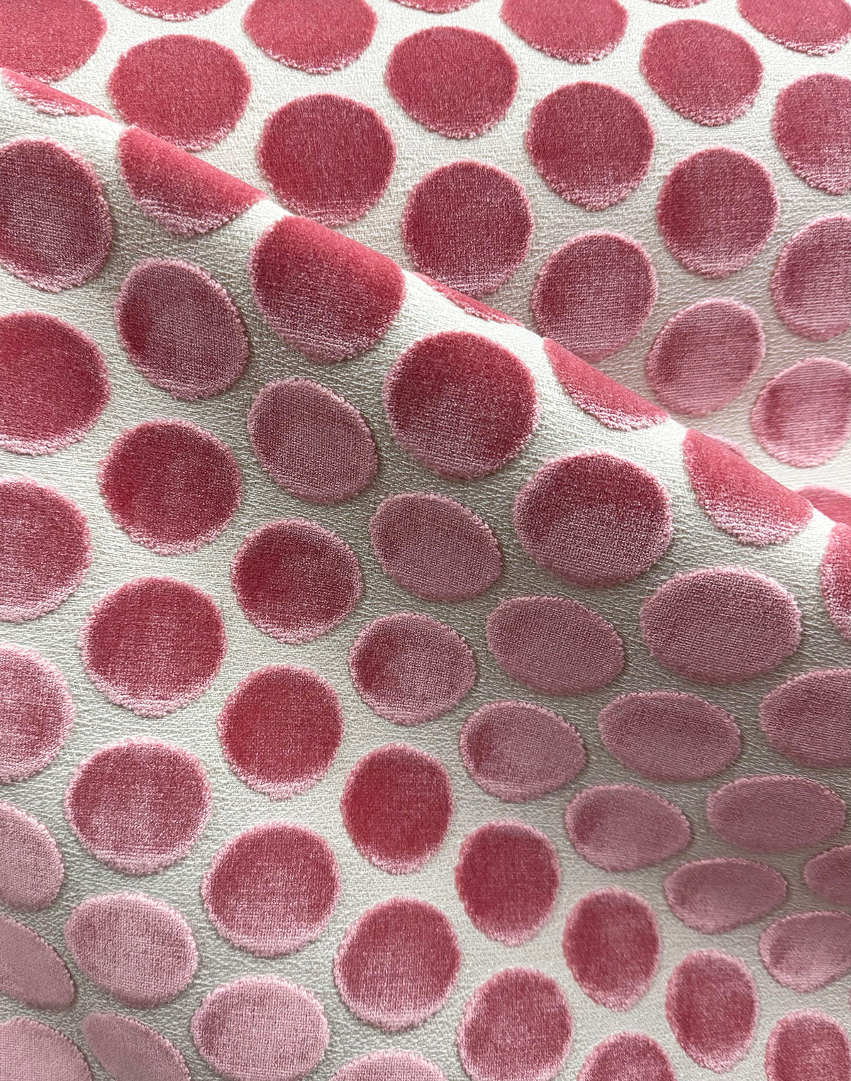 Cut Velvet Dot, 57.5" wide , 86% Viscose 14% Poly, Repeats: H= 3.5" 2.2" Double Rubs 18,000. UFAC CLASS I /CAL-117-2013 PASS