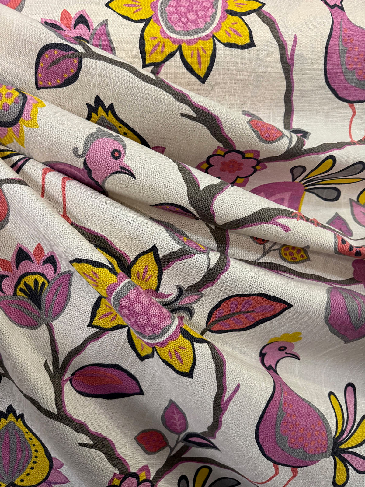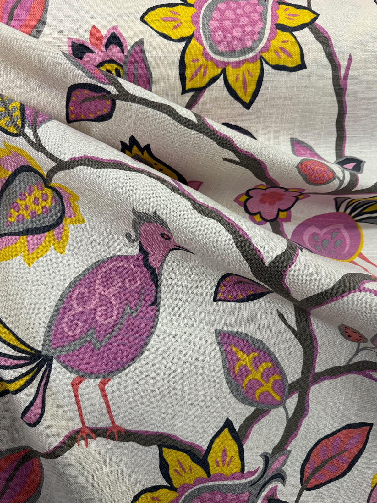 Meriweather in the color Azalea is a Bird & Floral print by Tobi Farley. 54" wide, 55% Linen 45% Rayon. Repeats: H=27" V=27"