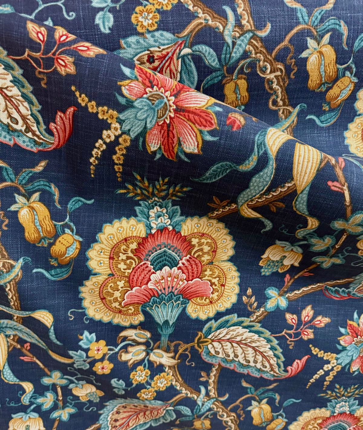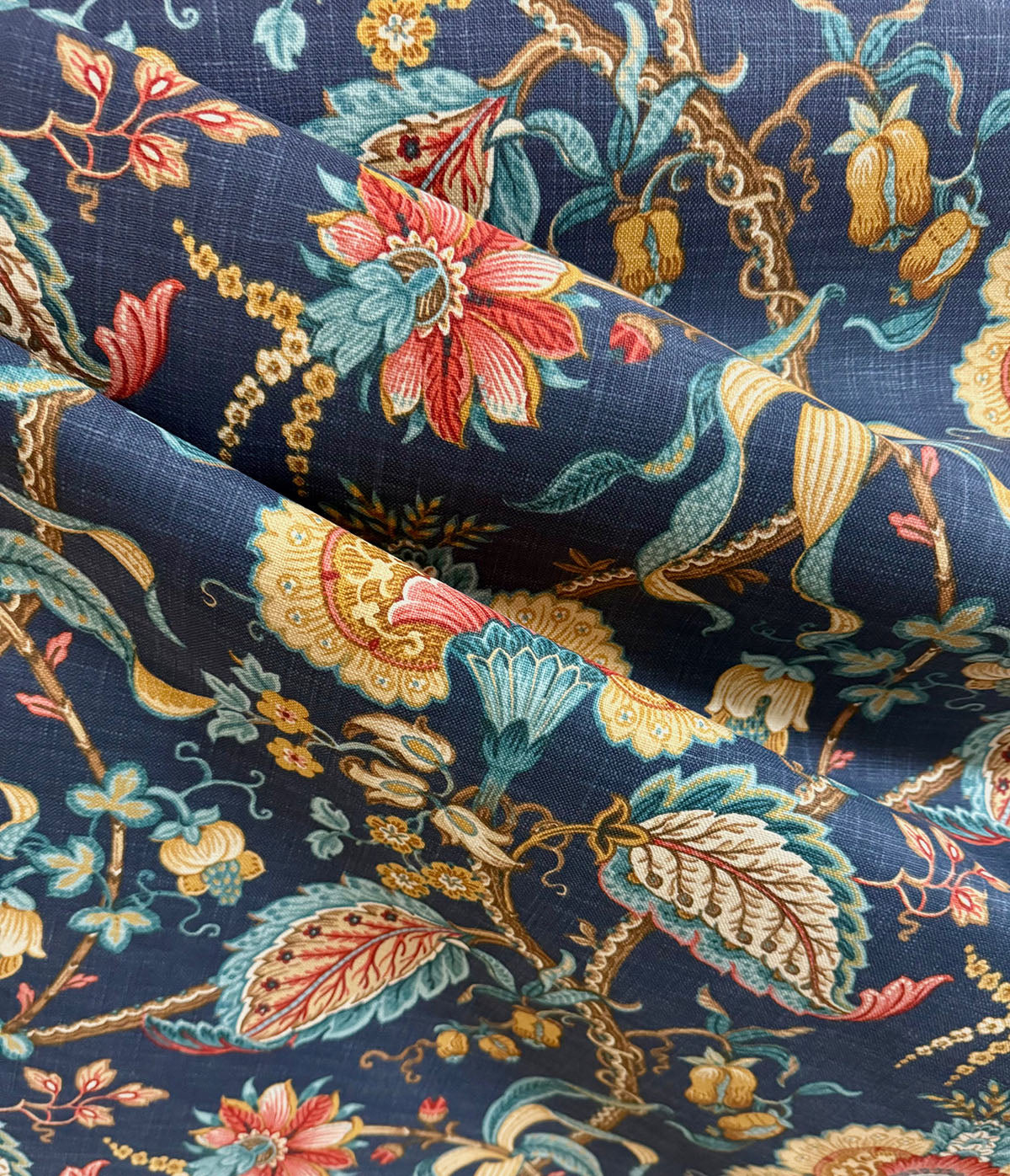 Leicester 54 in the color Sapphire is a Jacobean Floral, 54.75" Wide, 100% Cotton Repeats: H=27.25" V=24.75 Double Rubs: 50,000 Flammability CAL 117-2013, UFAC Class 1