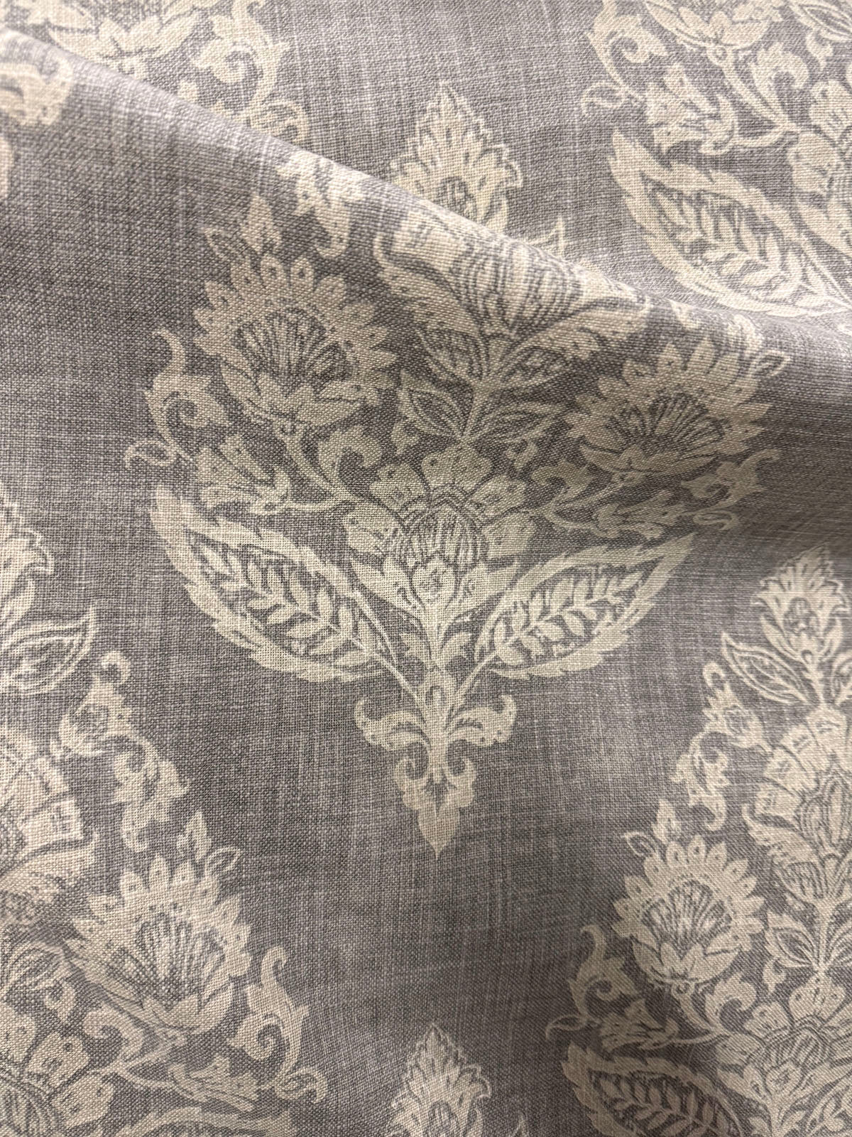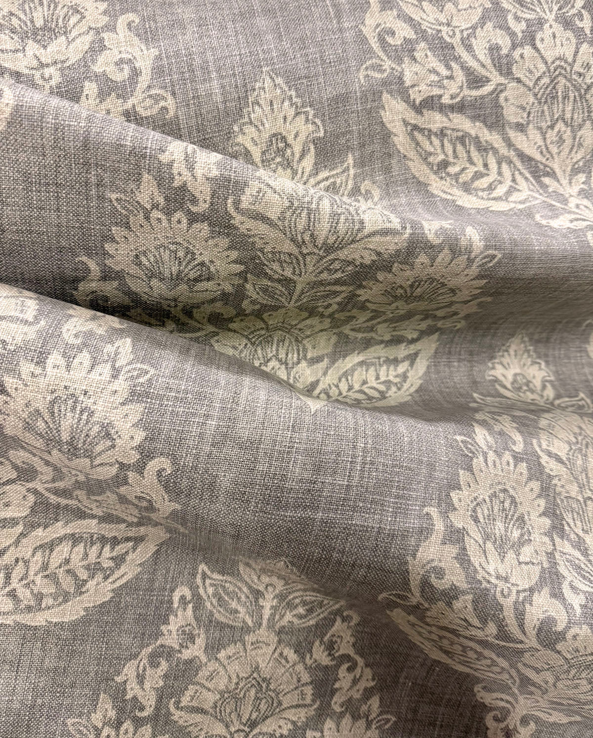 Lydia 952 in Stone is a Grey/Silver Floral Medallion print, 56" Wide, 100% Cotton, Repeats: H=13.5" V=17.5" Double Rubs: 50,000