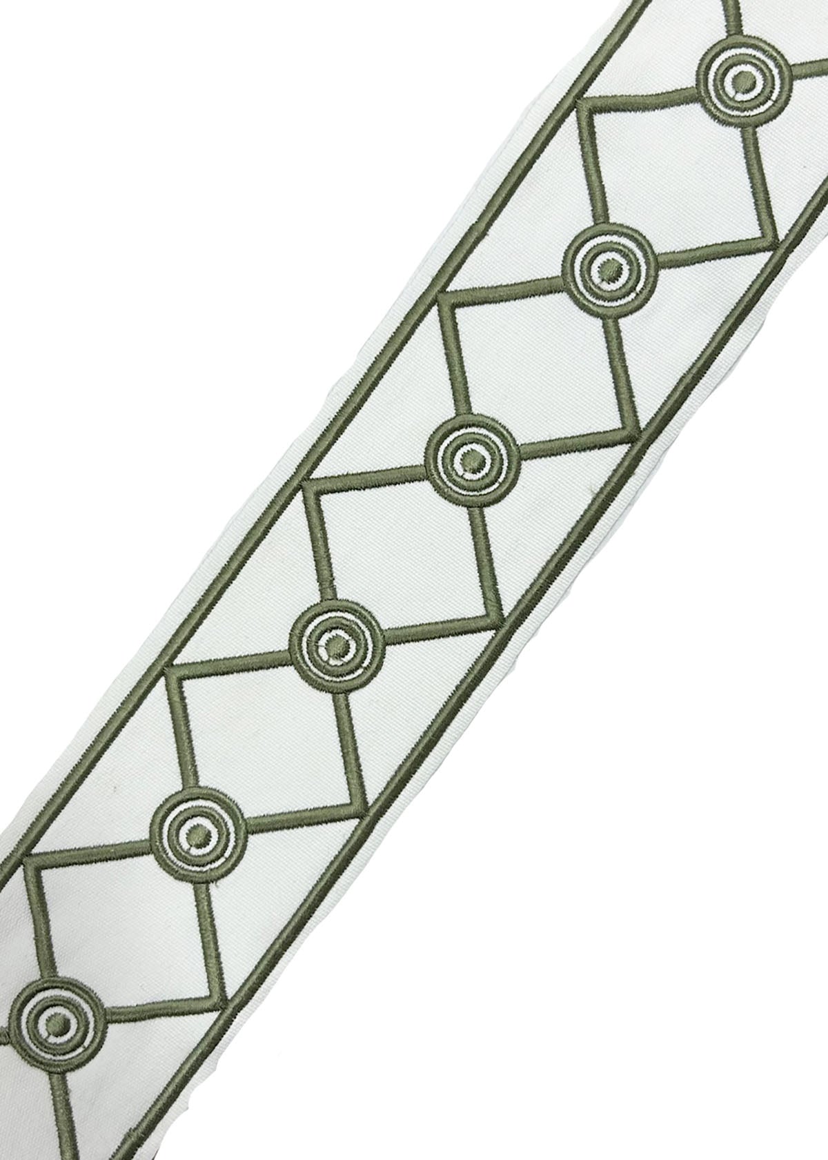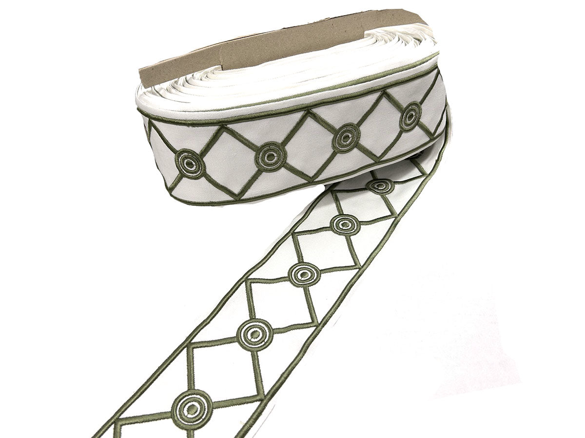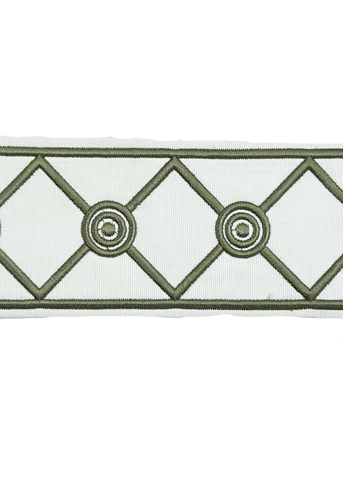 Vale in color Olive is a 4" Embroidered Circles & Diamond Tape 2.75" Repeat