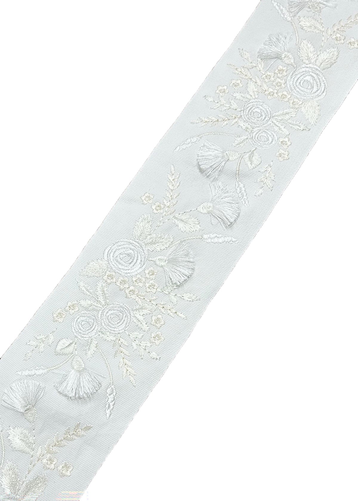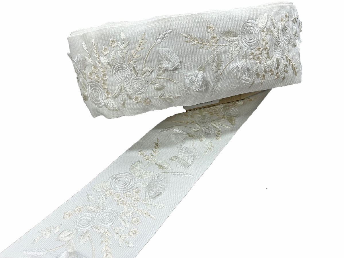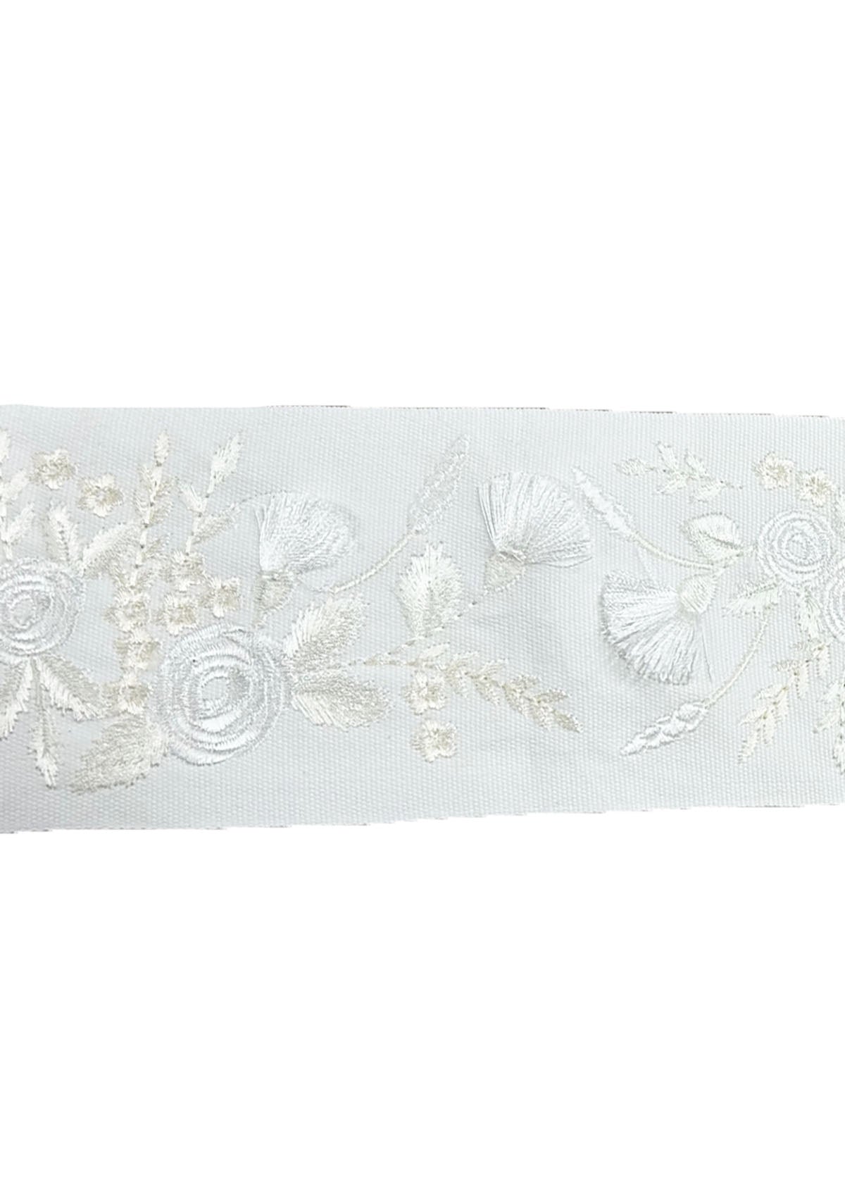 Somerset in color White Opt #2 is a 4" Embroidered Floral Tape 15" Repeat