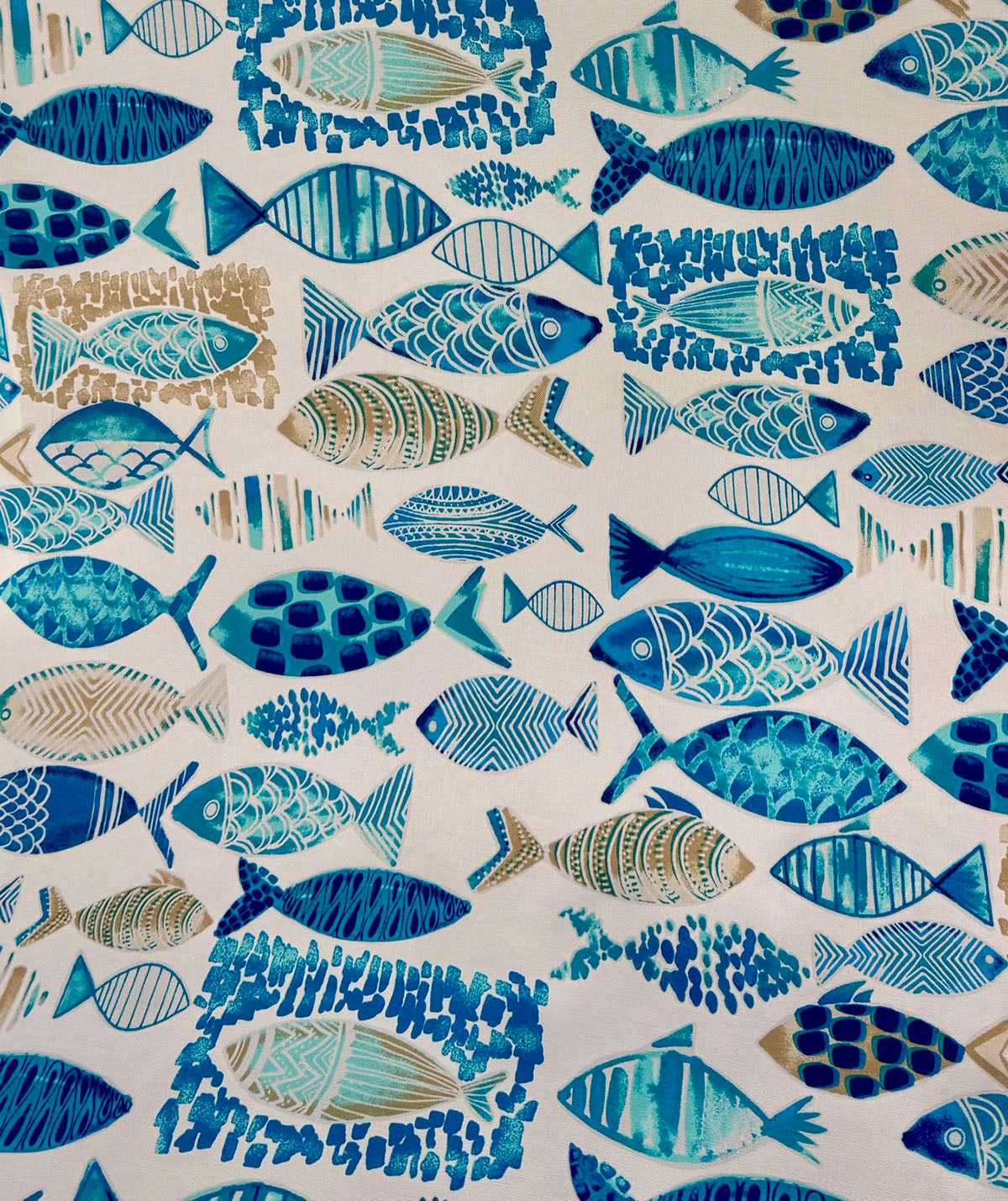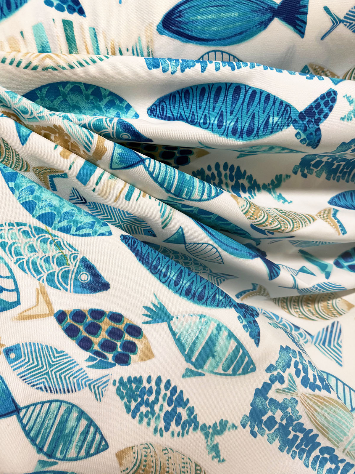 OD Hooked in the color Seaside Blue is an Outdoor Fish, 60" Wide, 100% Polyester, Repeats: H=26" V=25" Double Rubs: 15,000