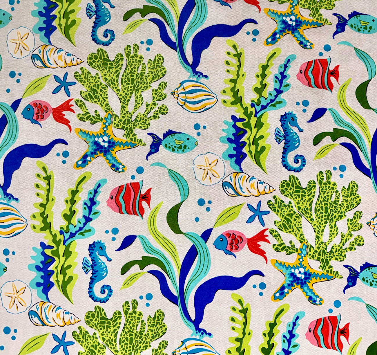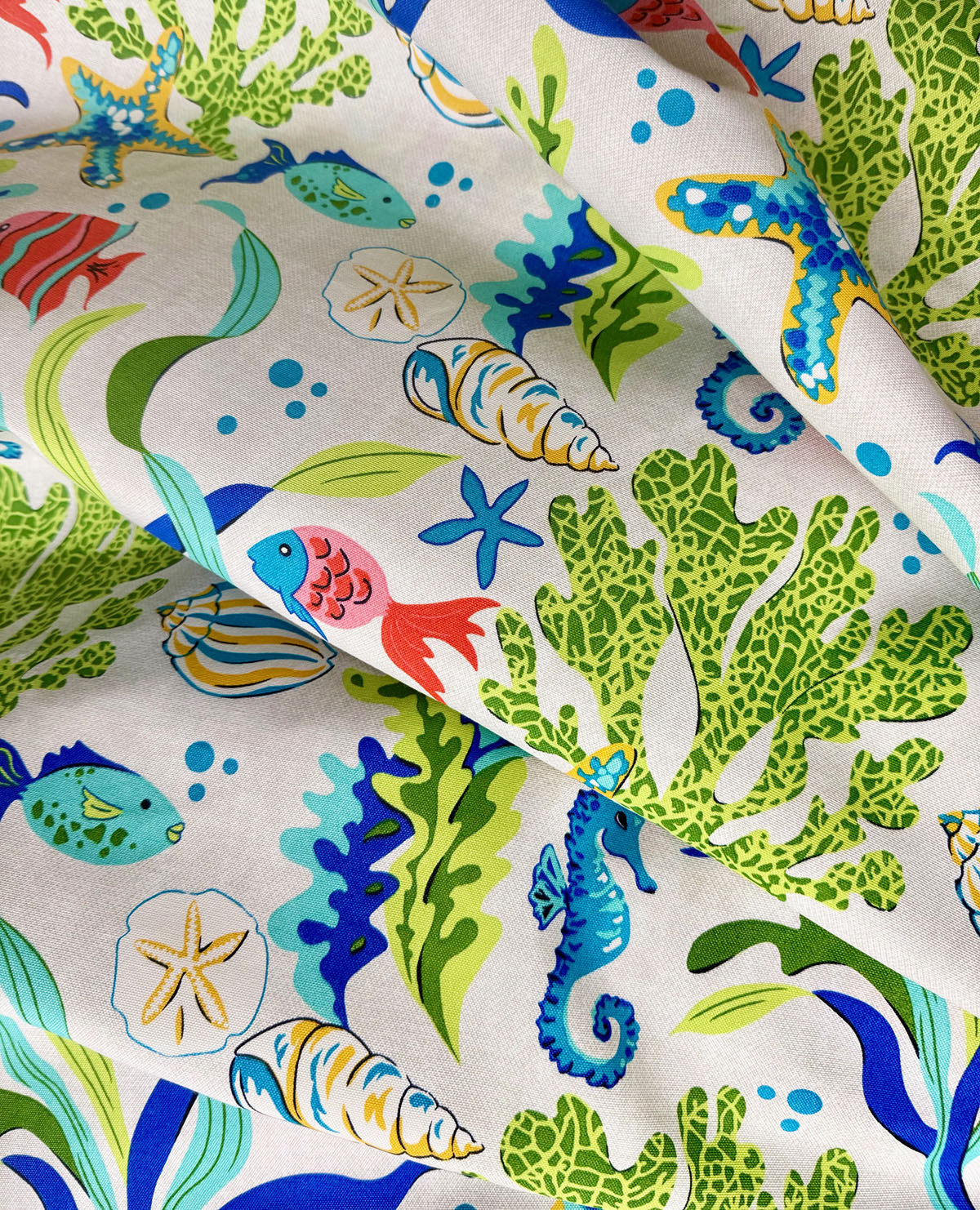 OD Coral Bay in the color Blue is an Outdoor Brightly Colored Sealife, 60" Wide, 100% Polyester, Repeats: H=28" V=18" Double Rubs: 15,000