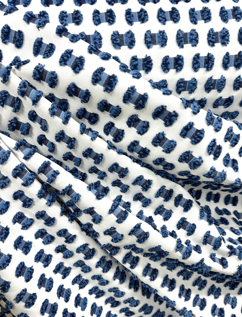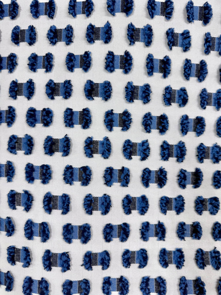 O'Fifi in an Indigo Mix color is an OD Eyelash Rectangle, 54" wide, 100% Poly, Repeat: V=1.75" H=2.5", 50,000 double rubs, 1,000 light hours backed