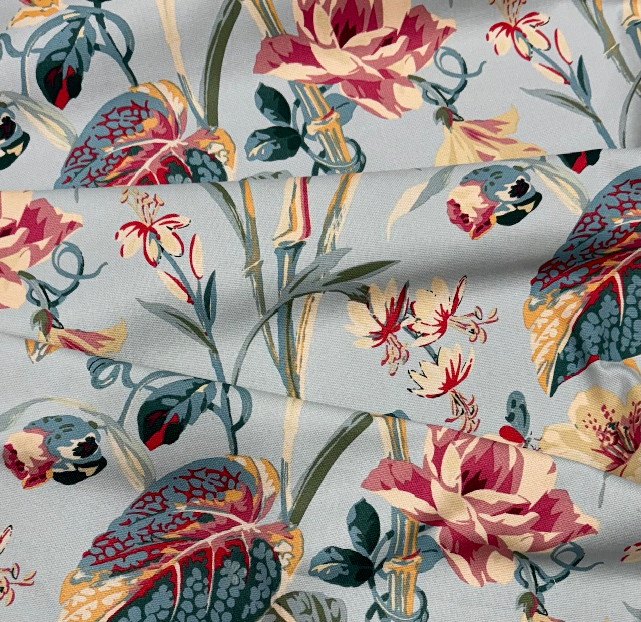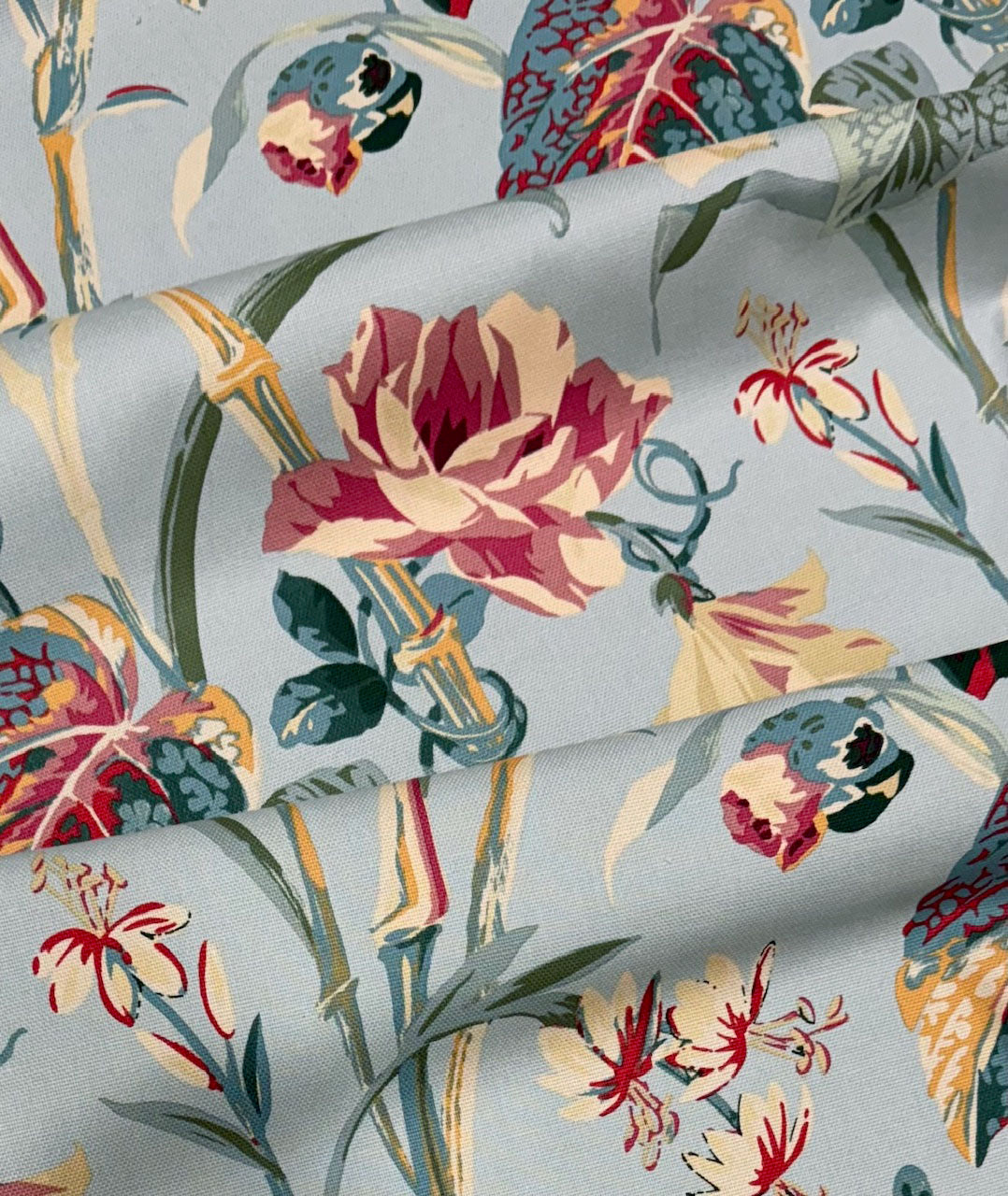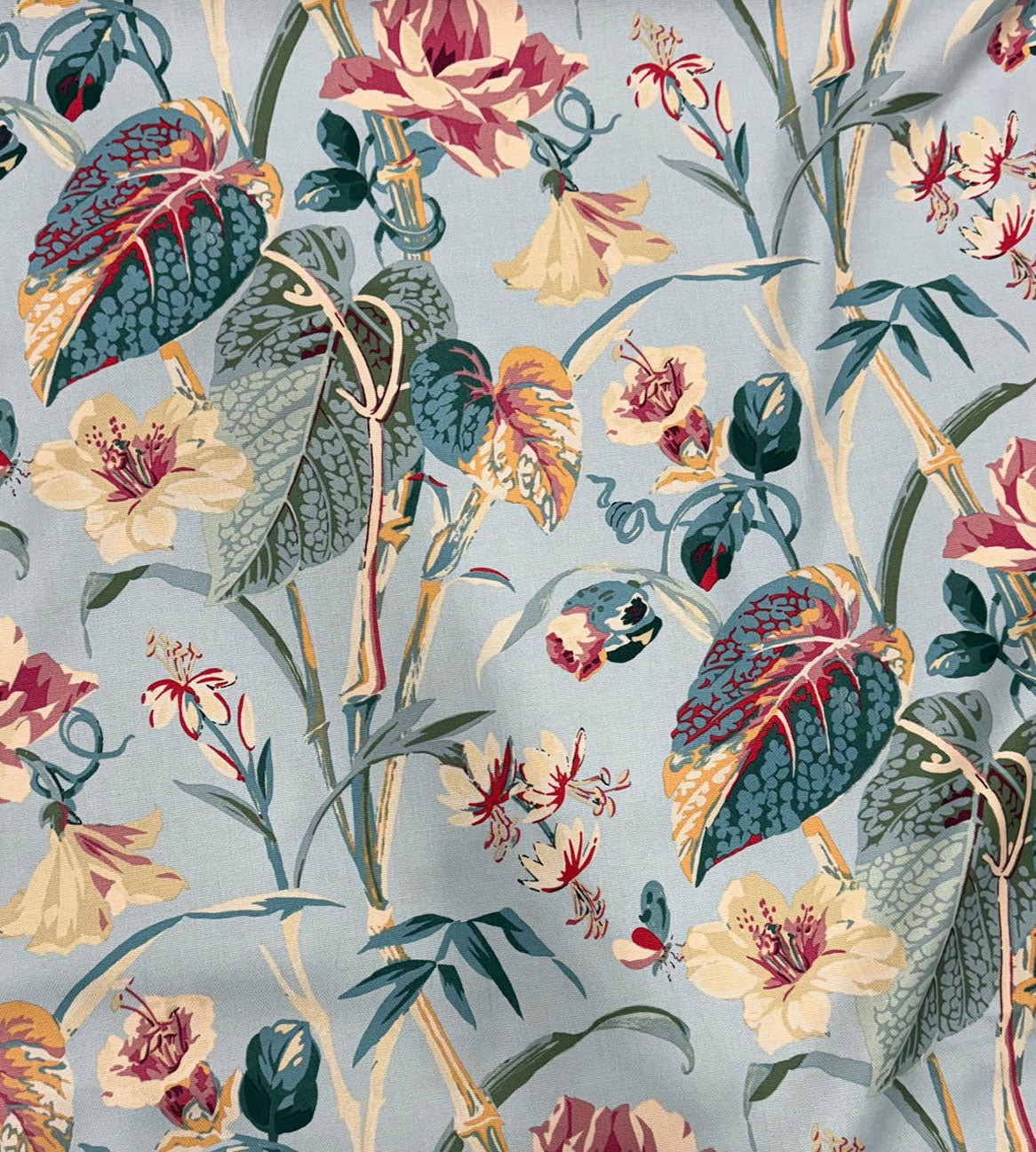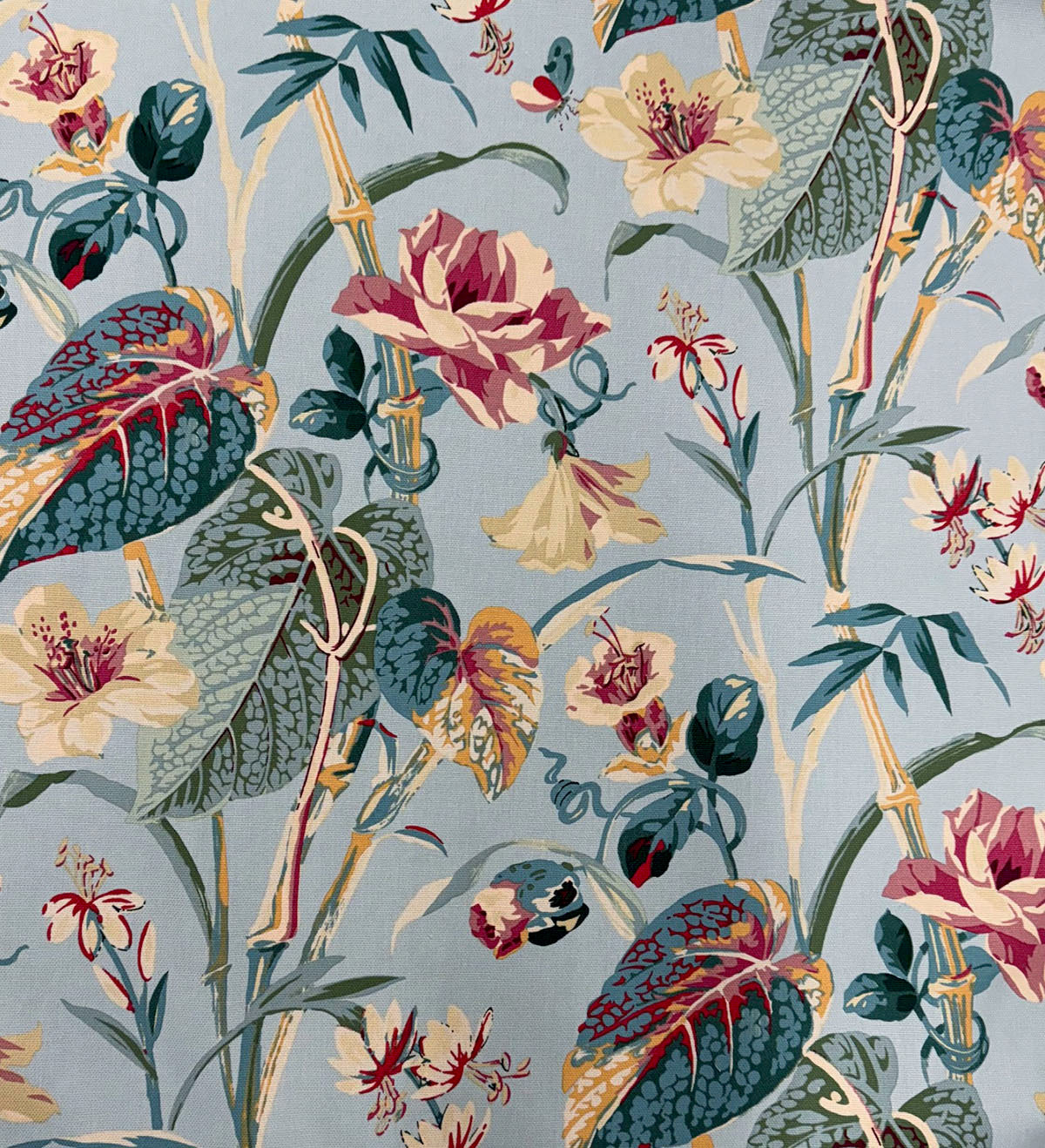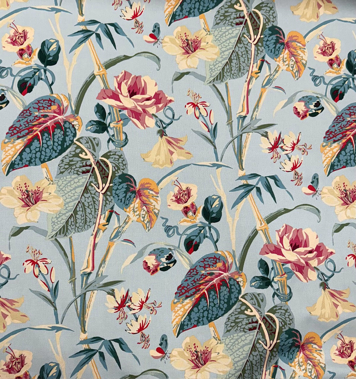 Your Grace in the color Lagoon is a Tropical floral and bamboo print, 54" Wide, 100% Cotton, Repeats: V=27.000", H=13.500"