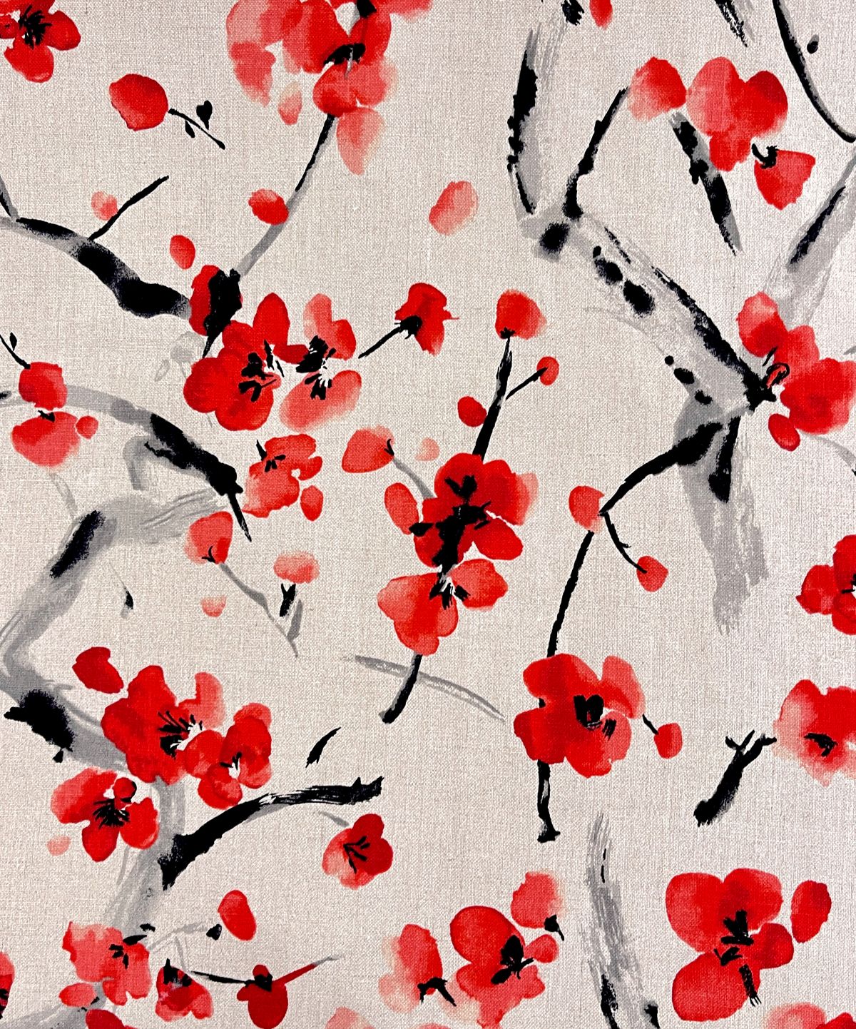 Blossom Festival is a Cherry Blossom Print in red & black with a linen background, 54" wide, 55% Linen 45% Rayon Repeat: H=27" V=25.25" 15,000 Double Rubs