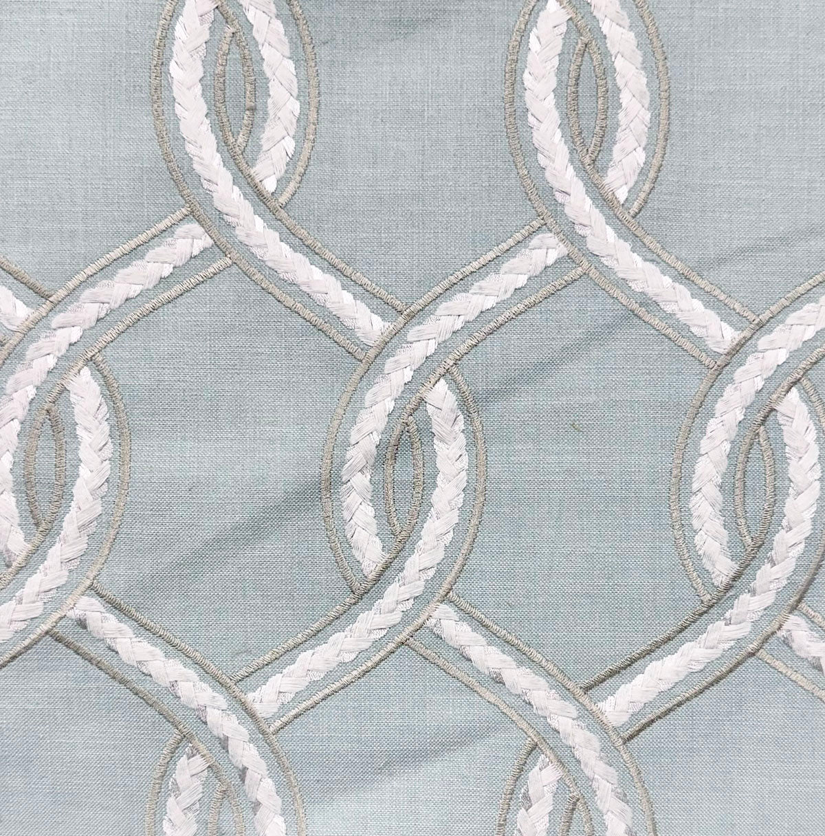 Accomplisher in color Tiffany is a Embroidered Interlocking Ogee fabric, 54" Wide, 73% Cotton 27% Polyester, Repeats: H=4.5" V=9.25" Double Rubs: 30,000