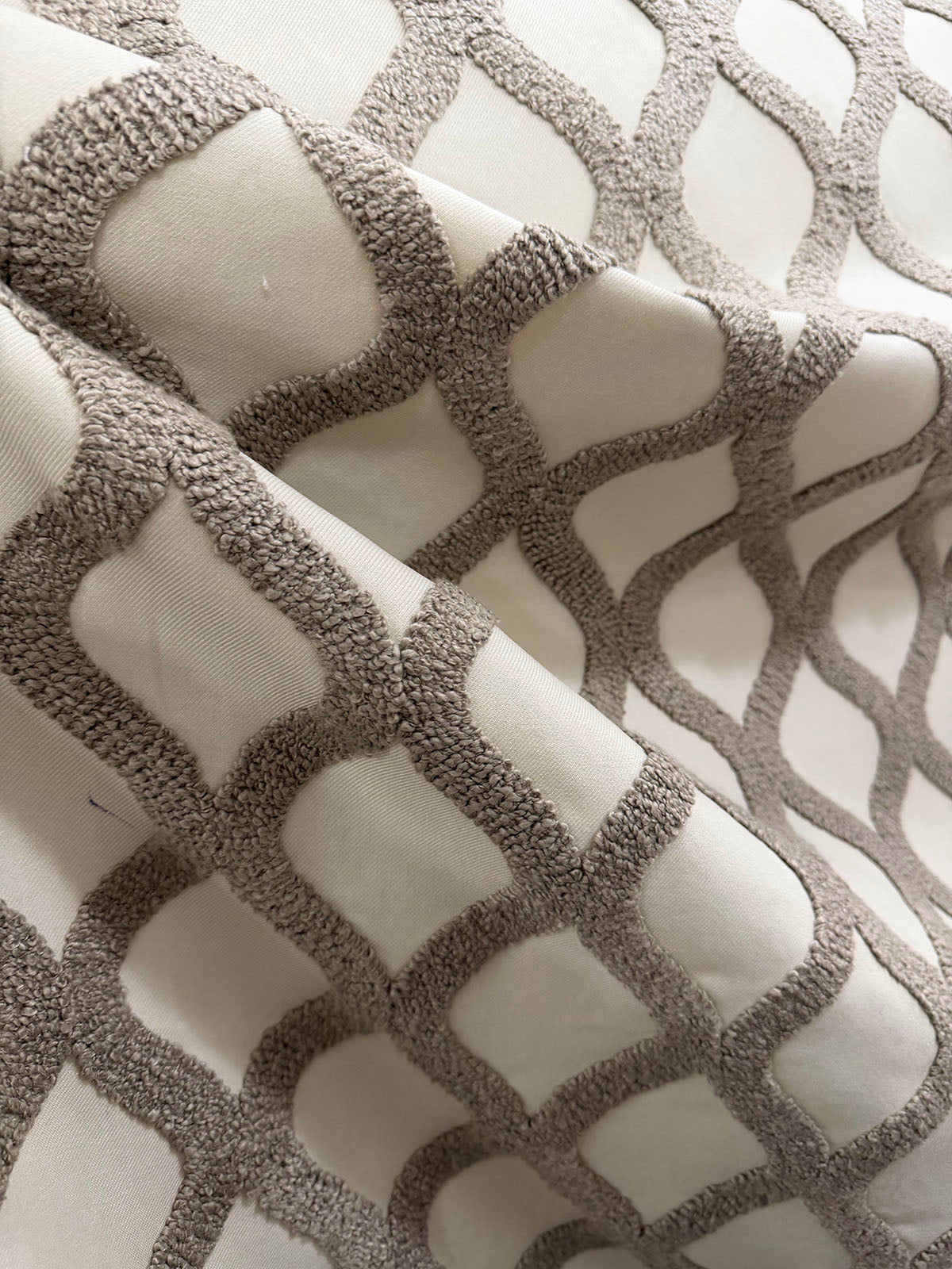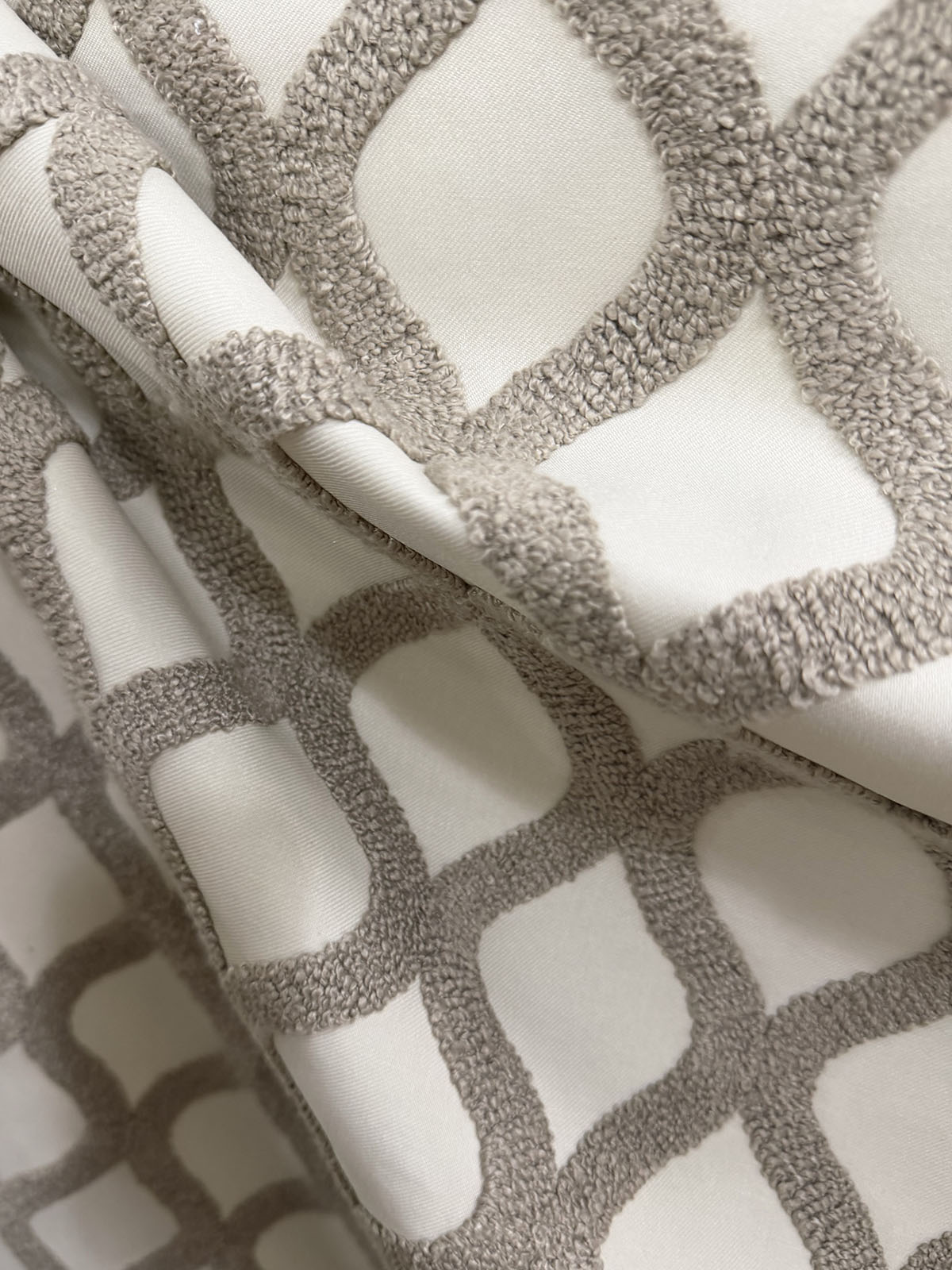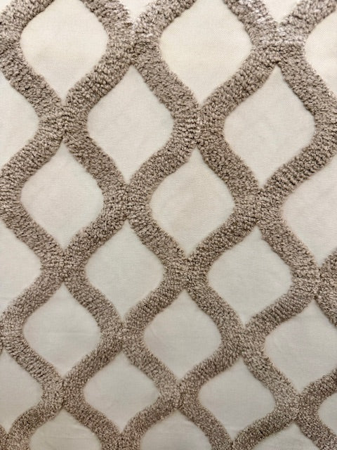 DNA in color Taupe is a Boucle Embroidered Geometric, 54" Wide, 84% Poly 16% Cotton 100% Poly Embroidery, Repeats: H=4.25" V=4.5" Double Rubs: 30,000