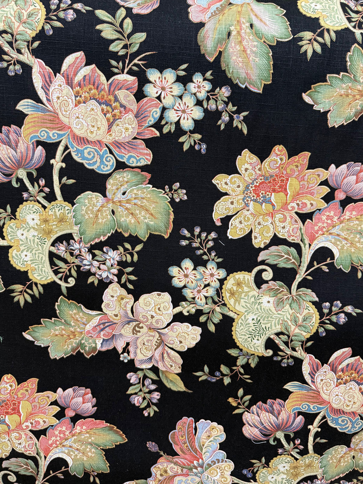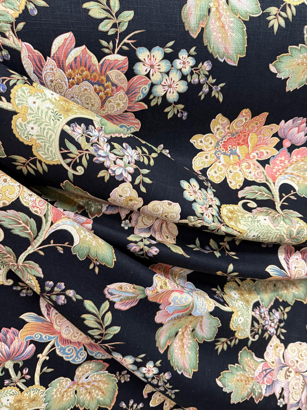Dublique in the color Noir is a Floral Print, 54" wide, 55% Linen 45% Rayon. Repeat: V=25.5" H=27.5" Up the roll, Double Rubs 12,000