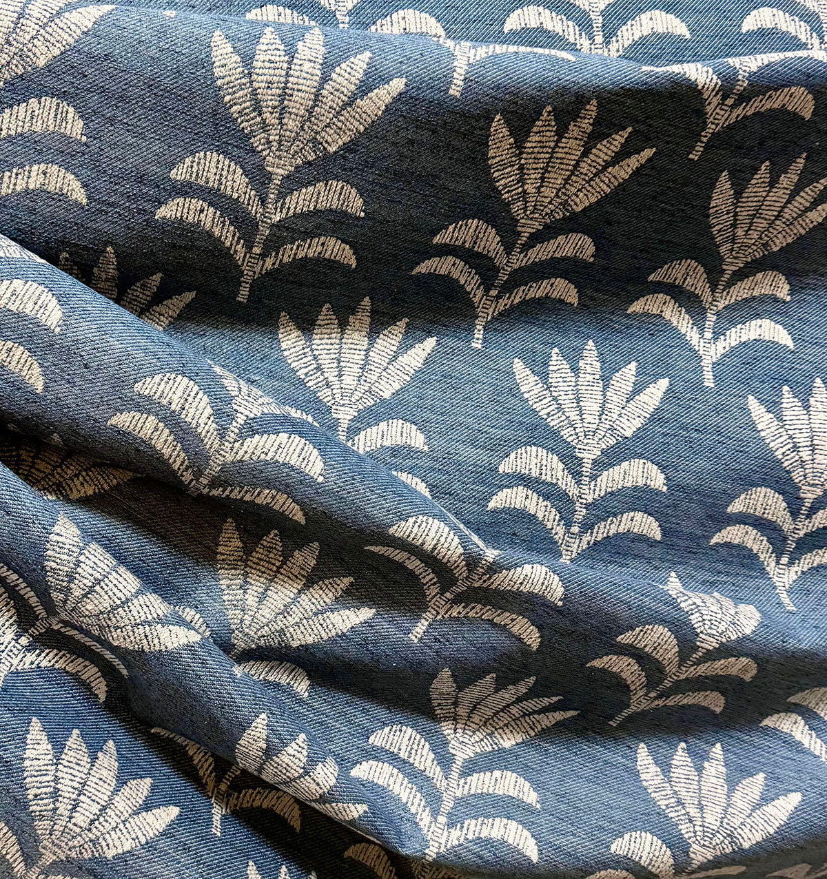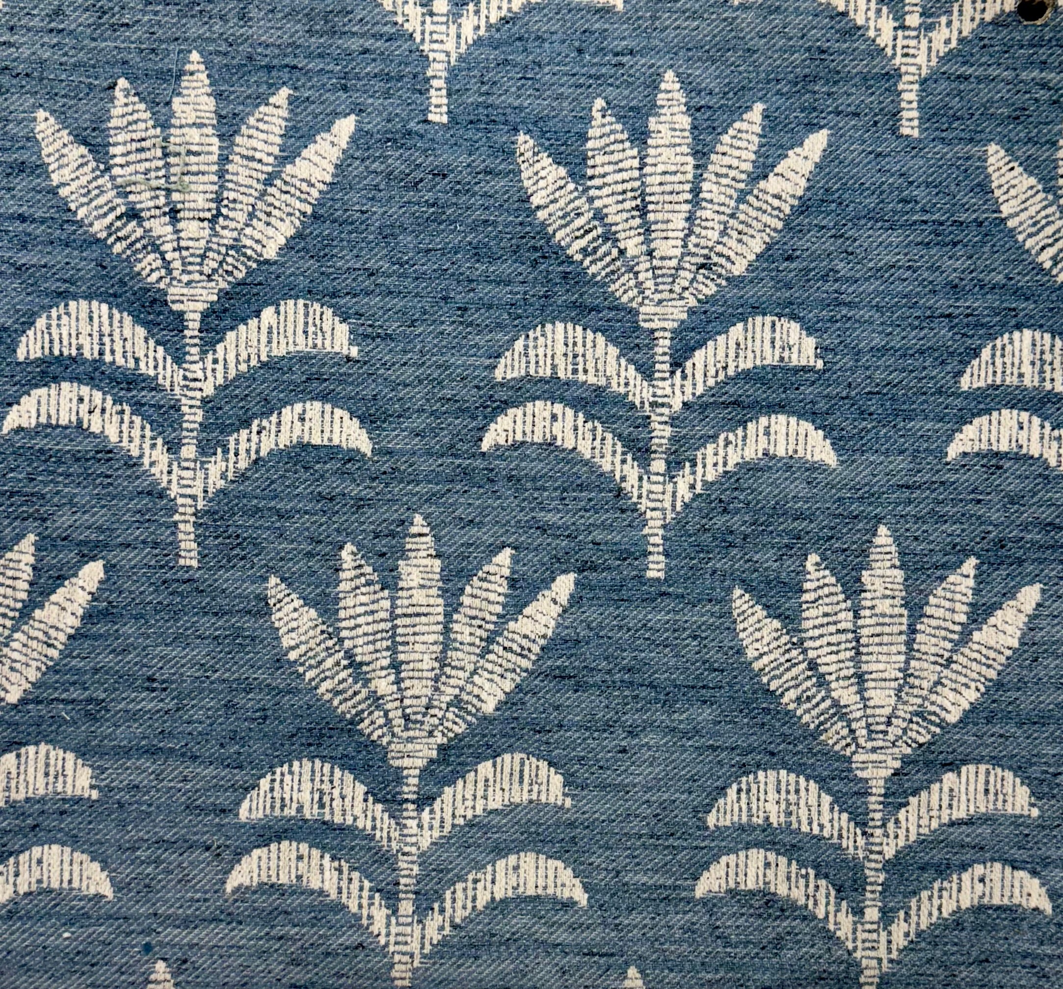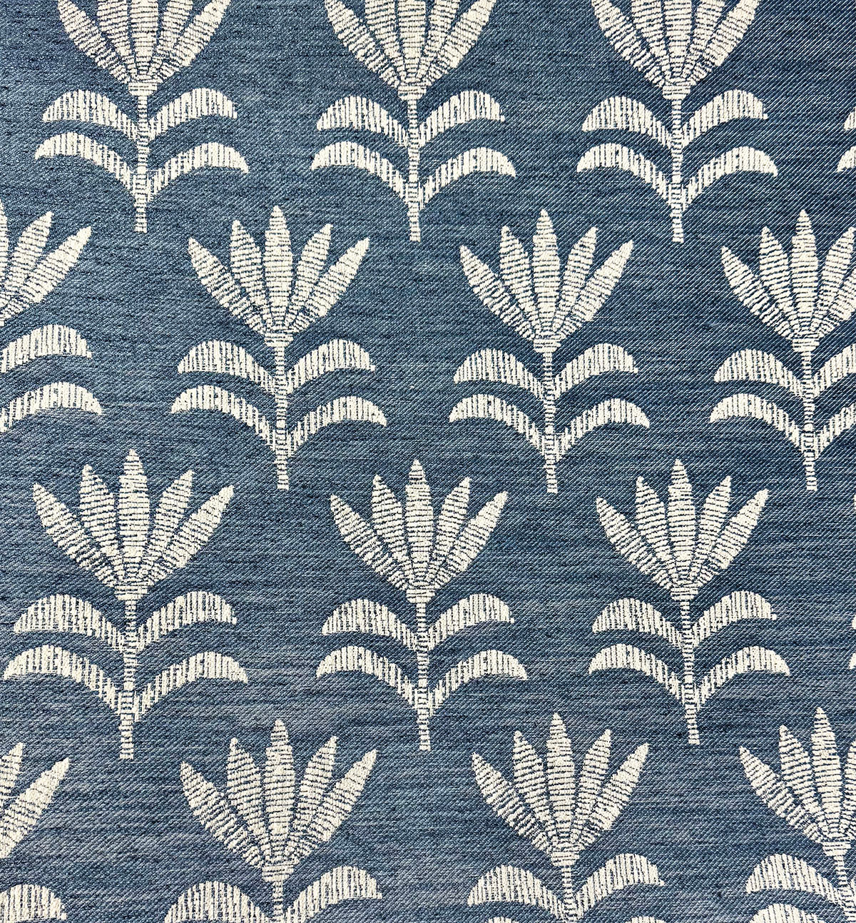 Leaf Fan in the color Denim is a Latex Backed fabric in a Tropical Leaves design, 54" Wide, 45% Recycled Poly 32% Polyester 17% Cotton, Repeats: H=6.875" V=13" Double Rubs: 50,000