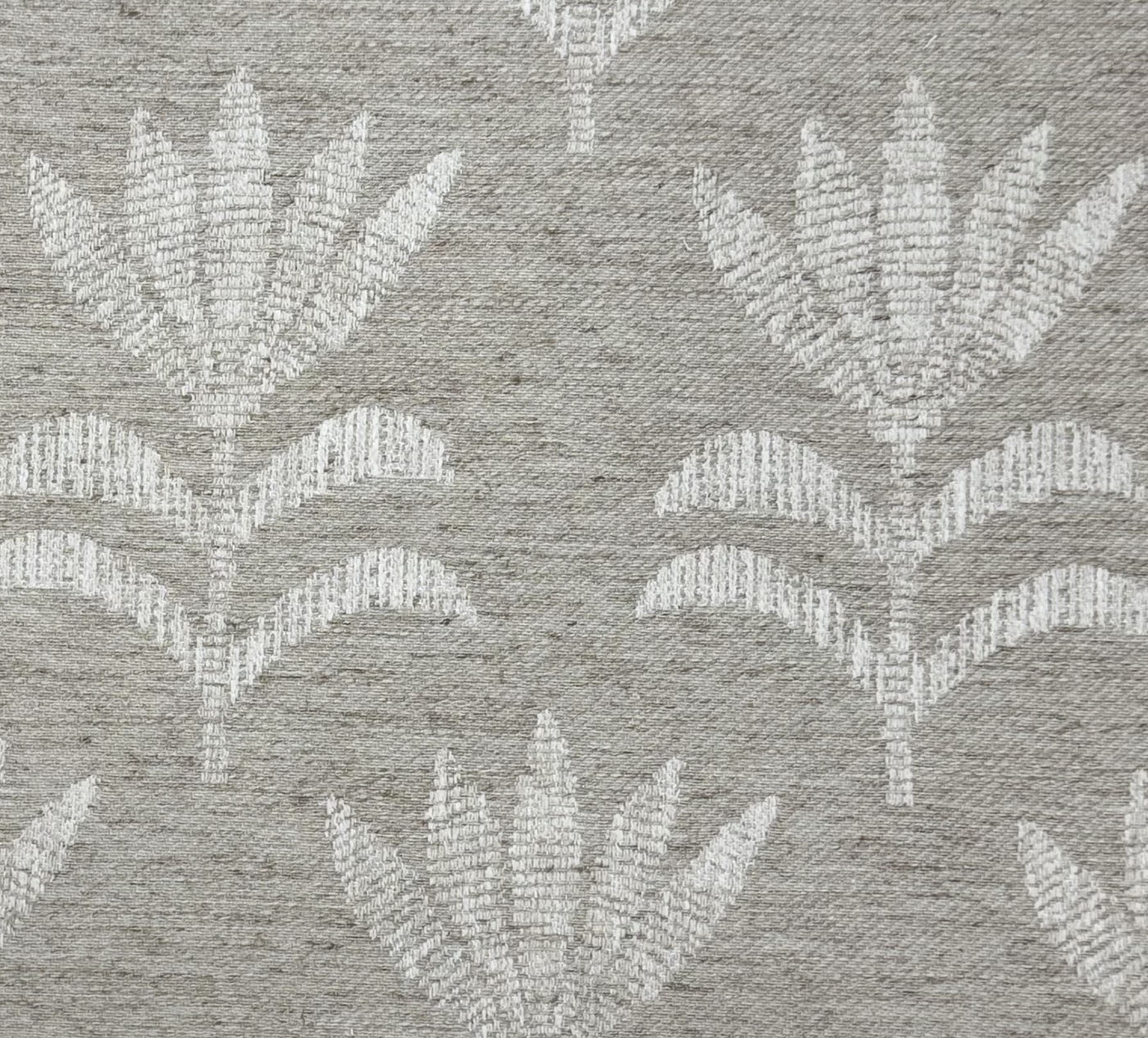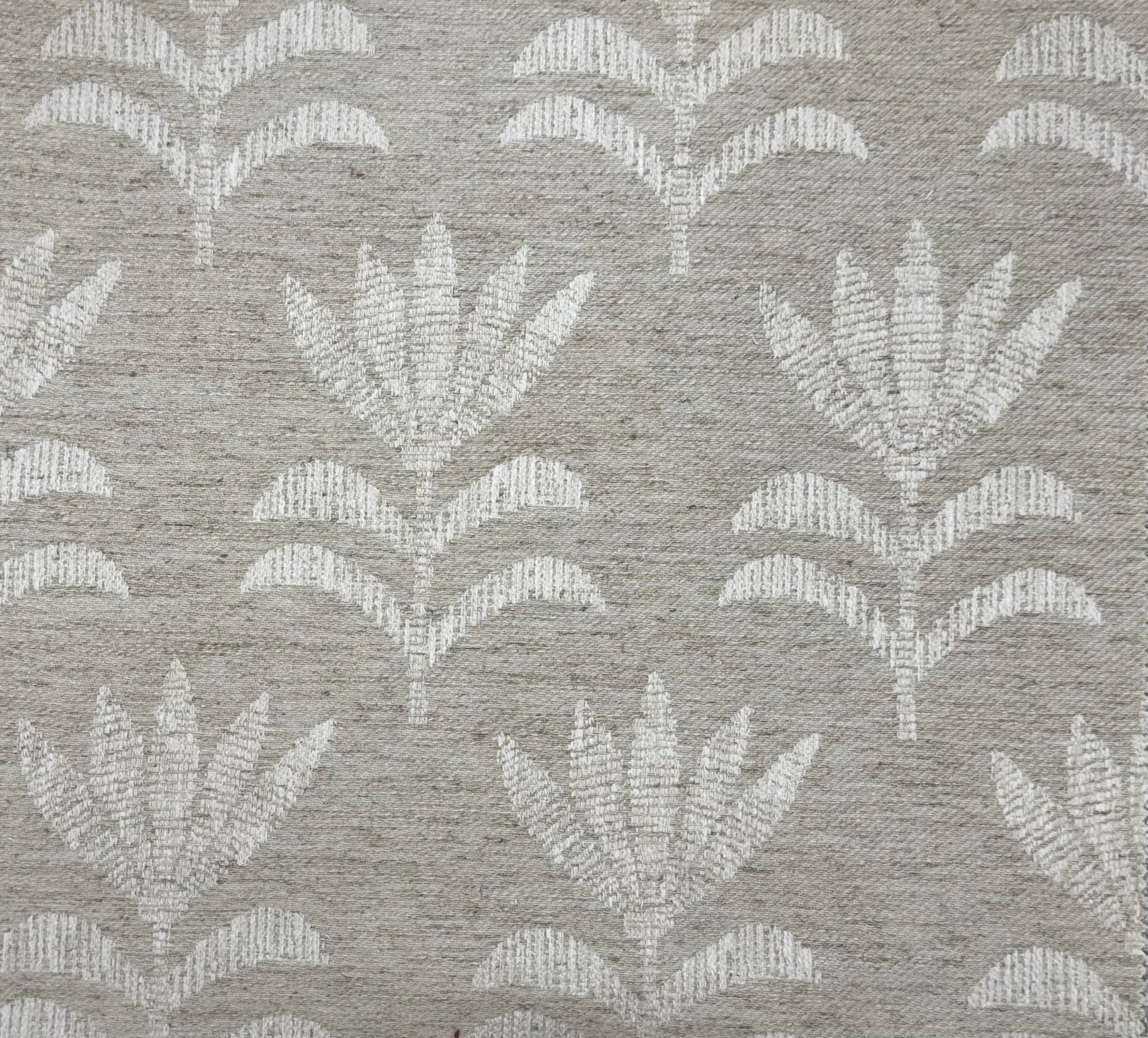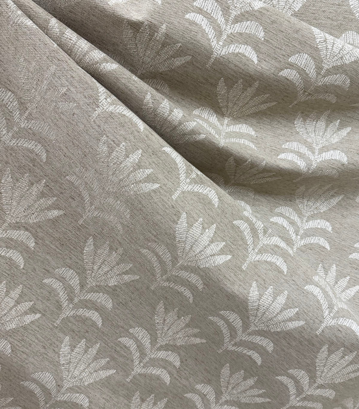 Leaf Fan in the color Flax is a Latex Backed fabric in a Tropical Leaves design, 54" Wide, 45% Recycled Poly 32% Polyester 17% Cotton, Repeats: H=6.875" V=13" Double Rubs: 50,000