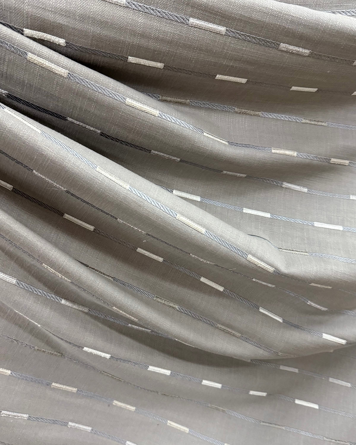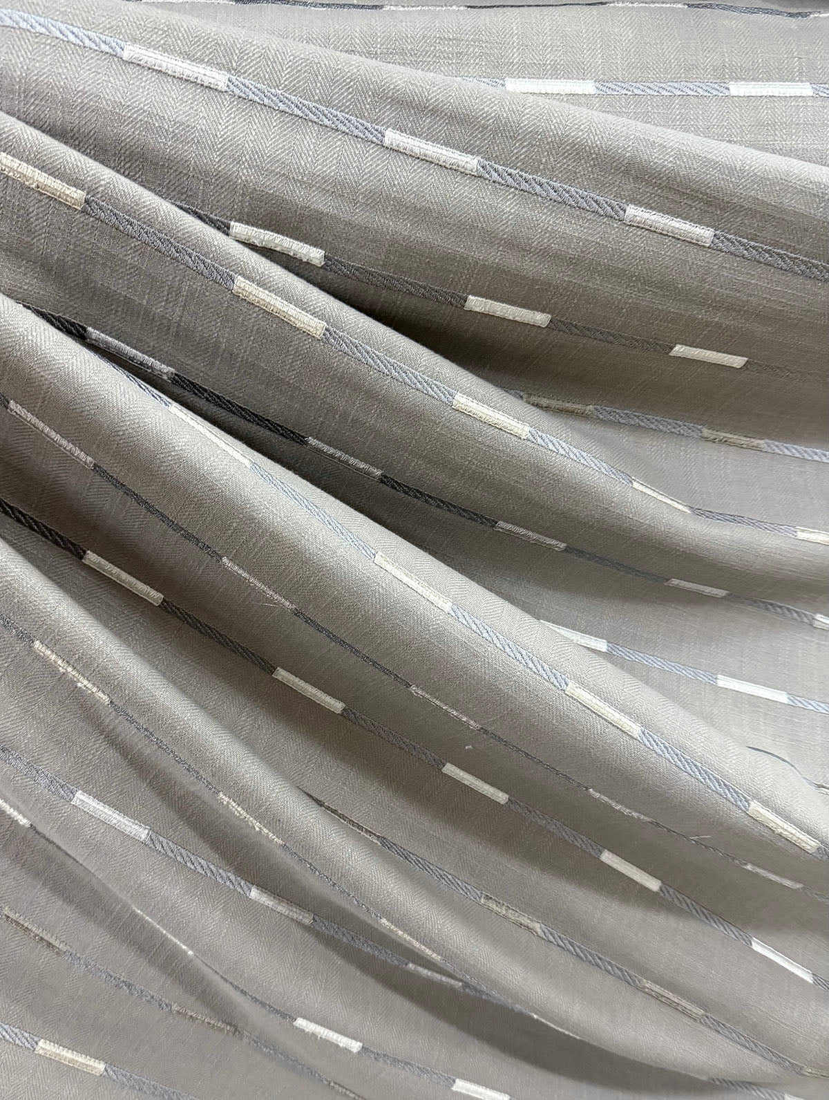 Speed Racer in the color Thunder is an Embroidered Stripe 54" Wide, 20% Polyester 20% Linen 18% Rayon 42% Cotton, Repeats: H=4.375" V=9.125" Double Rubs: 30,000
