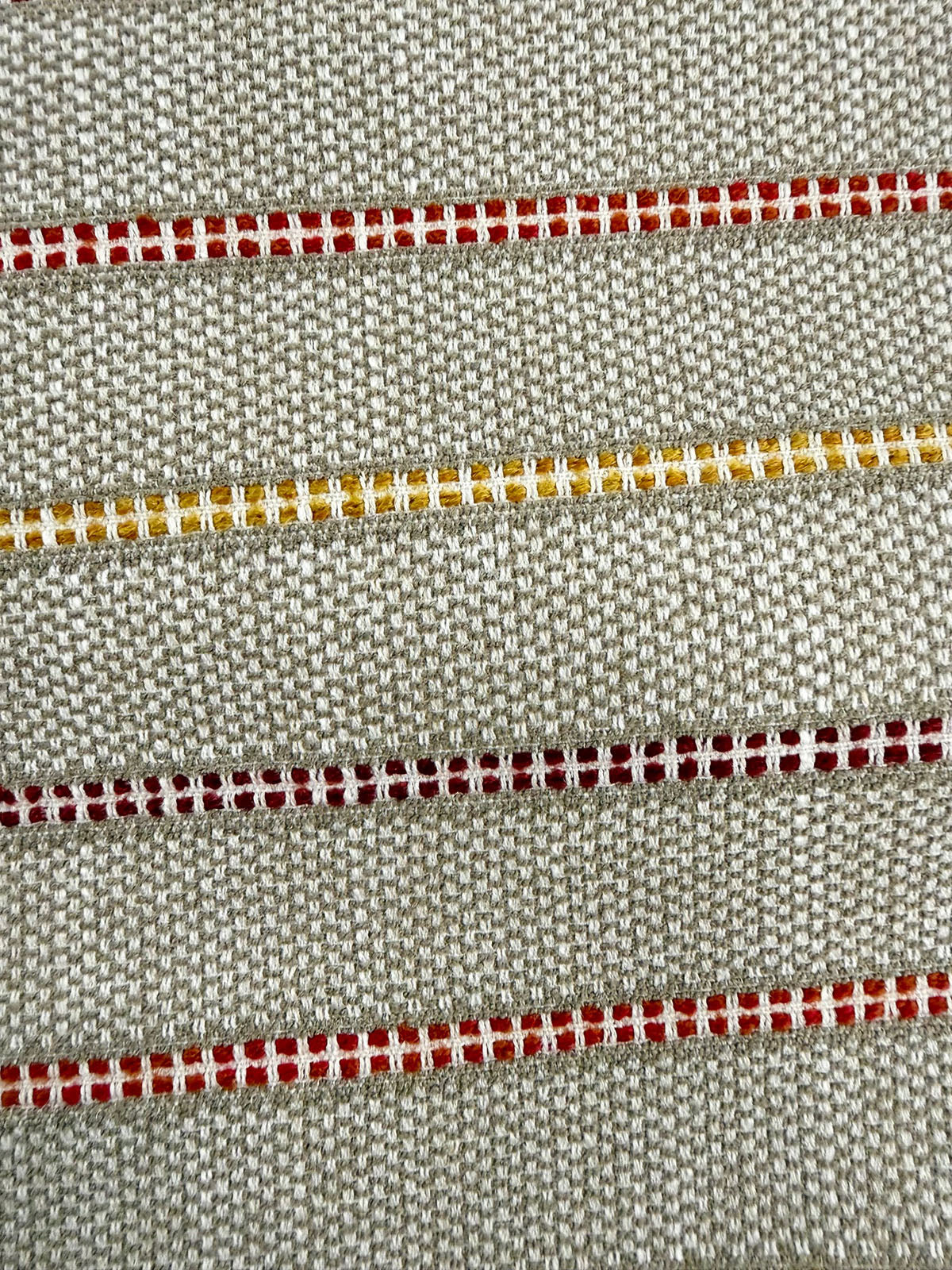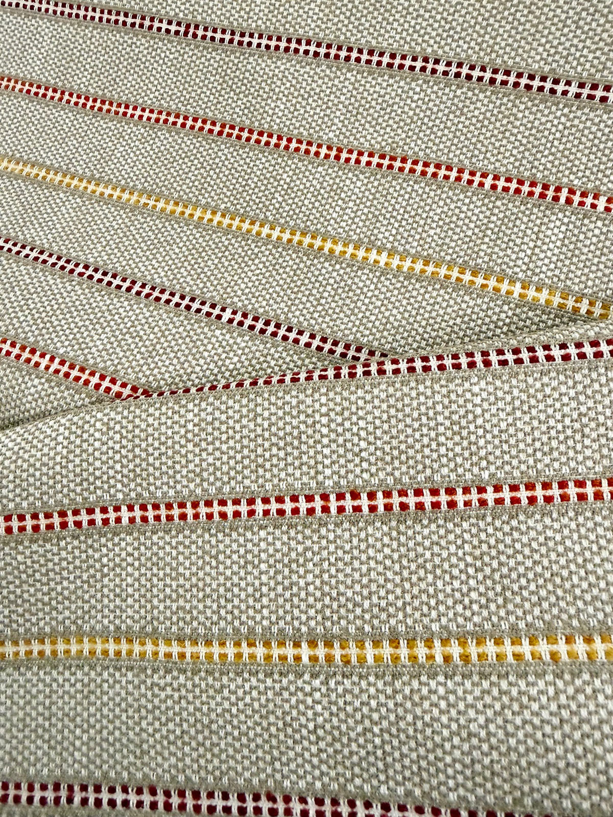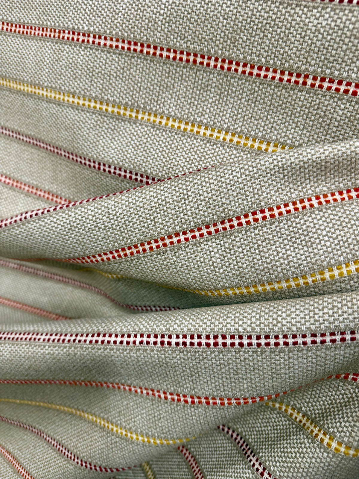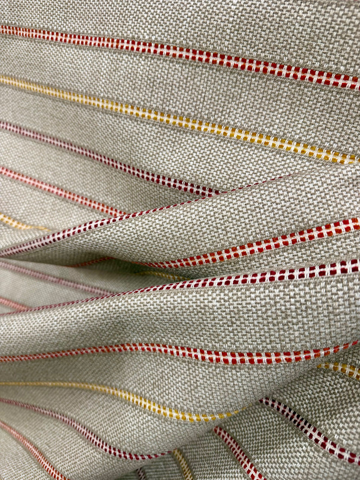 Sunset Stripe is Railroaded Dobby Stripe with Gold, Wine and Coral Stripes, 54" Wide, Content: Polyester, Repeats: H=0" V=5.5" Double Rubs: 15,000