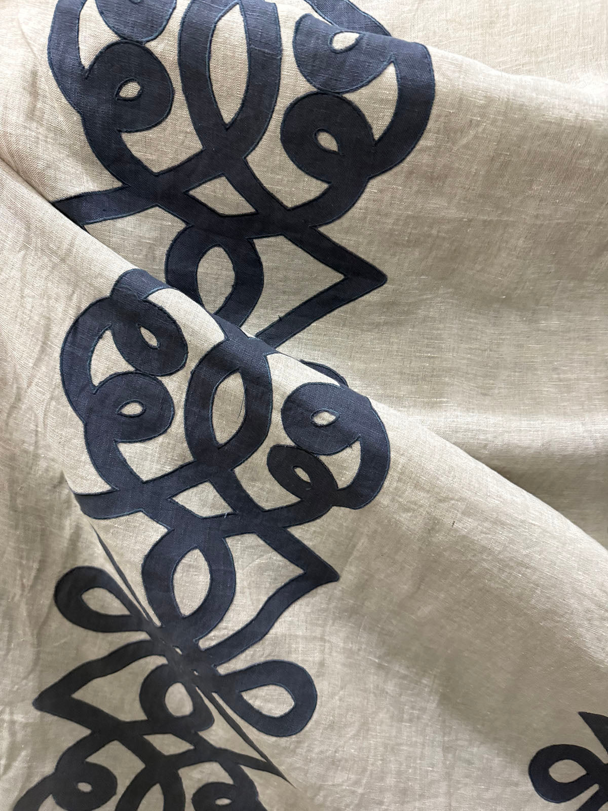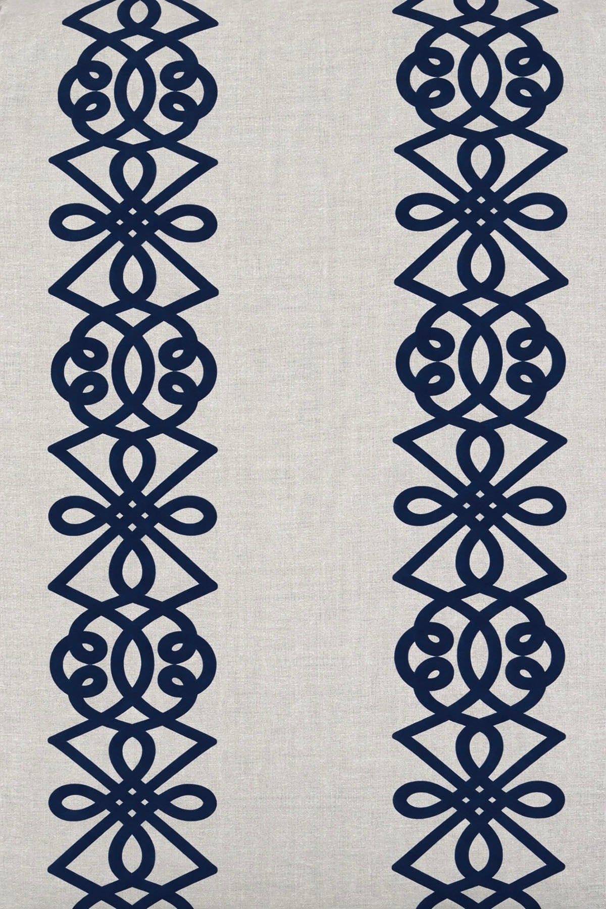 Modern Lattice in color Sky Walker is a Navy & Tan Embroidered Applique Lattice Stripe, 52" Wide, 100% Linen, Emb-100% Viscose, Applique 100% Linen, Repeats: H=17.5" V=15.5"