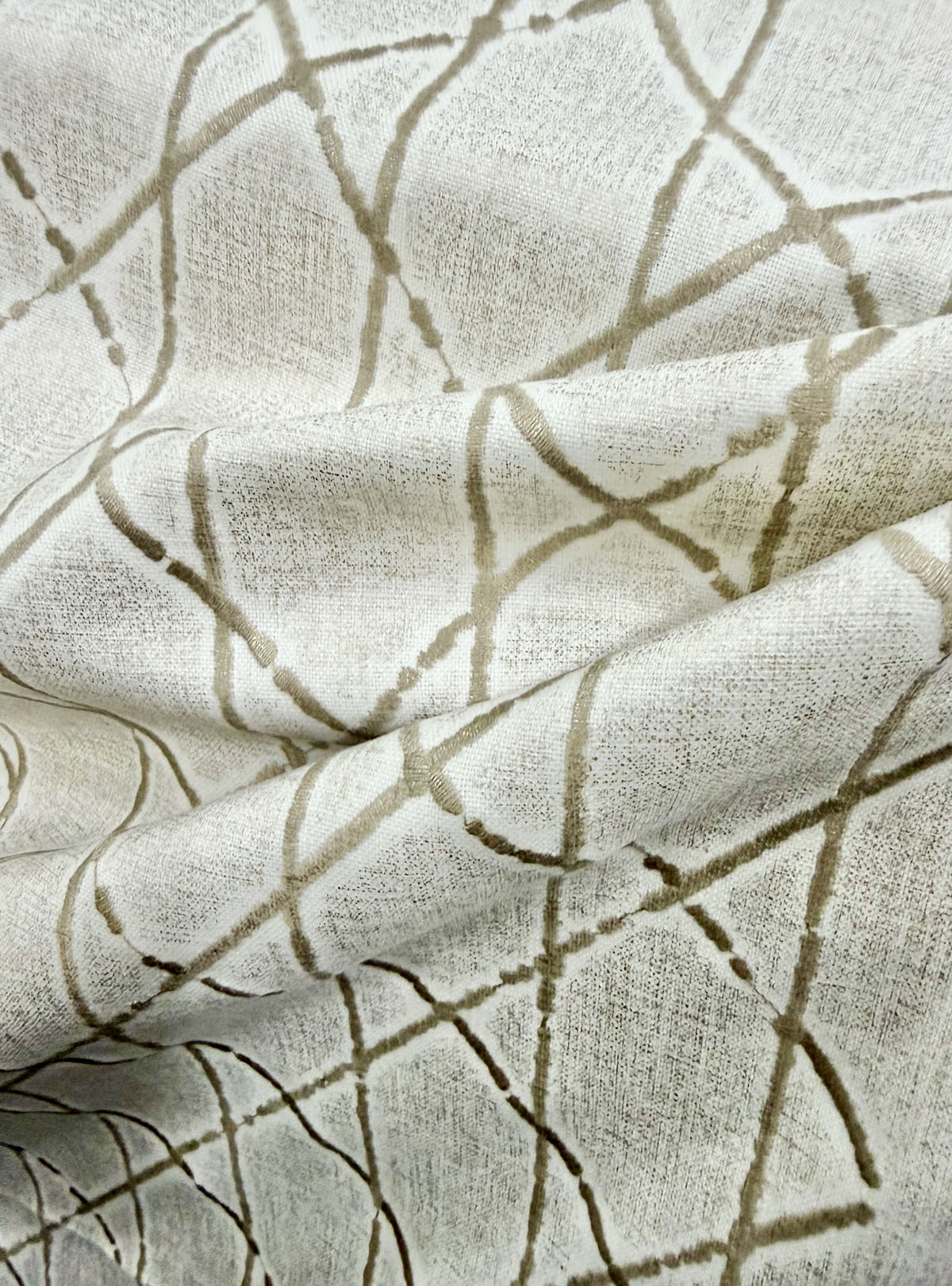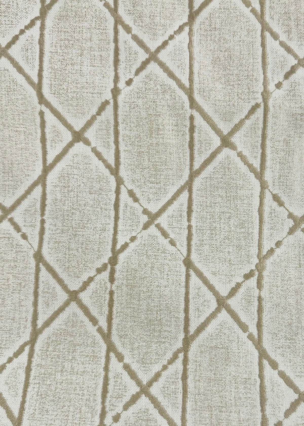 Monzonite in color Frosted Gilt is a Metallic Embroidered Distressed Diamond, 51" Wide, 30% Linen 70% Poly, Emb-100% Viscose, Repeats: H=8.5" V=9.25"