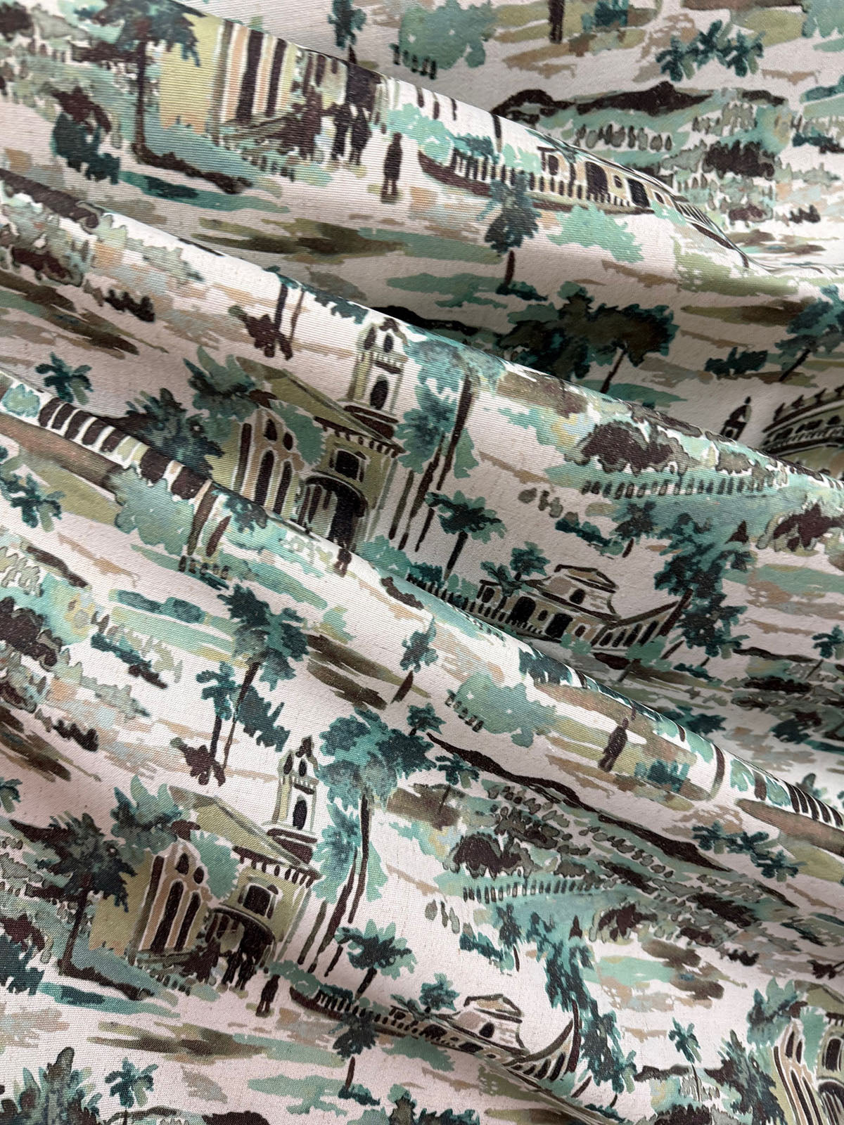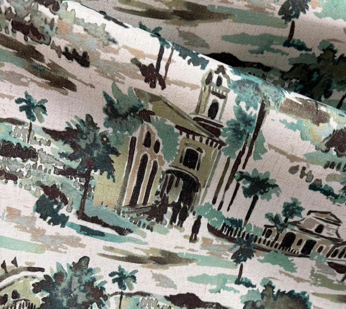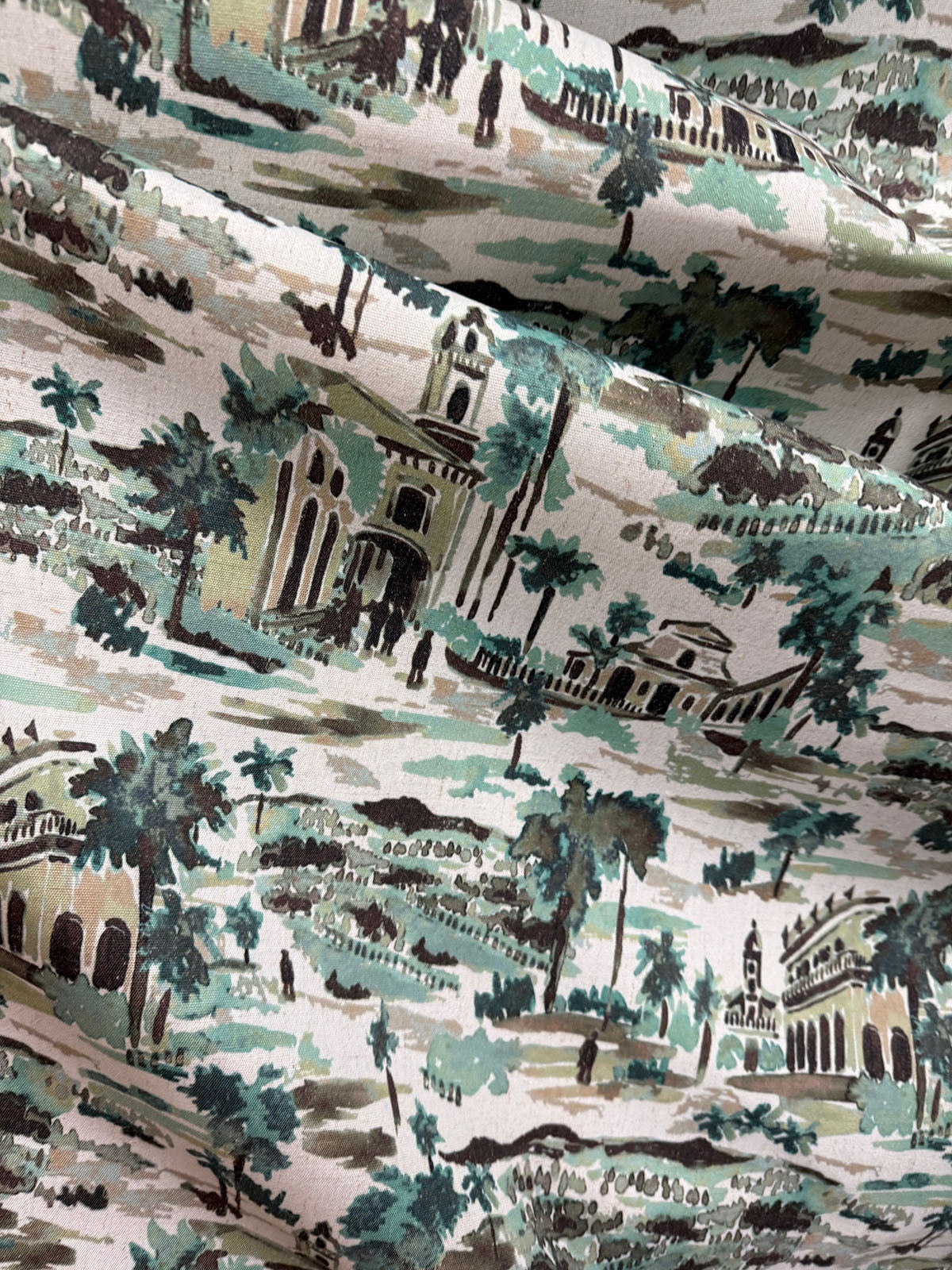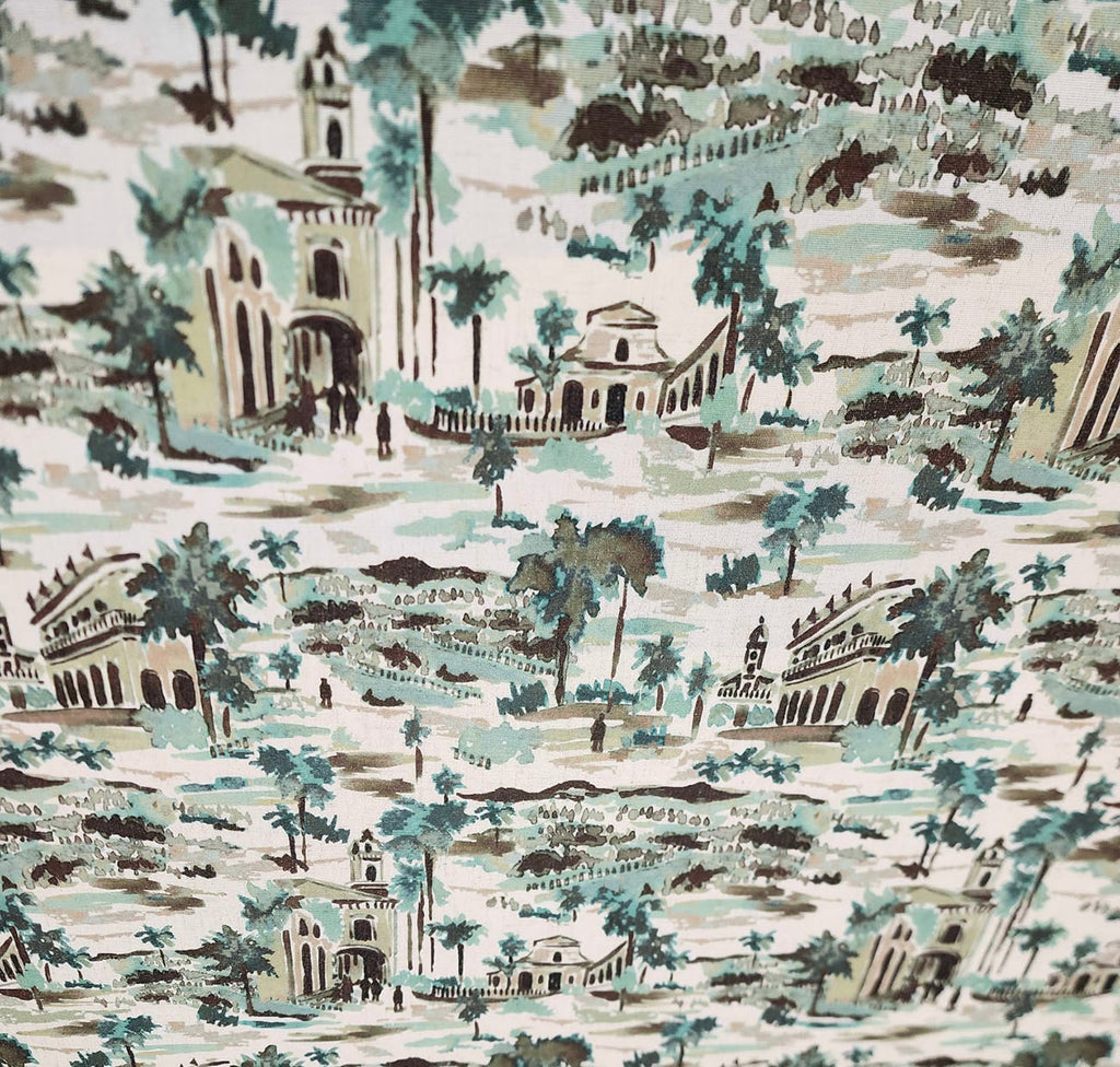 R-Cuban Village in the color Sea is an Abstract Village Scene Toile, 54" Wide, 100% Cotton, Repeats: H=4.5" V-4.5" Double Rubs: 15,000