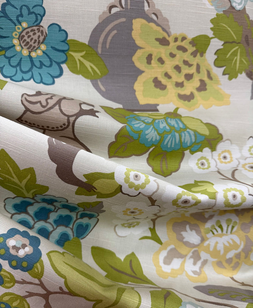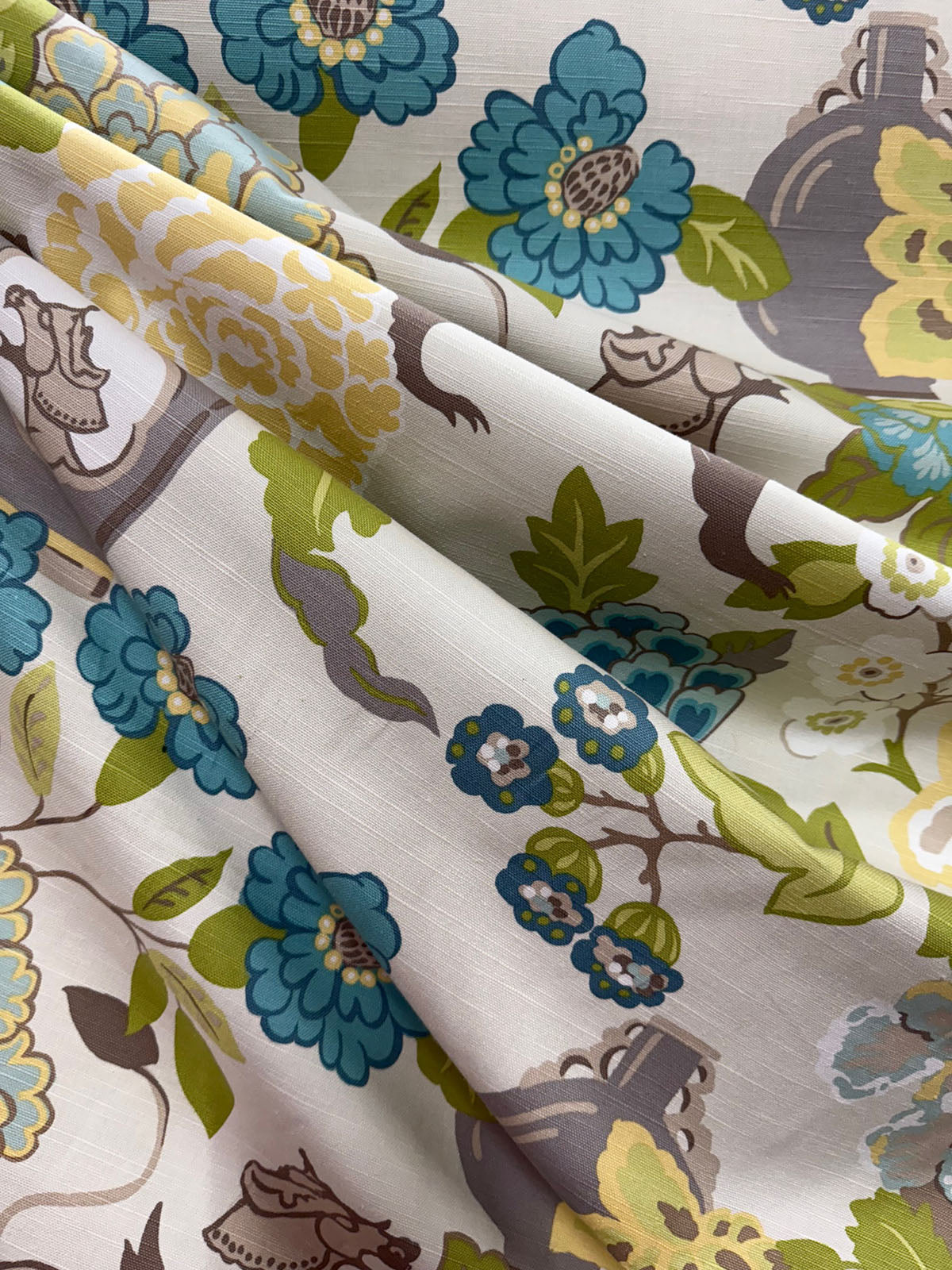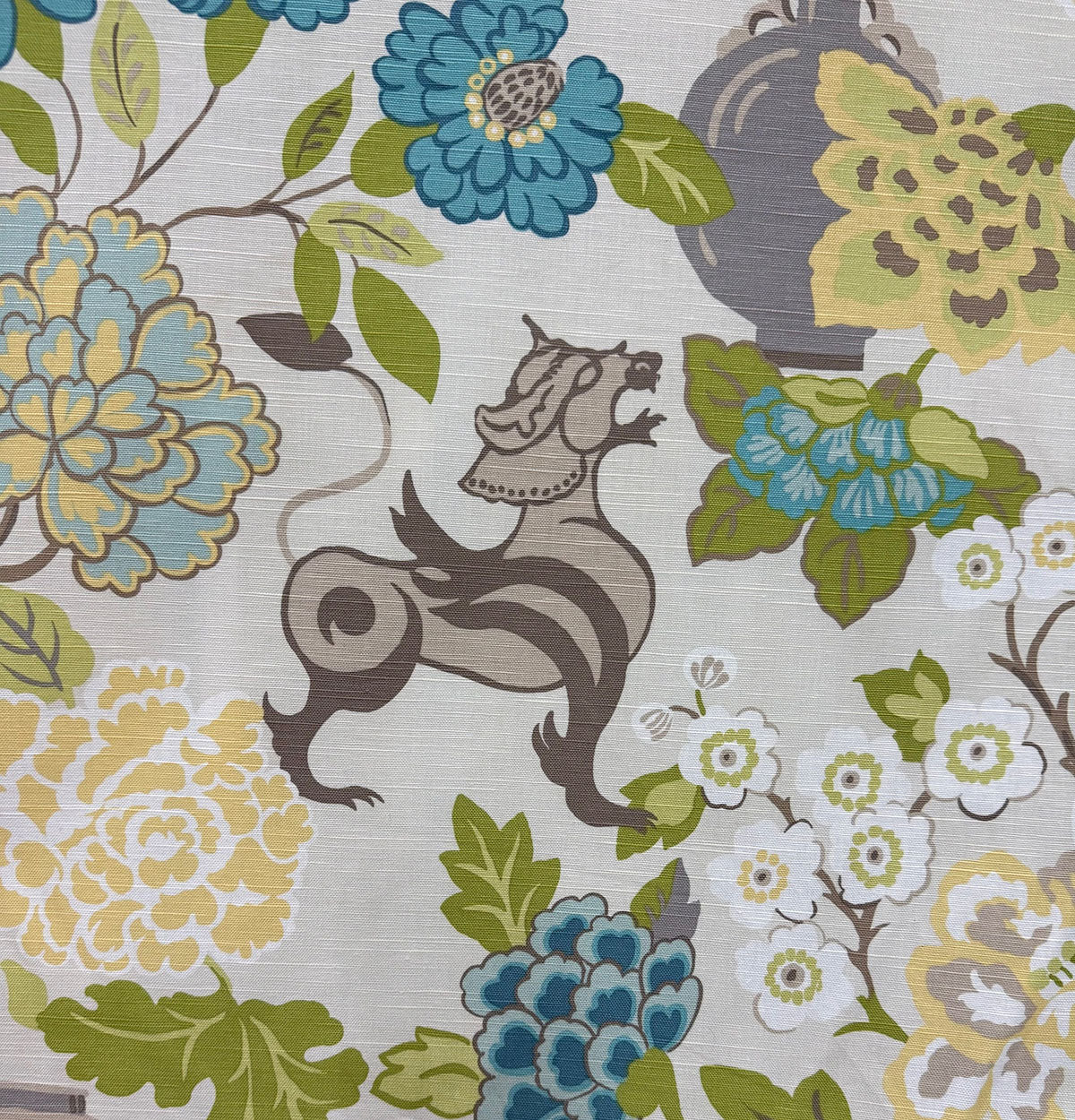 03373 in the color Aqua is an Asian Floral with Foo Dog designed by Vern Kip. 54" wide, 44% Cotton, 31% Linen, 25% Rayon. Repeats: H=27" V=27" Double Rubs: 15,000