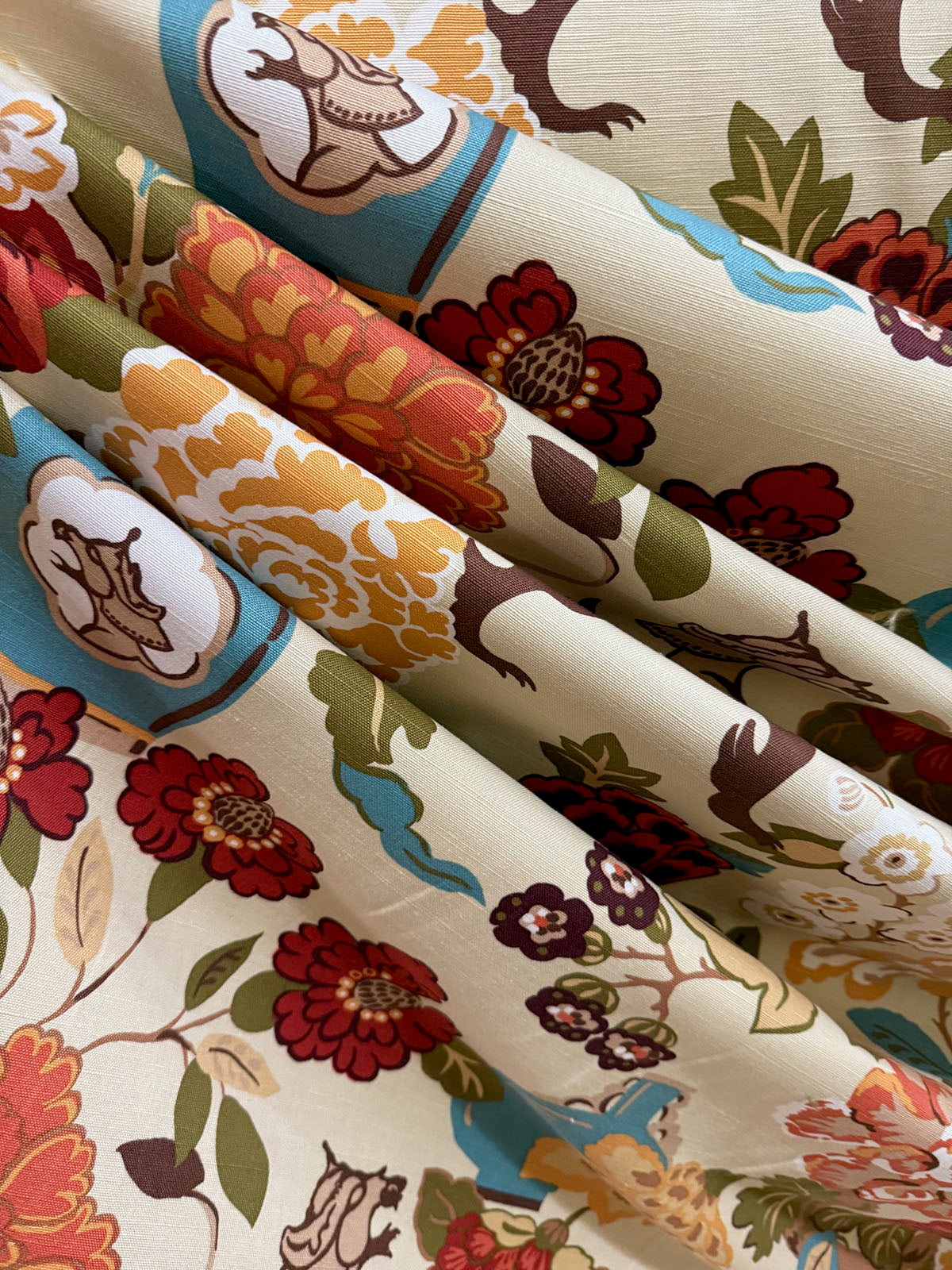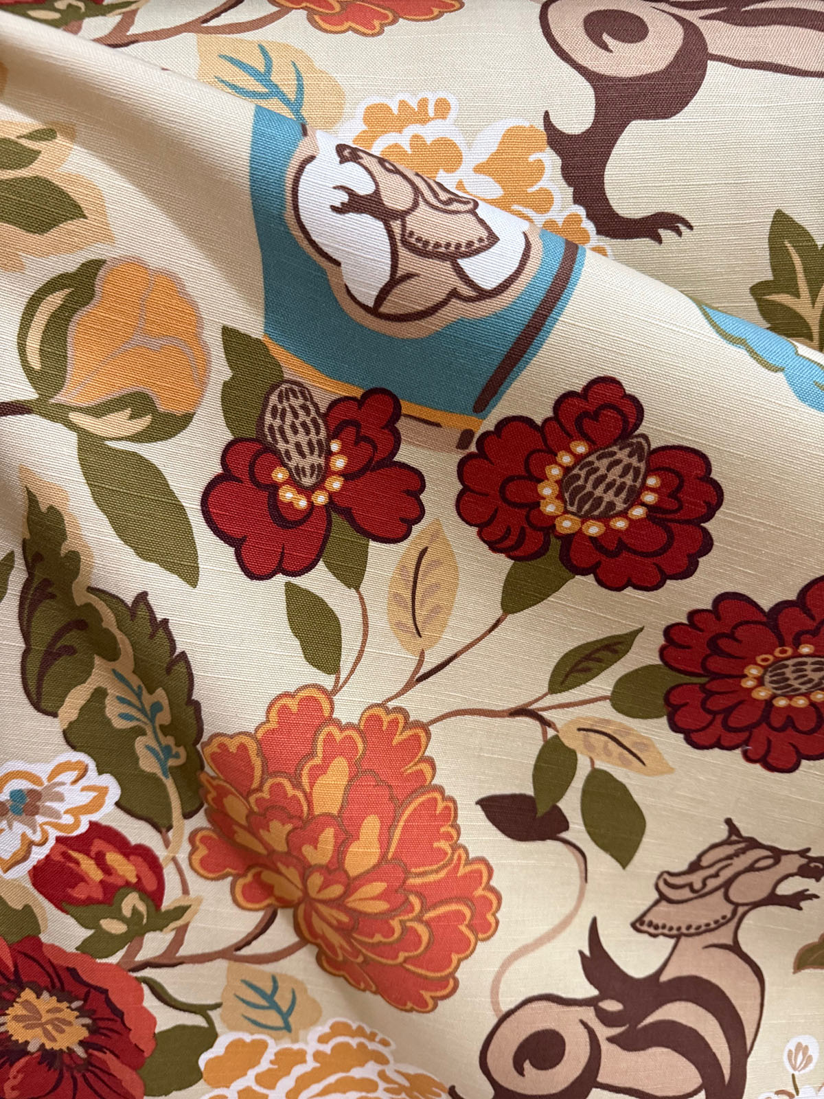 03373 in the color Spice is an Asian Floral with Foo Dog designed by Vern Kip. 54" wide, 44% Cotton, 31% Linen, 25% Rayon. Repeats: H=27" V=27" Double Rubs: 15,000