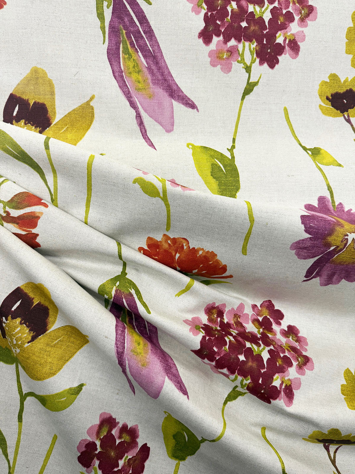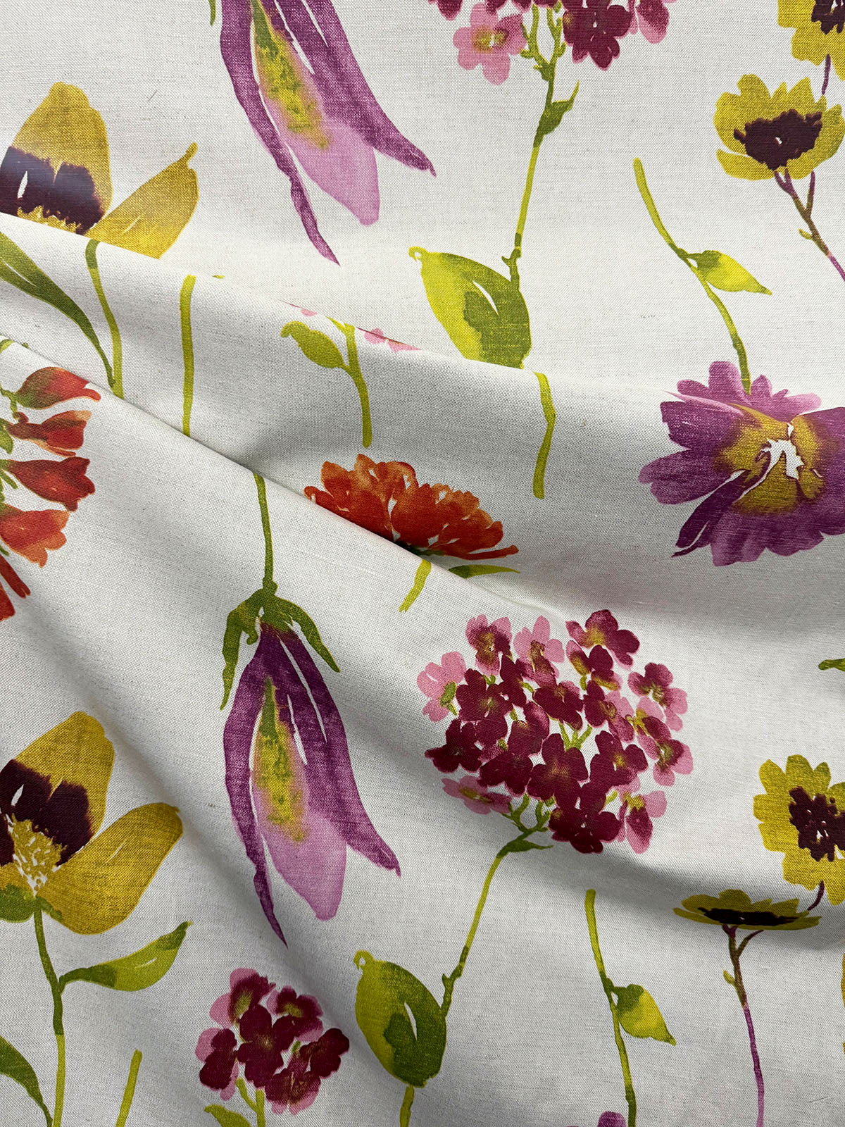 2502a is a Tegan-Red on Natural Floral Print by Stroheim, 54" wide, 53% Linen 47% Cotton, Repeats: H=29.5" V=25" Double Rubs: 51,000