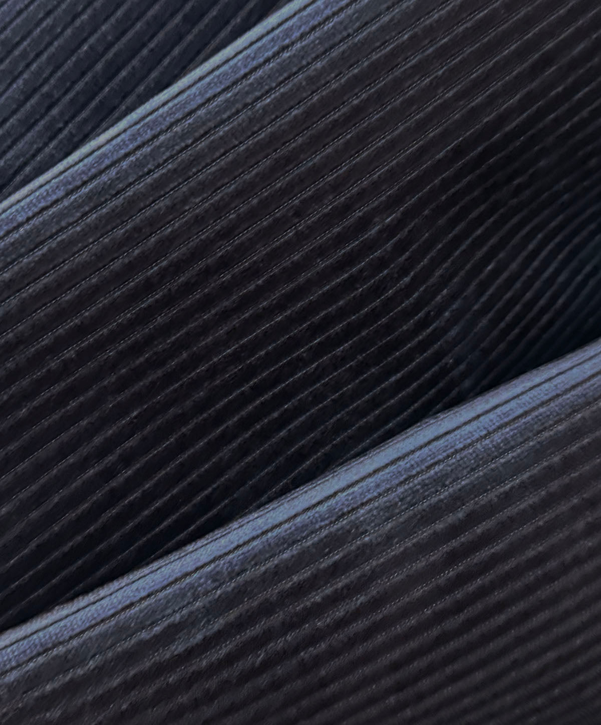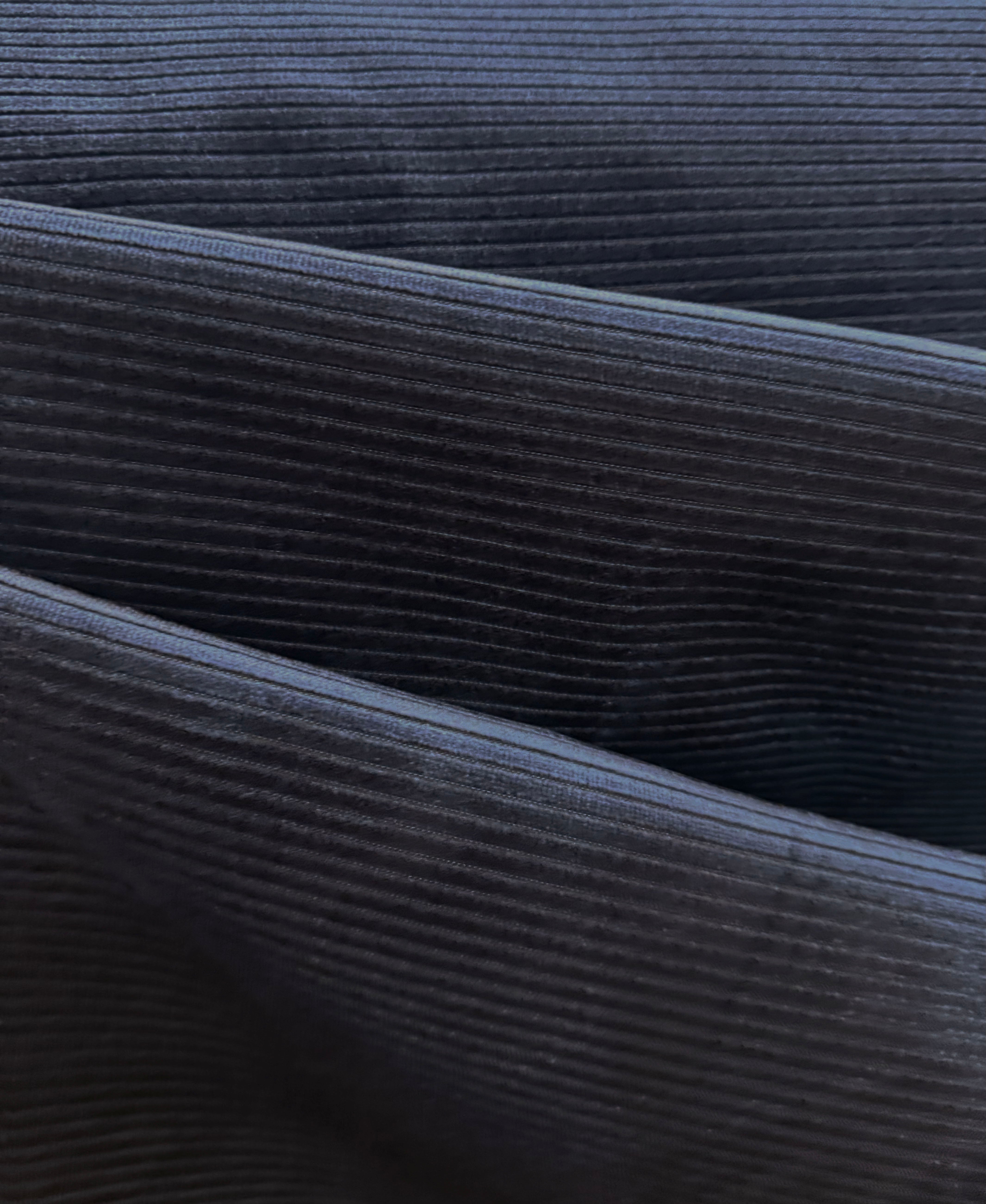 Tuxedo in the color Bluestone is a Ribbed Velvet fabric in a Steel Blue color shade, 54" Wide, 43% Polyester 57% Rayon, Repeats: H=0.25" V=0" Double Rubs:15,000