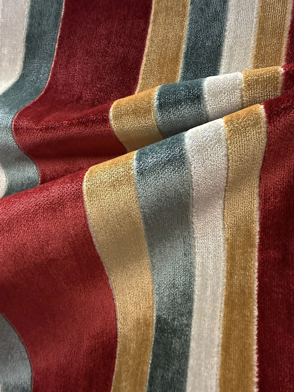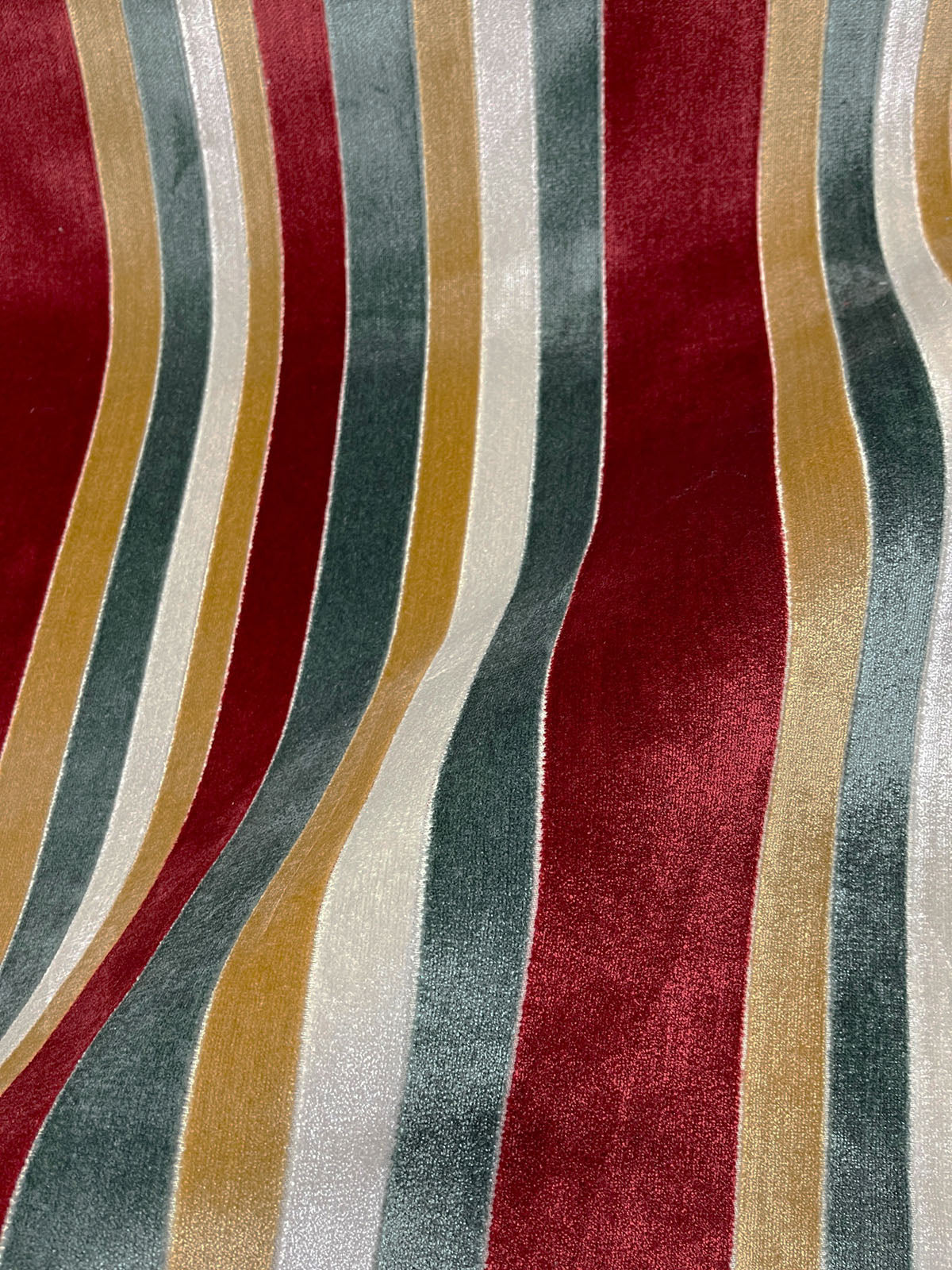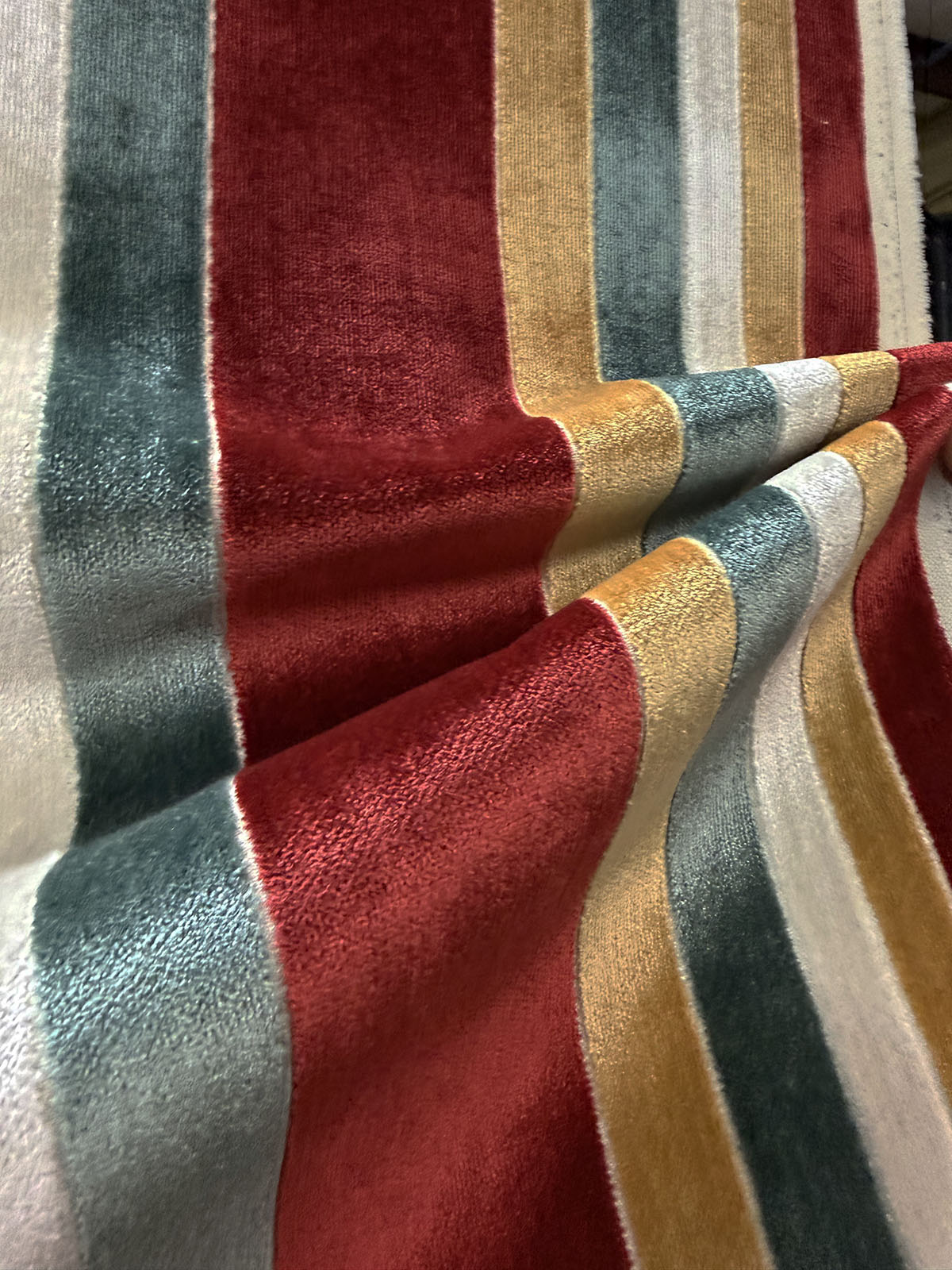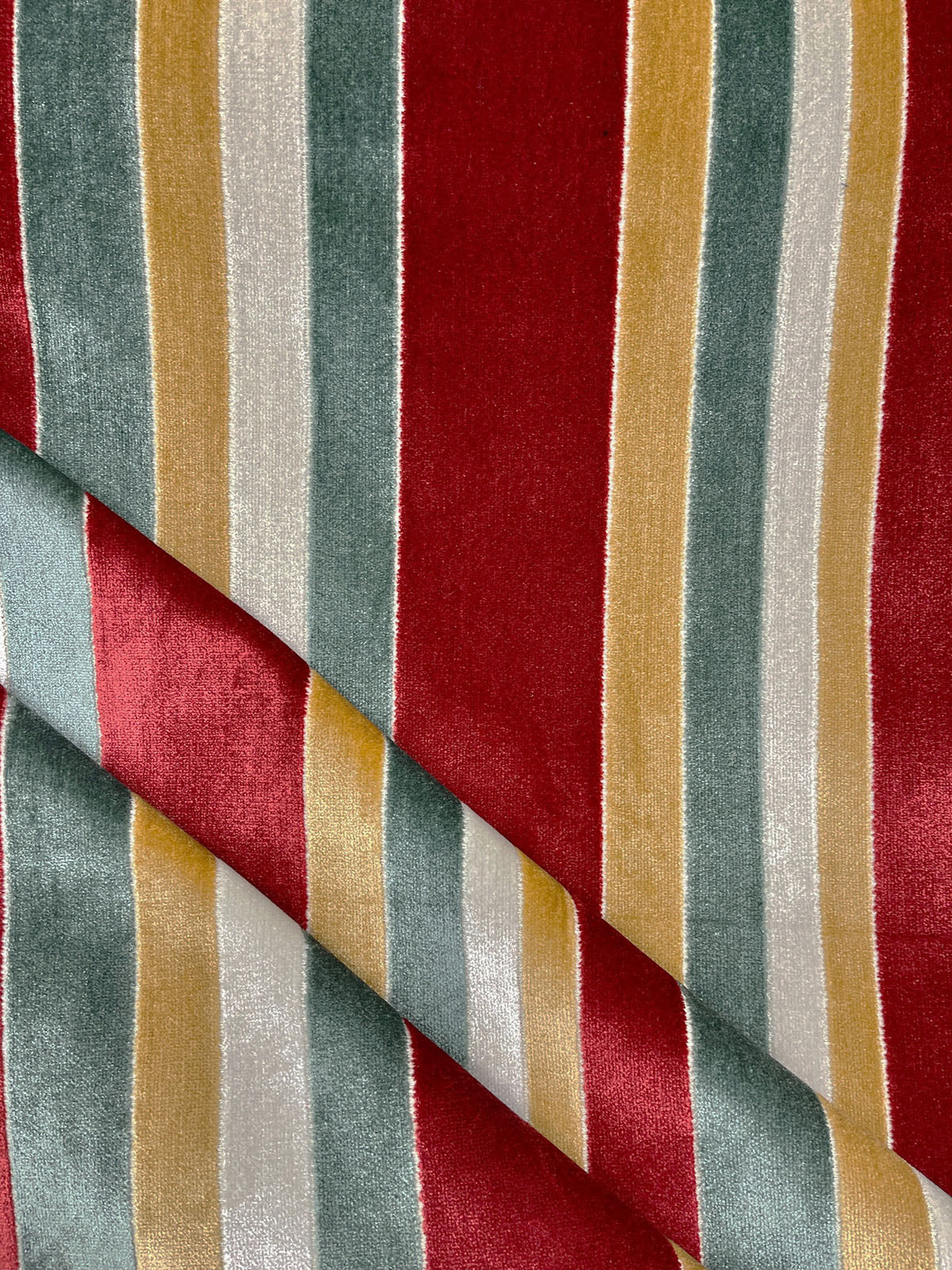 K-Sequel in color Berry is a Red, Gold & Teal UTR Awning Stripe Velvet , 54" Wide, 60% Rayon 40% Polyester, Repeats: H=14.25" V=0" Double Rubs: 18,000