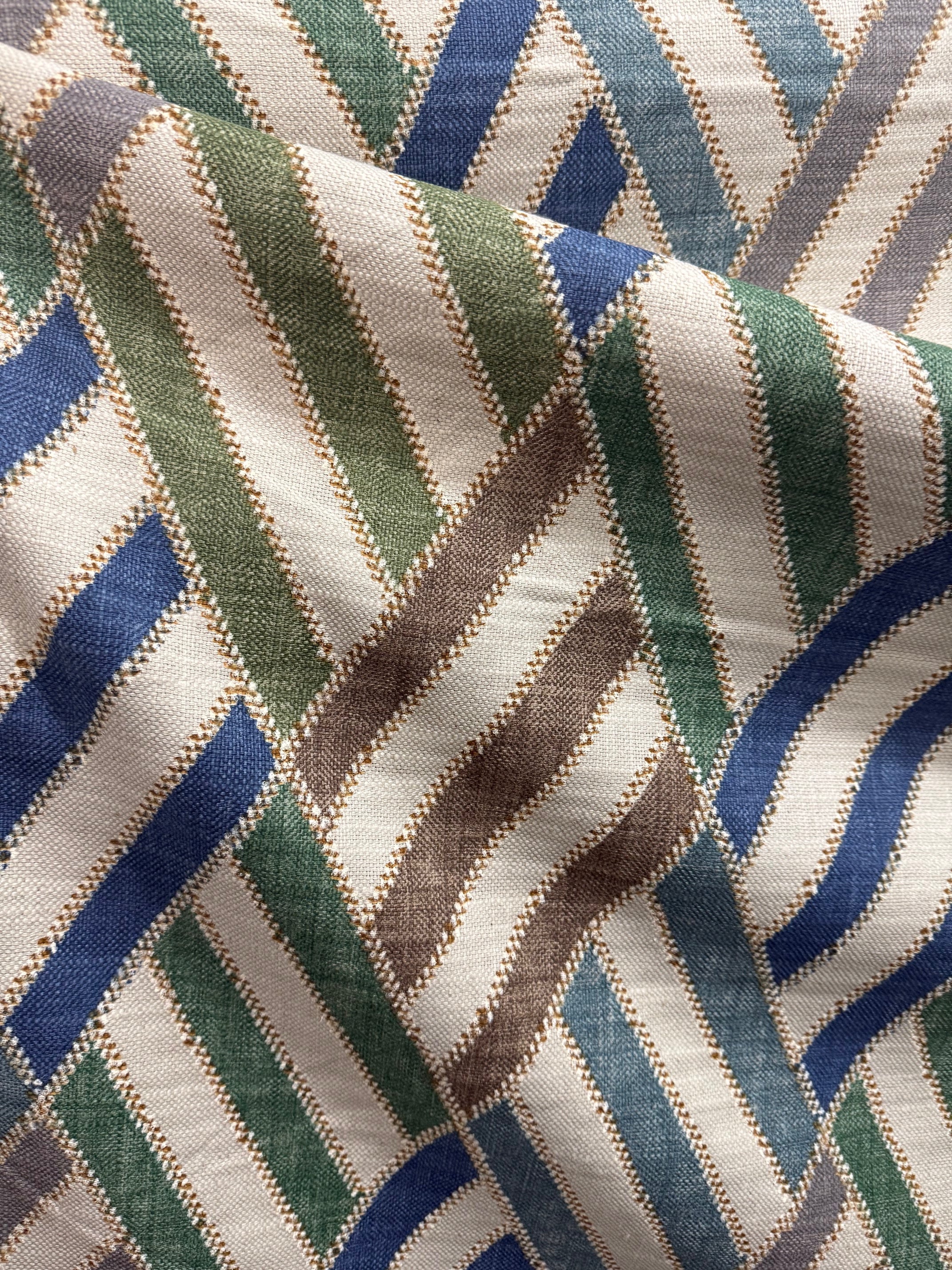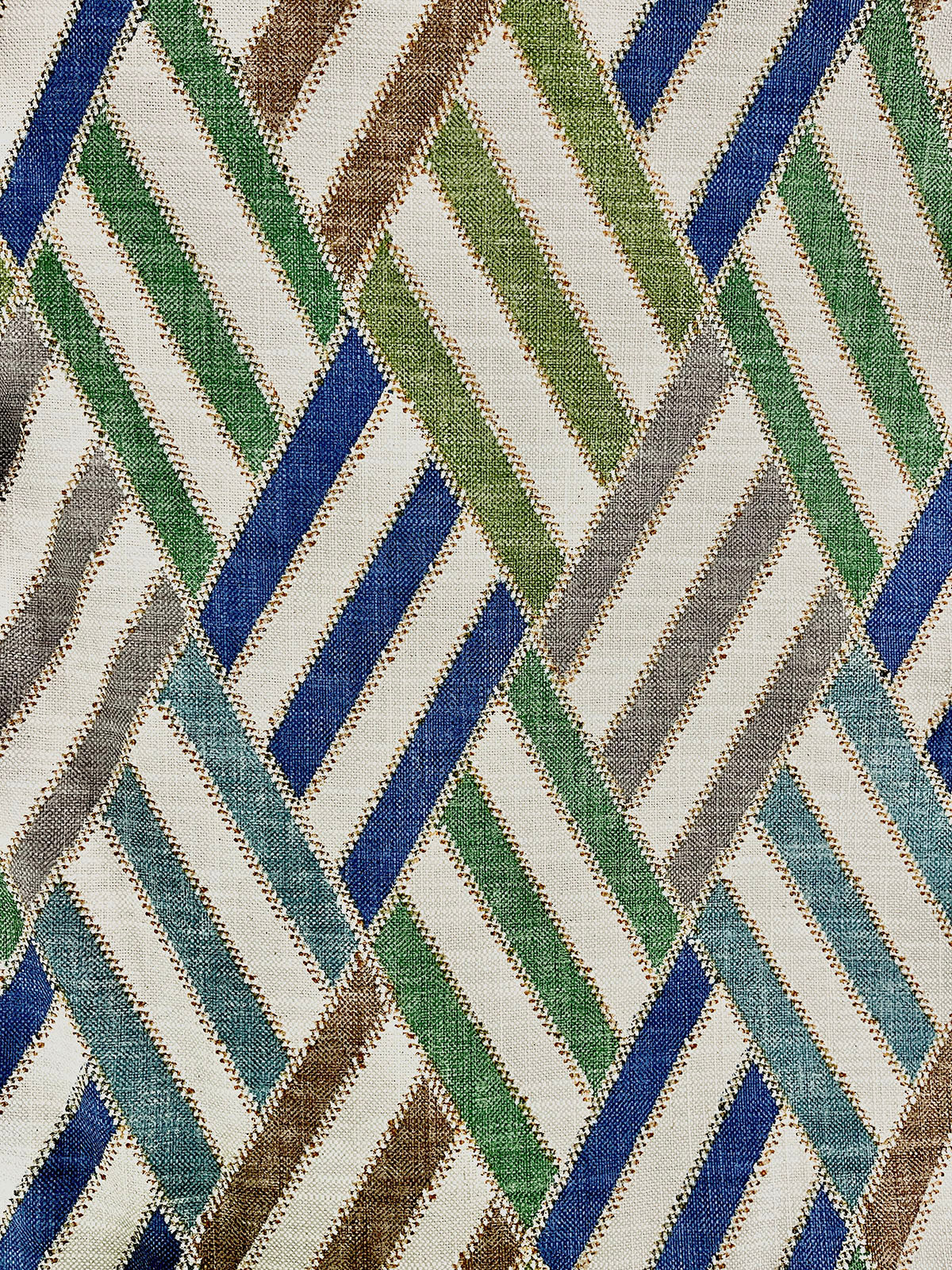 Entwine in the color Lapis is an Embroidered Look Chevrons, 55" wide, 75% Cotton 25% Linen, Repeats: H=.13.5" V=25.25" Double Rubs: 30,000