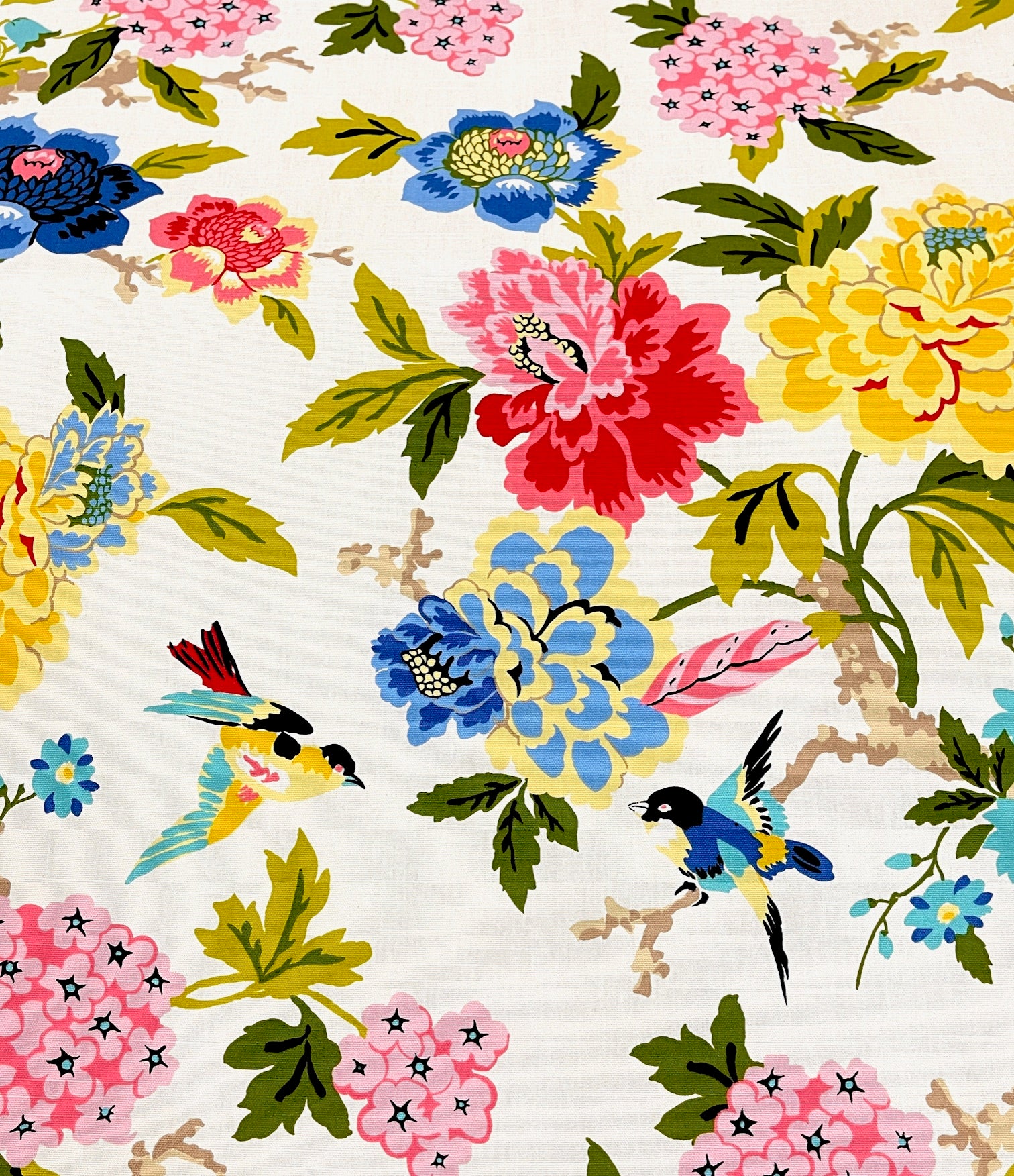 Celeste in color Spring is a Floral & Bird Print, 54" wide, 100% Cotton, Repeats: V=25.25" H=27", Double Rubs: 51,000