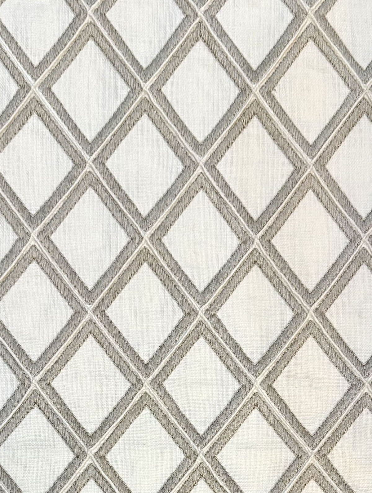 Enhancer in the color Linen is an Embroidered Diamond, 51.5" Wide, 100% Cotton, Repeats: H=3" V=3.5" Double Rubs: Exceeds 30,000