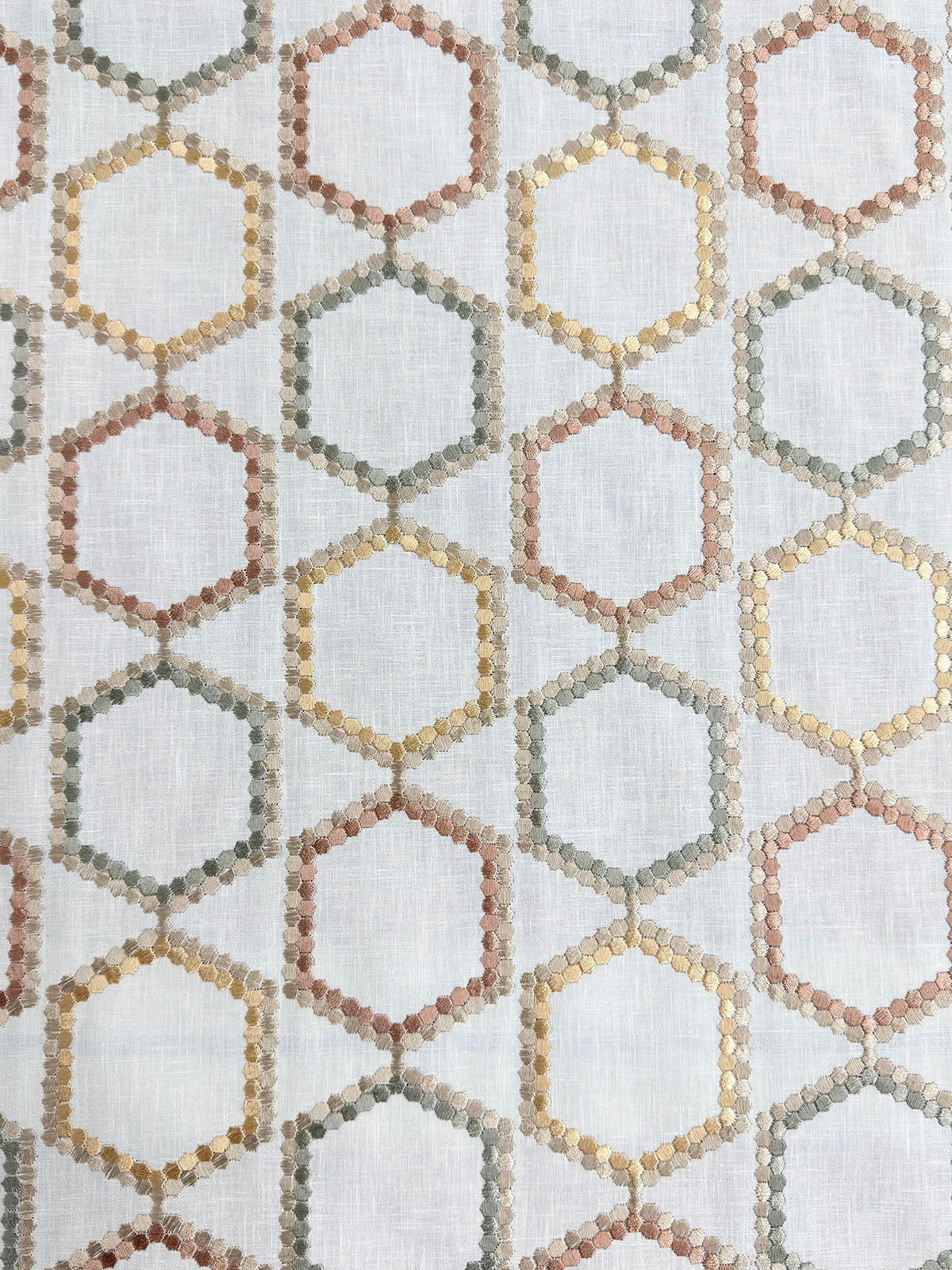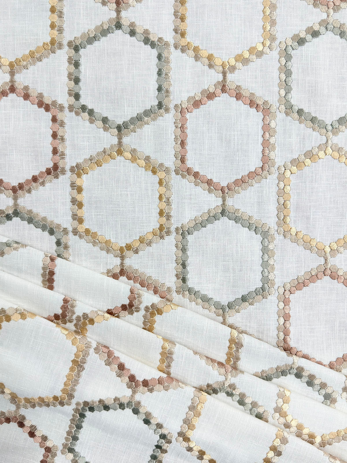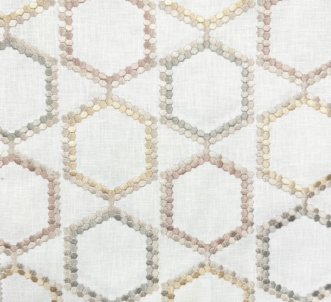 Intelligencer in color Potpourri is a Embroidered Hexagon in blush, sage and light gold colors. 54" Wide, Base 52% Cotton 48% Poly Emb: 100% Rayon, Repeats: H=7.25" V=12.375" Double Rubs: 6,000