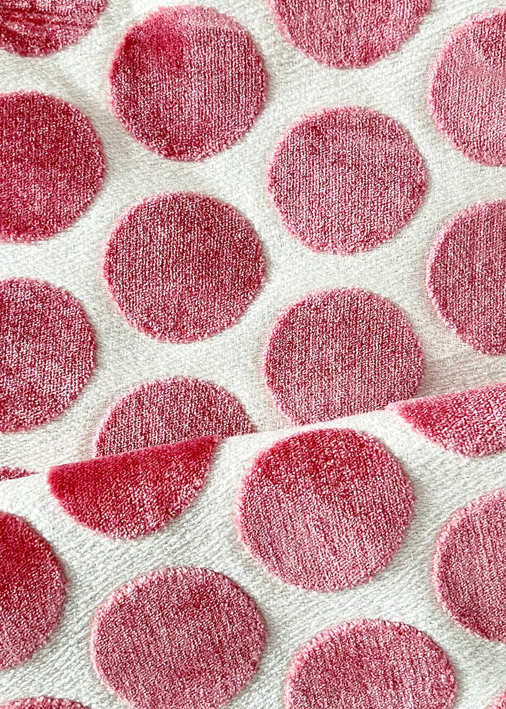 Cut Velvet Dot, 57.5" wide , 86% Viscose 14% Poly, Repeats: H= 3.5" 2.2" Double Rubs 18,000. UFAC CLASS I /CAL-117-2013 PASS