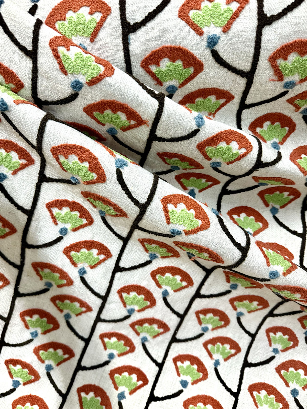 K-Luca in the color Spice is a Crewel Embroidered Fan, 54" Wide, 66% Poly 4% Linen 30% Acrylic, Repeats: H=5" V=4" Double Rubs: 30,000 UFAC Class I/Cal-117-2013 Pass