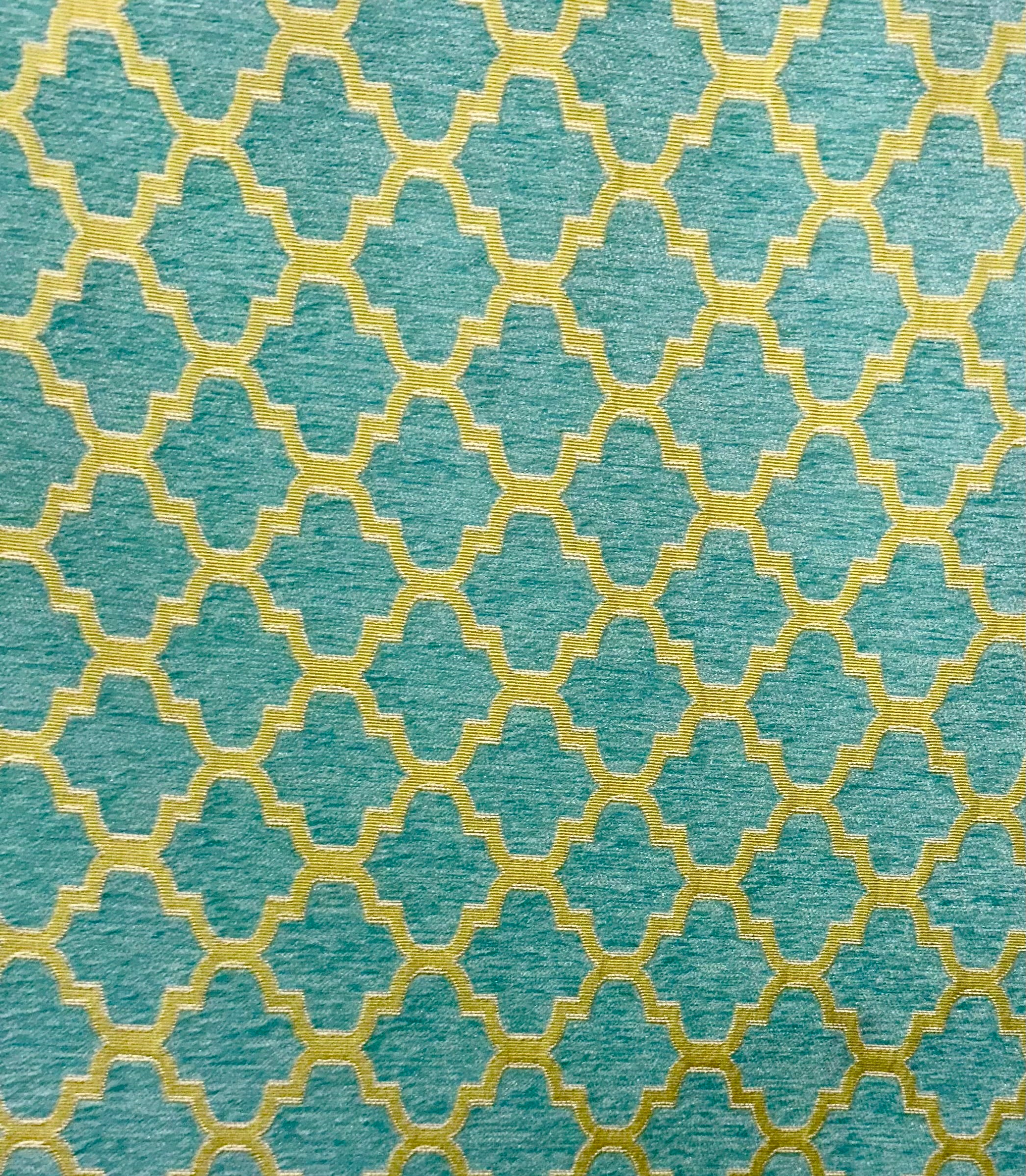 Keaton 523 is in color Caribbean and is a Chenille Quatrafoil, 54" Wide, 100% Polyester, Repeats: H=2.5"" V=2.5" Double Rubs: 35,000